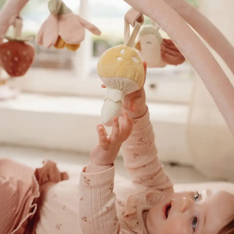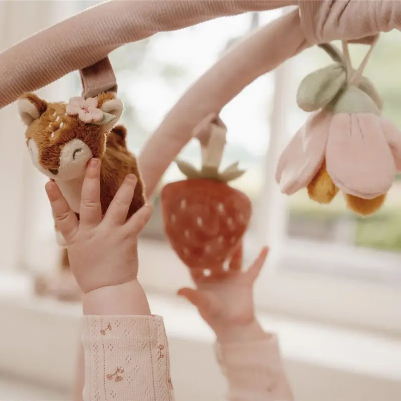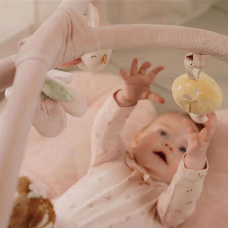Los juguetes son extraíbles, por lo que el bebé también puede jugar con ellos, y, además, cada uno estimula al bebé de una forma distinta: dos sonajeros, un juguete crujiente, un pequeño espejo y un juguete que chilla al apretarlo. Los arcos también son extraíbles, quedando una preciosa alfombra de juegos.