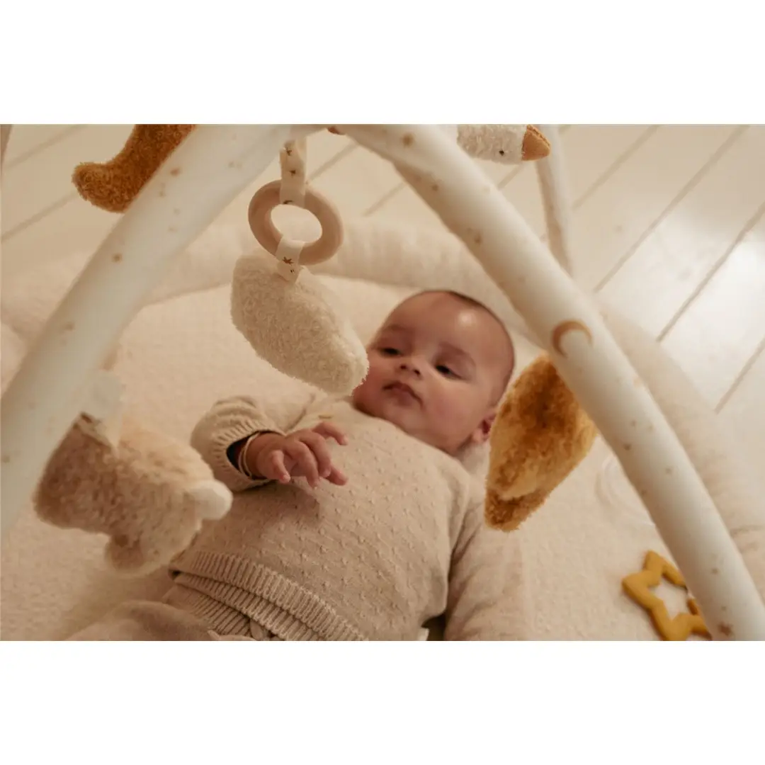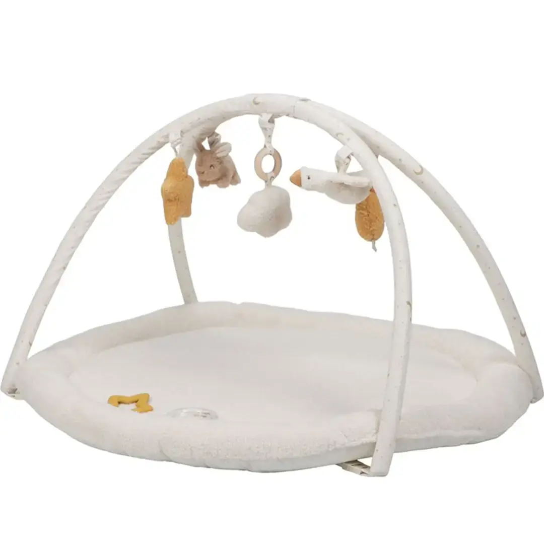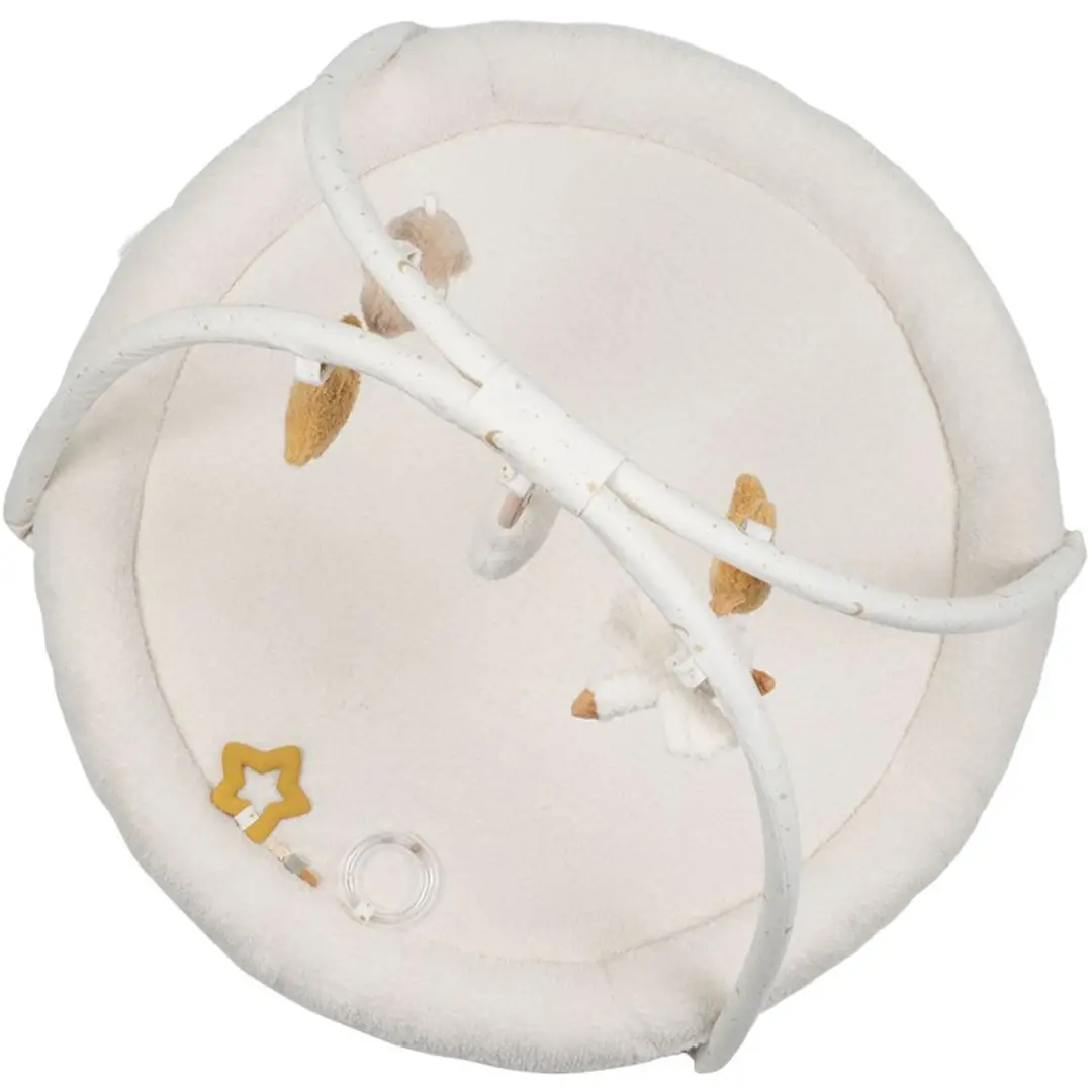 Los juguetes son extraíbles, por lo que el bebé también puede jugar con ellos, y, además, cada uno estimula al bebé de una forma distinta: dos sonajeros, un juguete crujiente, un pequeño espejo y un juguete que chilla al apretarlo. Los arcos también son extraíbles, quedando una preciosa alfombra de juegos.