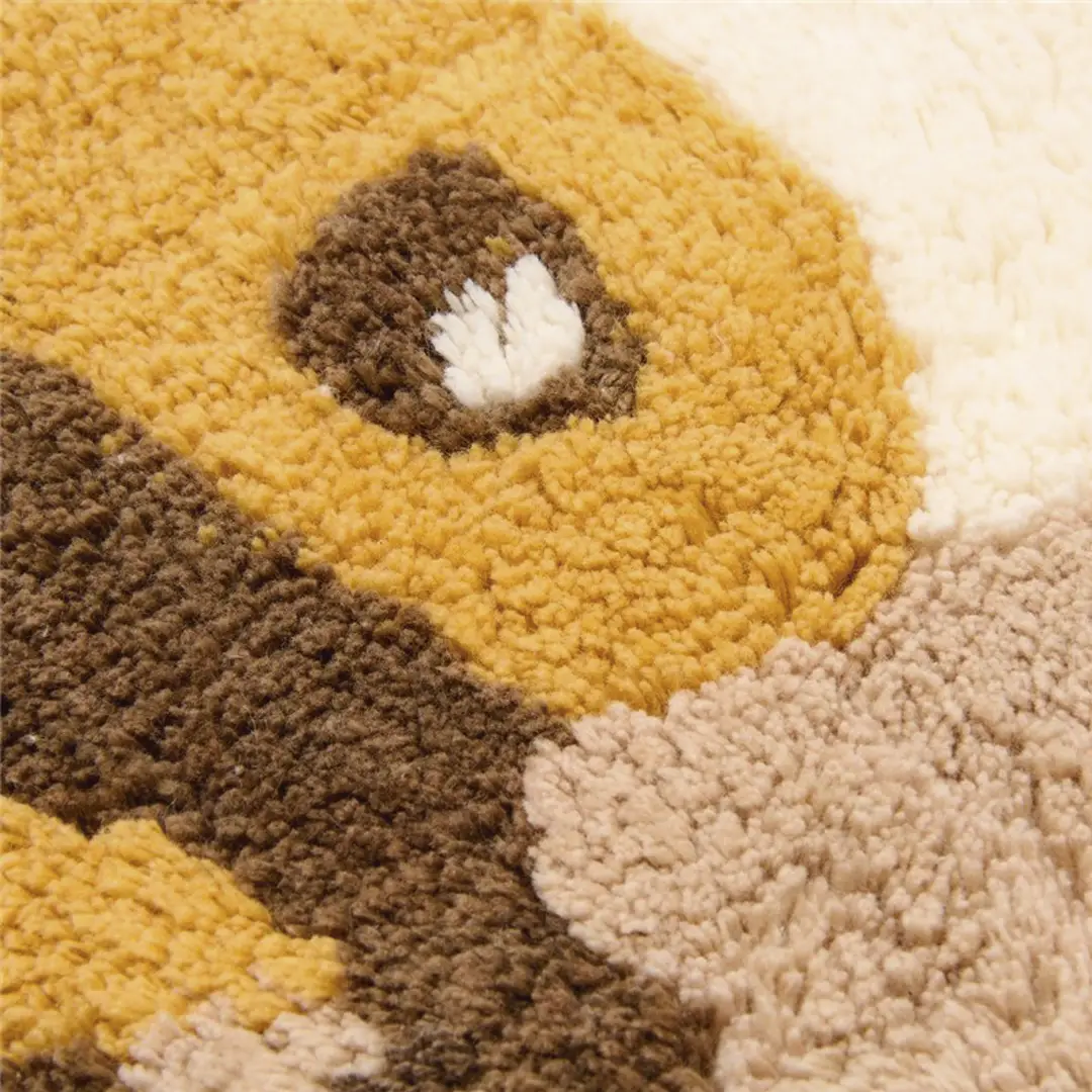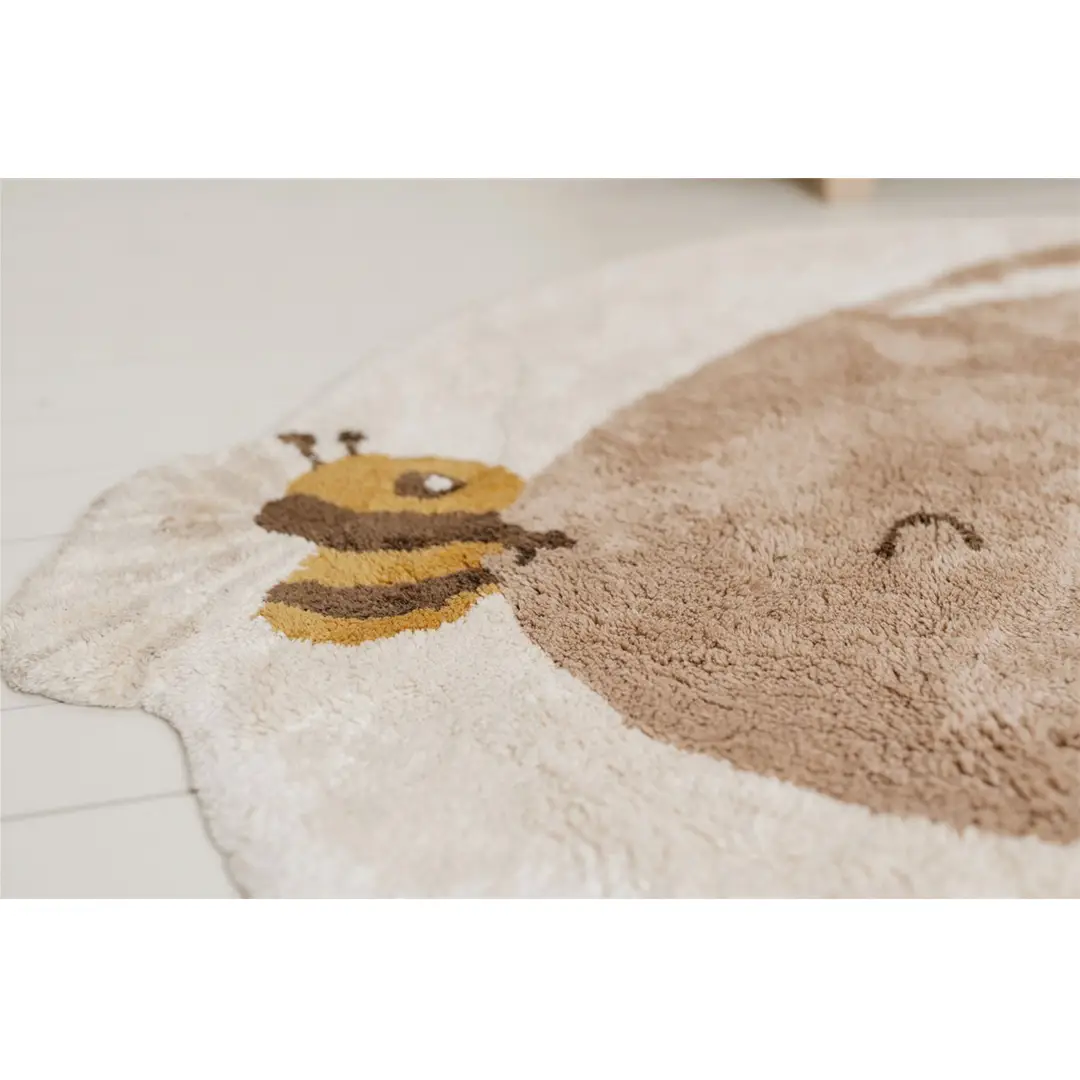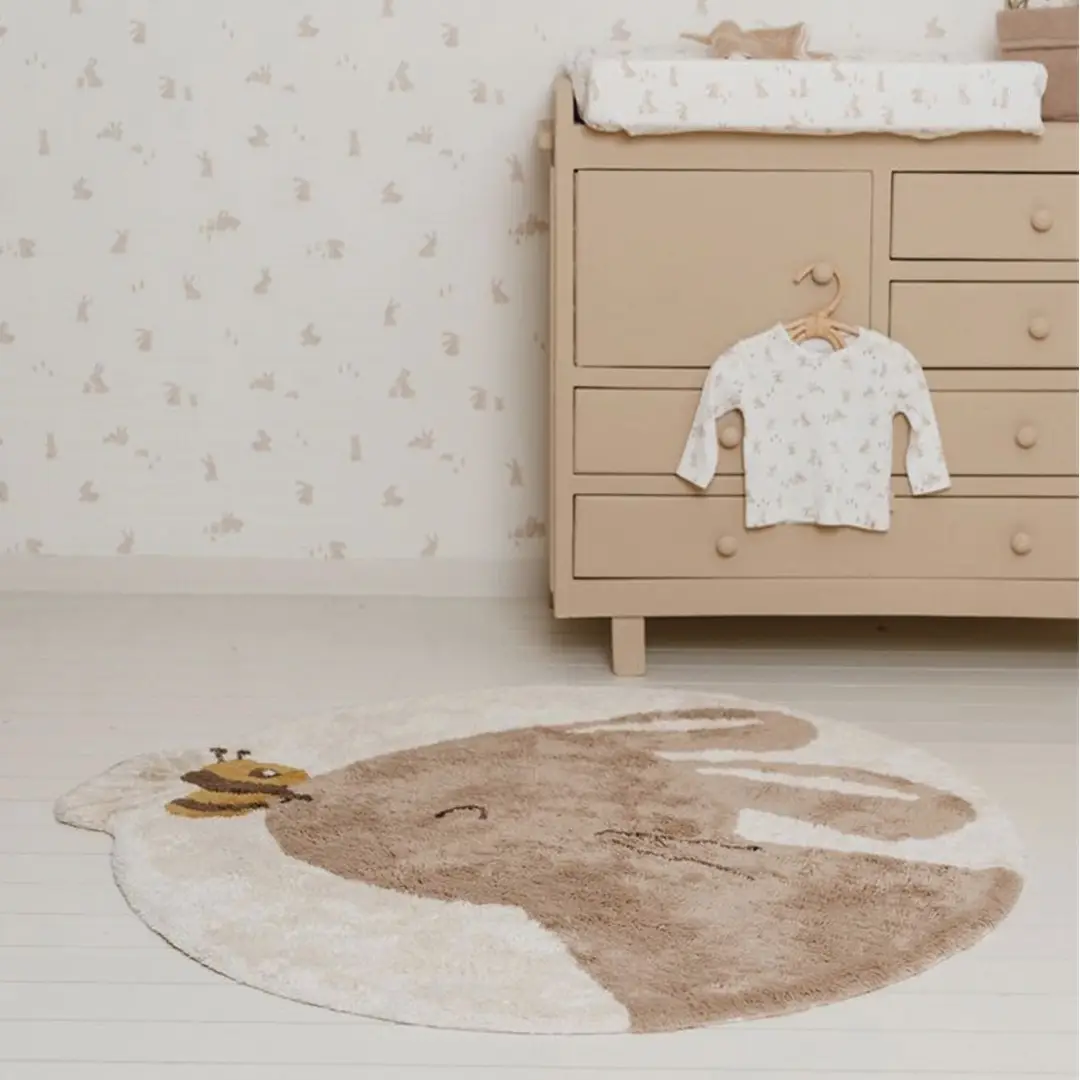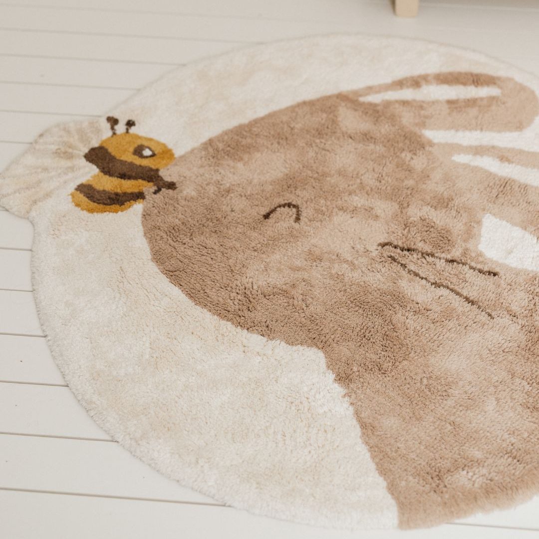 Alfombra redonda con un adorable conejo que tiene una simpática abeja en la nariz. La alfombra aportará un ambiente cálido, alegre y acogedor a la habitación.