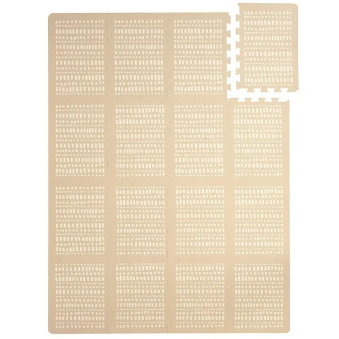 La alfombra de juegos puzzle consta de 16 piezas rectangulares de 44 x 32 cm con bordes laterales conectados. Es perfecta para gatear y jugar cómodamente e incluso para usar al aire libre.