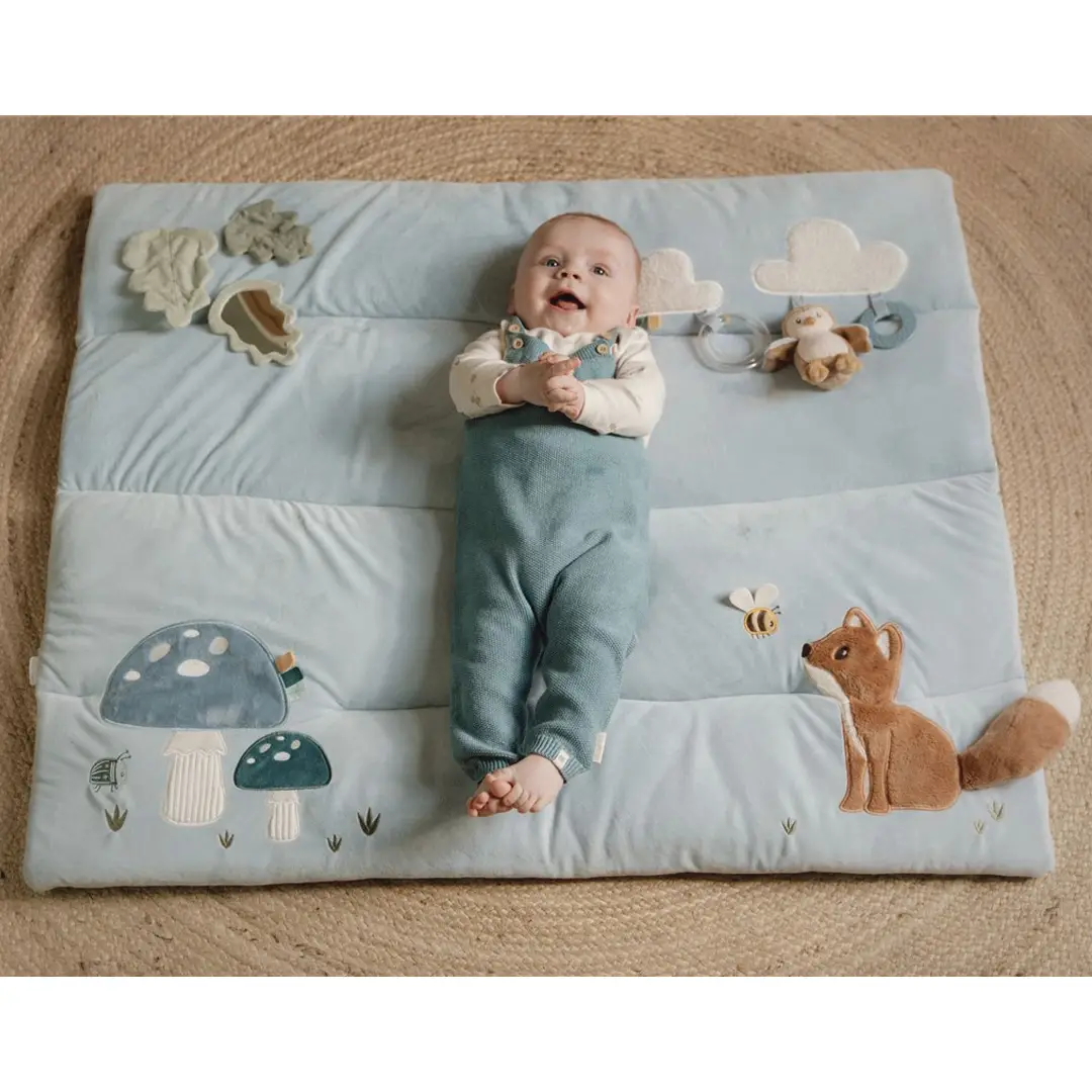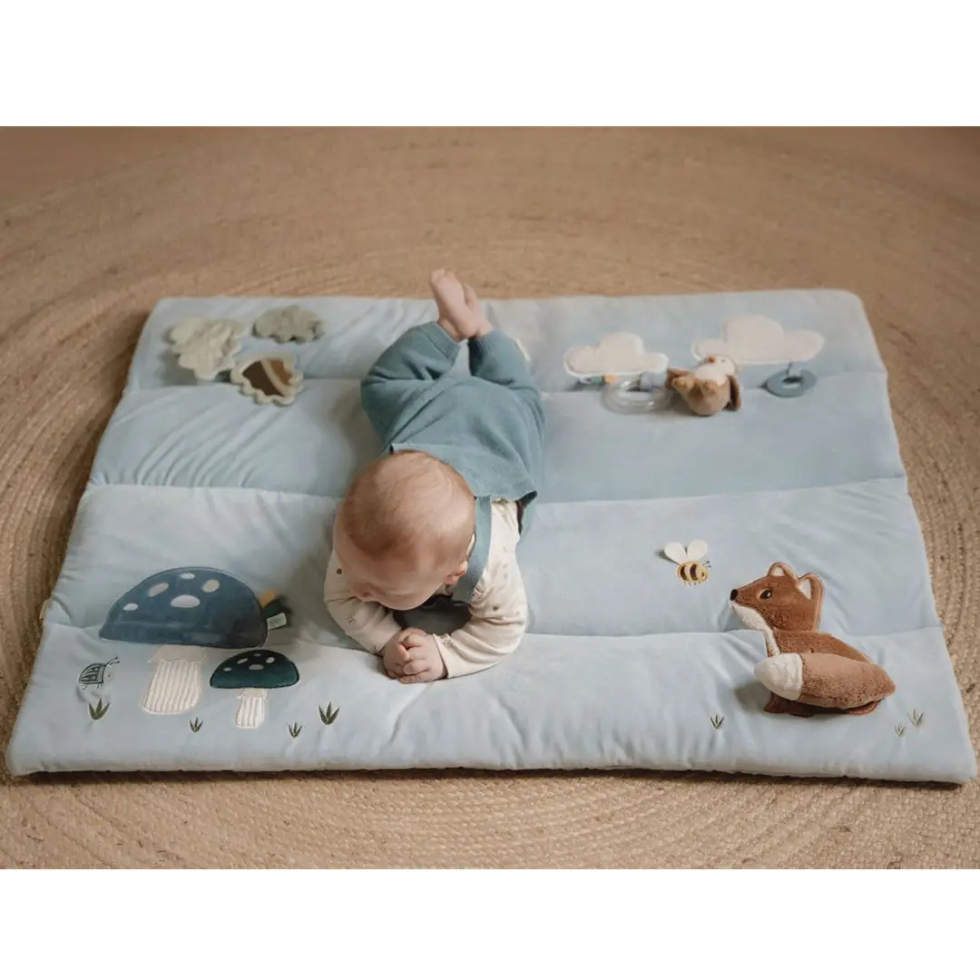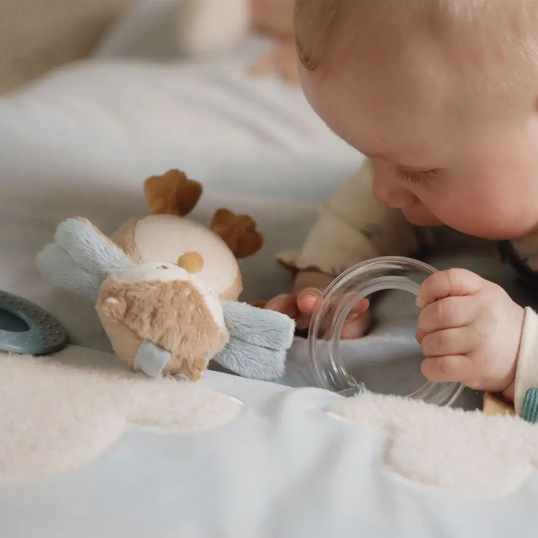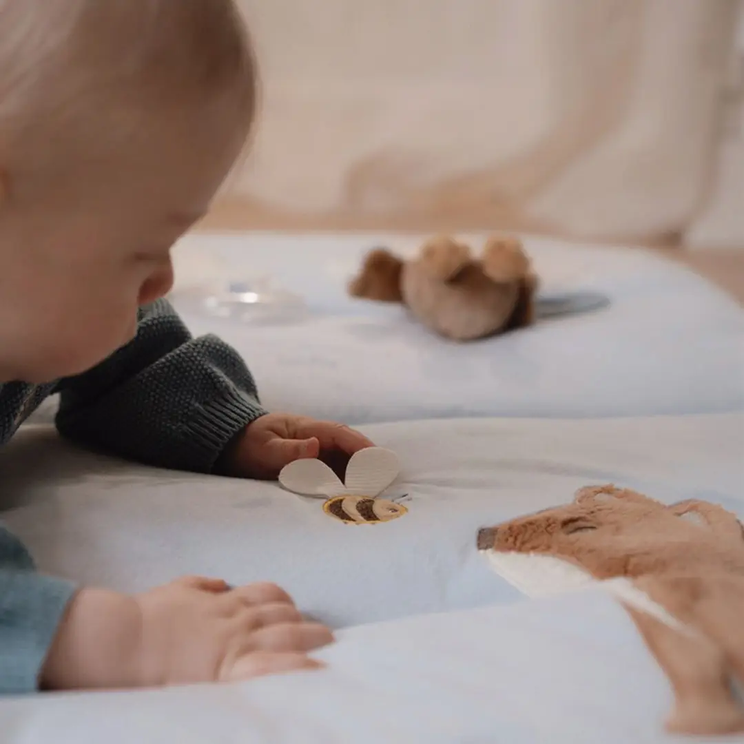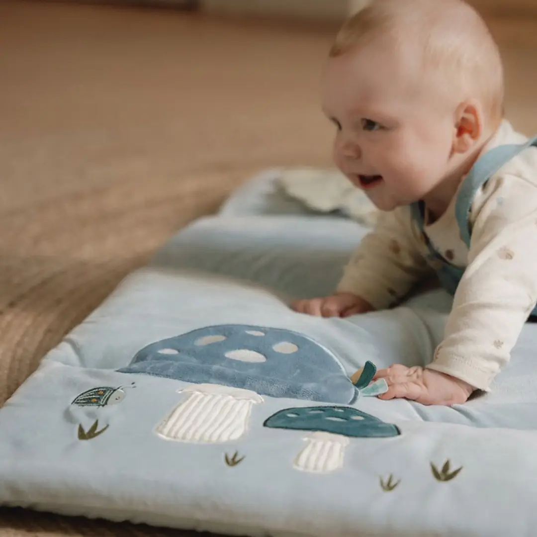 En esta suave y acolchada alfombra los bebés no tendrán tiempo para aburrirse gracias a las diferentes texturas y actividades que estimularán su desarrollo sensorial: la hoja crujiente, el espejo, las suaves nubes, el anillo transparente con cuentas que suenan al moverse, varias etiquetas para explorar, el mordedor, los animalitos… ¡Mucho por descubrir!