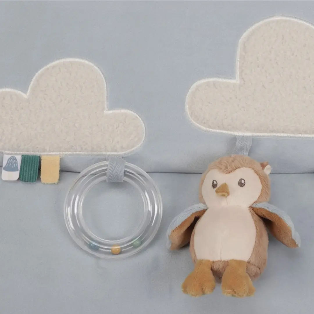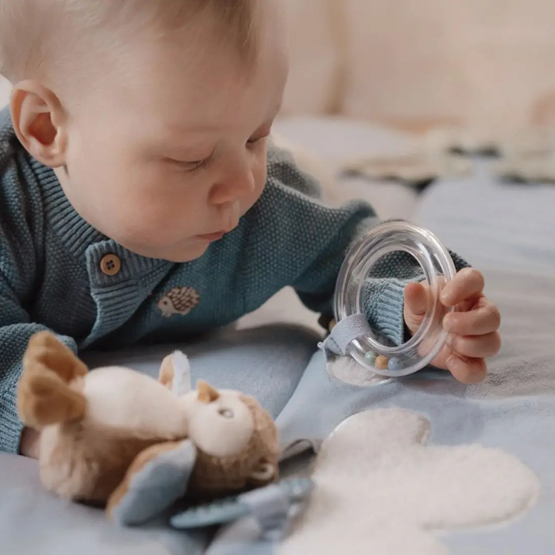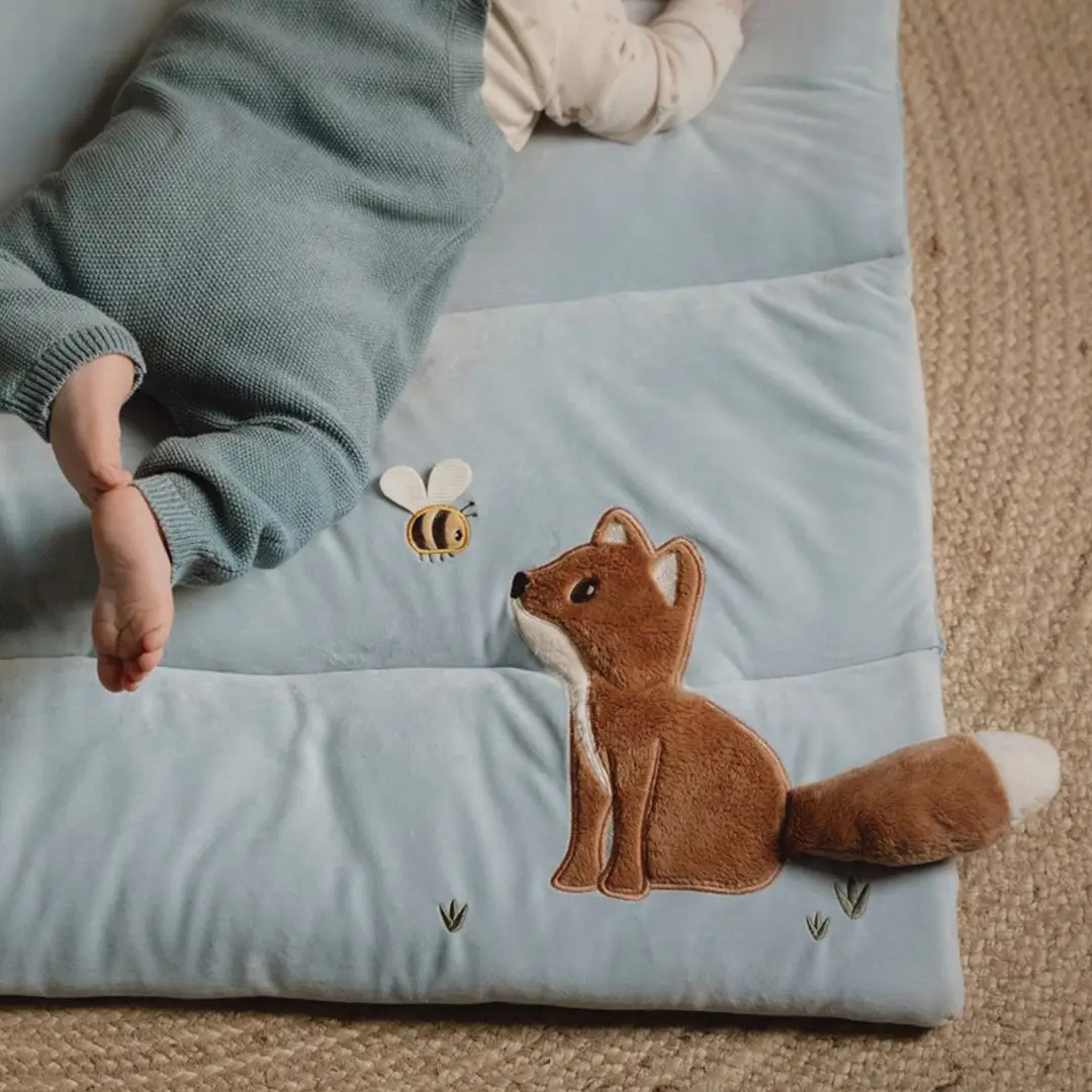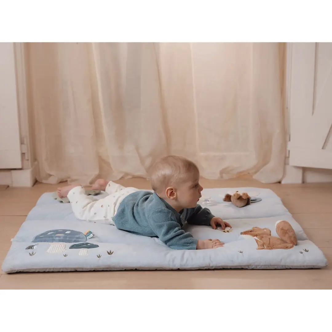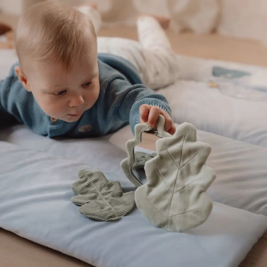 En esta suave y acolchada alfombra los bebés no tendrán tiempo para aburrirse gracias a las diferentes texturas y actividades que estimularán su desarrollo sensorial: la hoja crujiente, el espejo, las suaves nubes, el anillo transparente con cuentas que suenan al moverse, varias etiquetas para explorar, el mordedor, los animalitos… ¡Mucho por descubrir!