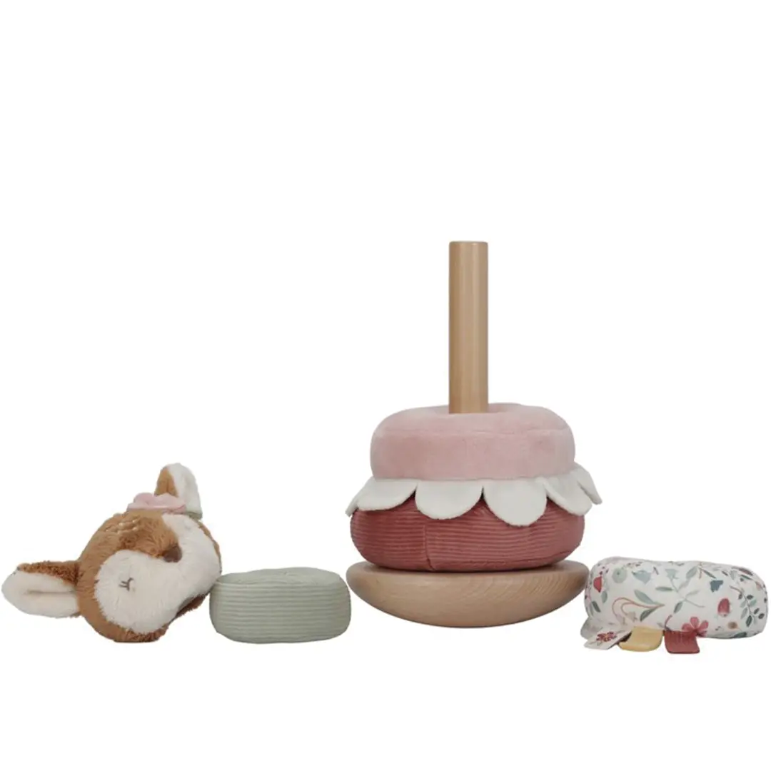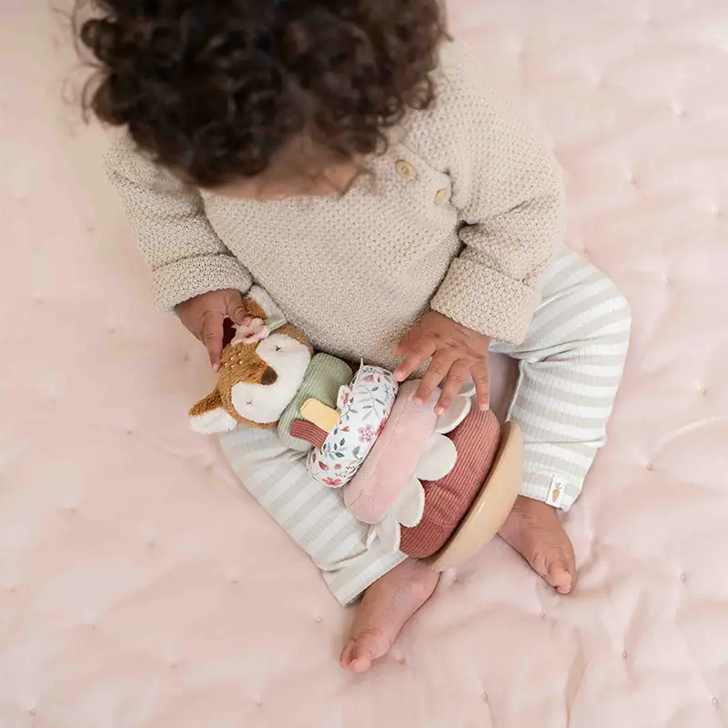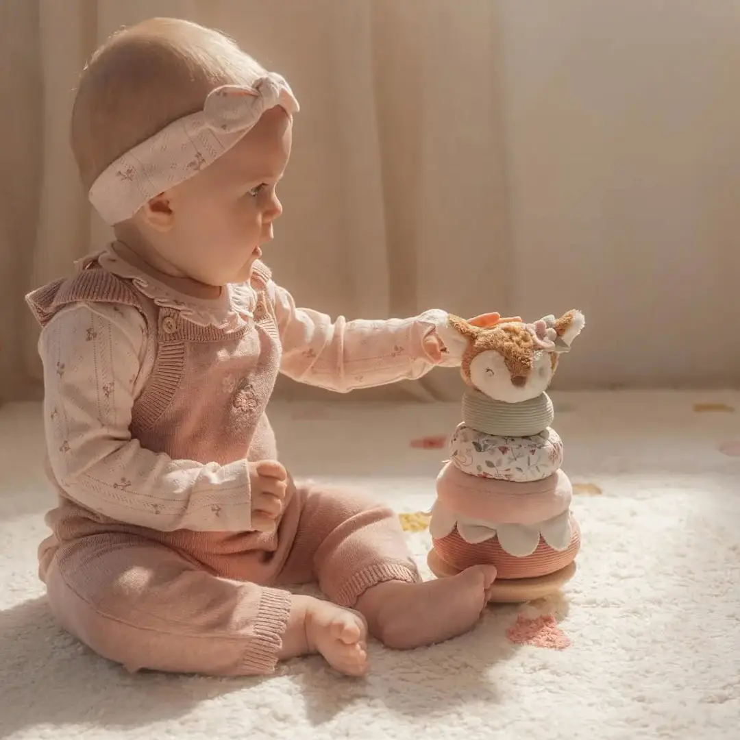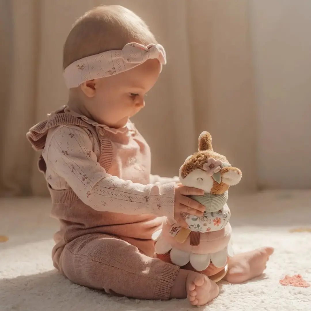 Los peques tienen que apilar los anillos en el orden correcto sobre una base de madera que se tambalea. Cuando la pirámide esté completa el adorable ciervo lo celebrará con un divertido baile.