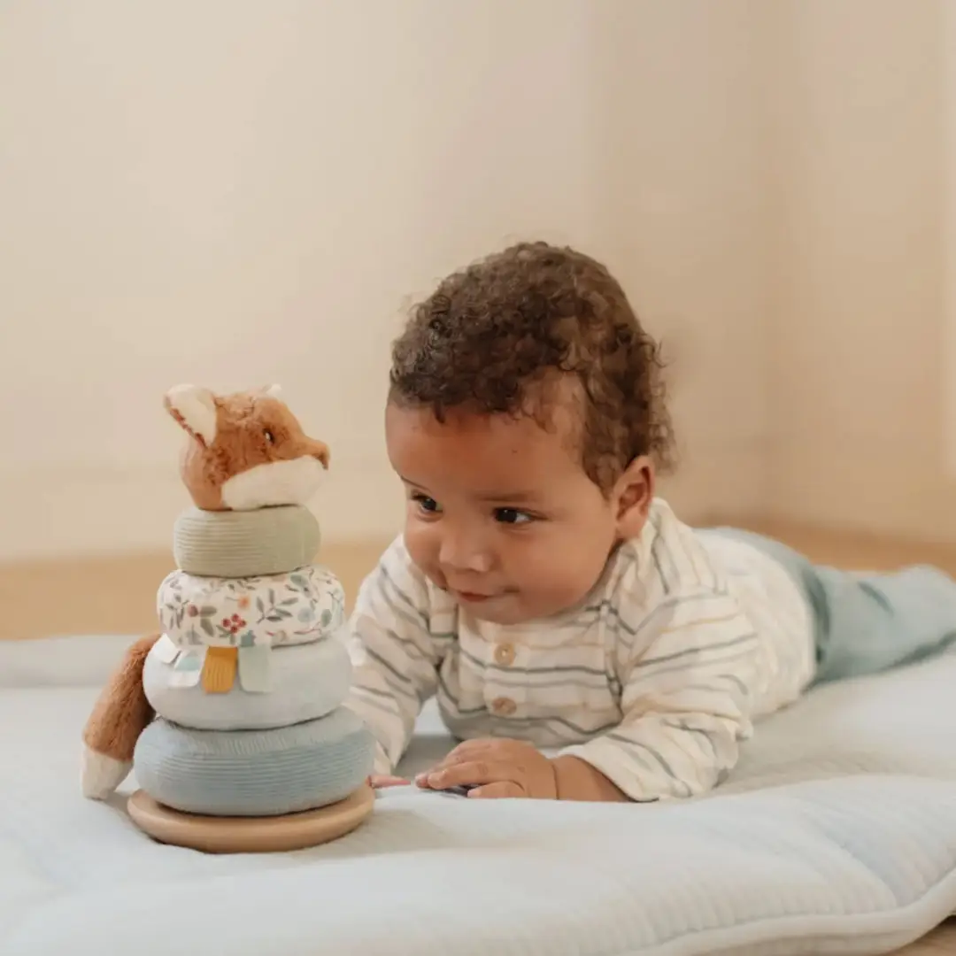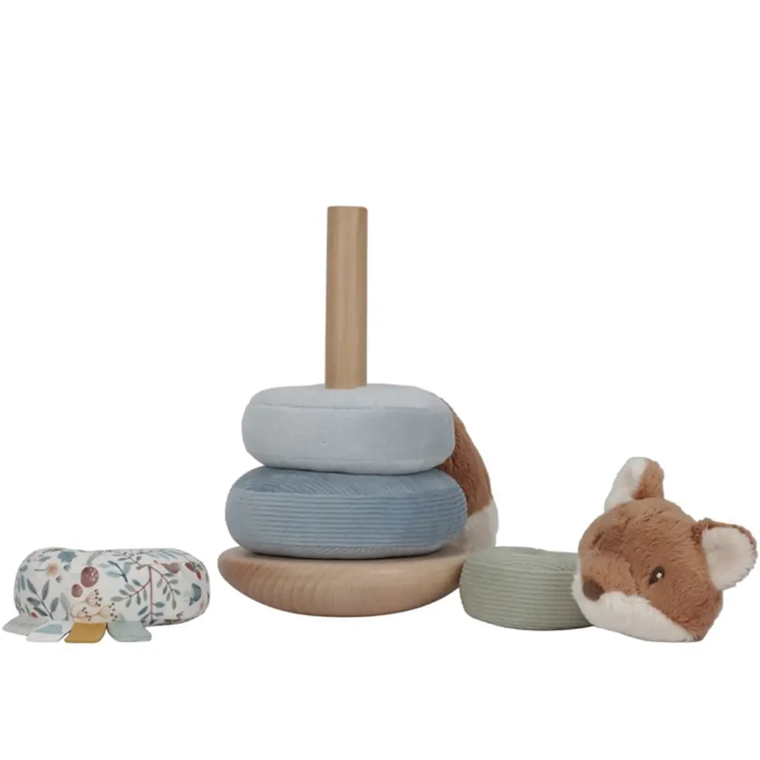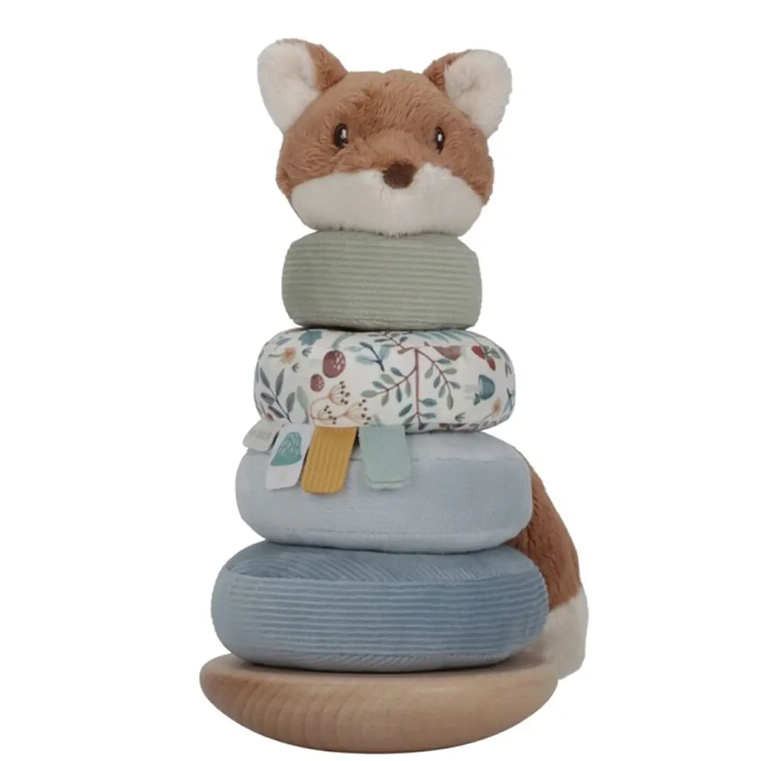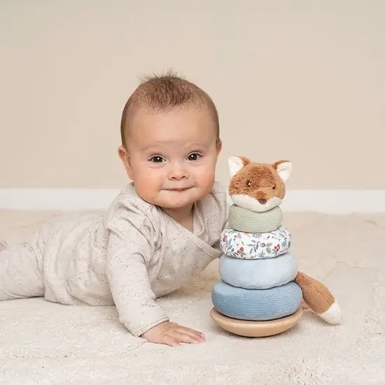 Los peques tienen que apilar los anillos en el orden correcto sobre una base de madera que se tambalea. Cuando la pirámide esté completa el adorable zorro lo celebrará con un divertido baile.