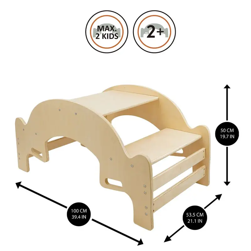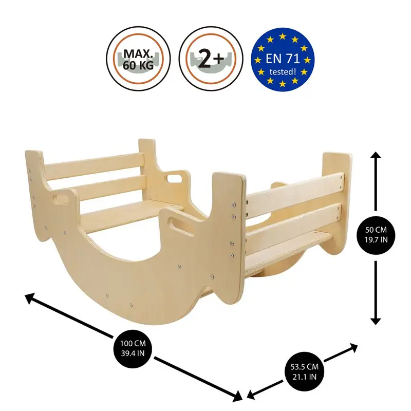 Estructura de madera de abedul contrachapada que por un lado es un divertido balancín con dos asientos y por el otro lado es una práctica mesa con dos sitios para sentarse. Soporta un peso máximo de 60 kgs.