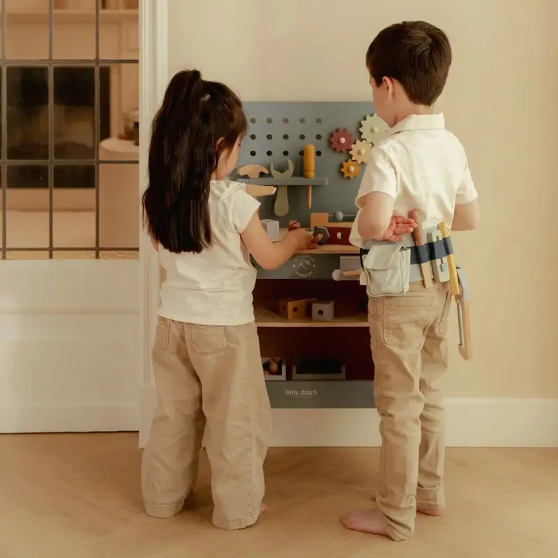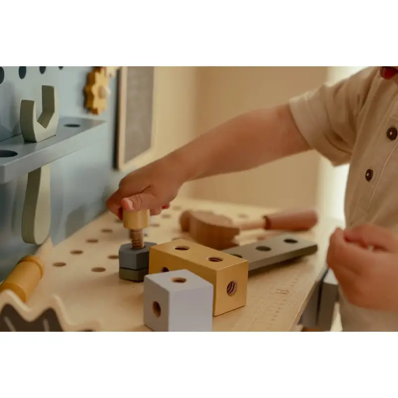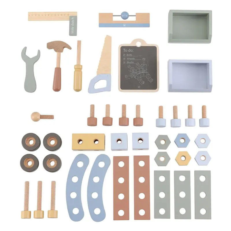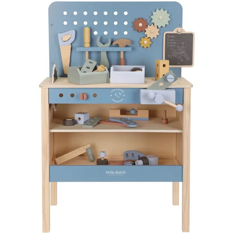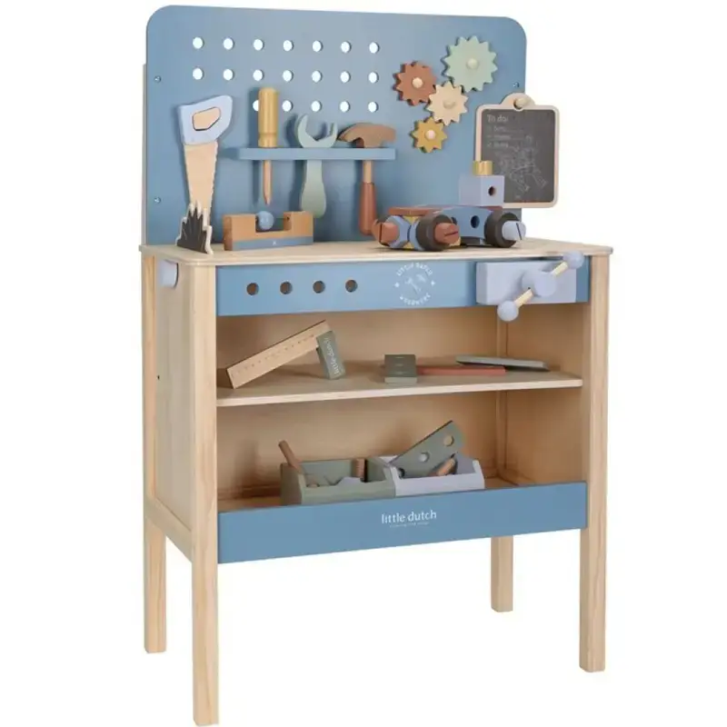 ¡Vamos a arreglarlo! Con este banco de trabajo los peques podrán arreglar y construir todo lo que se imaginen. Incluye 55 piezas como tornillos, tuercas, pernos, paneles, ruedas, además de las herramientas esenciales como martillo, sierra, destornillador, nivelador, regla y llave inglesa. También tiene un panel con 4 engranajes, una pizarra para hacer la lista de tareas, dos contenedores de almacenamiento y un tornillo de banco.