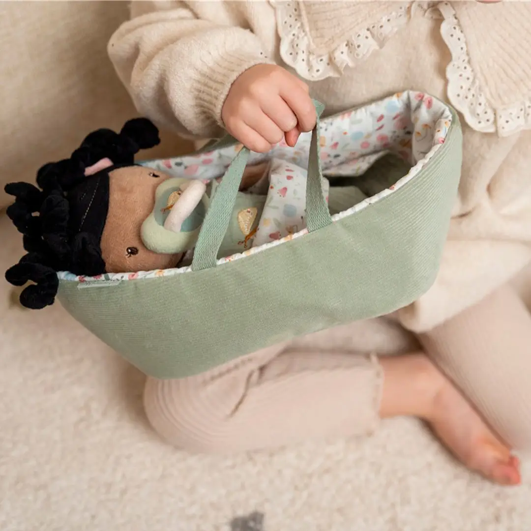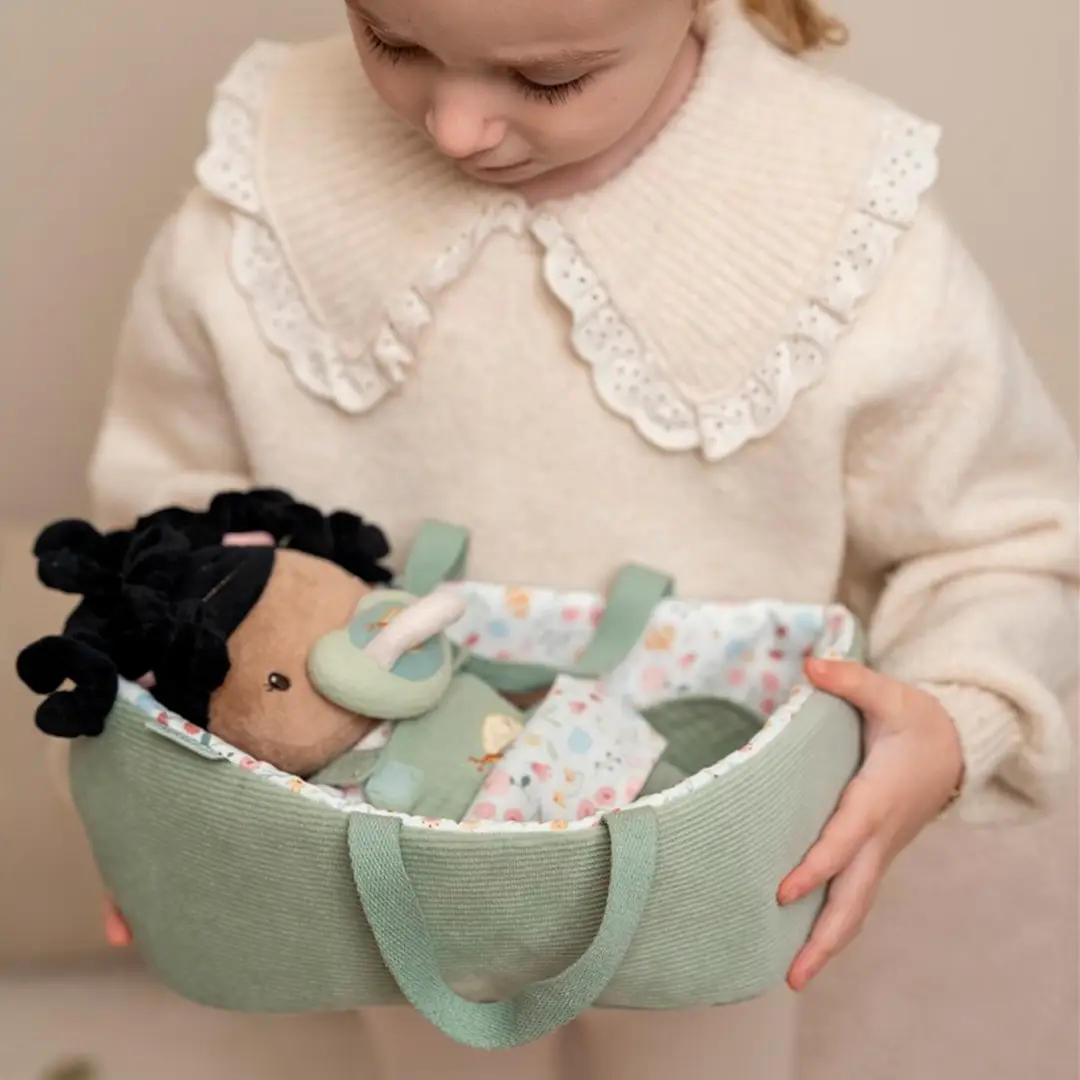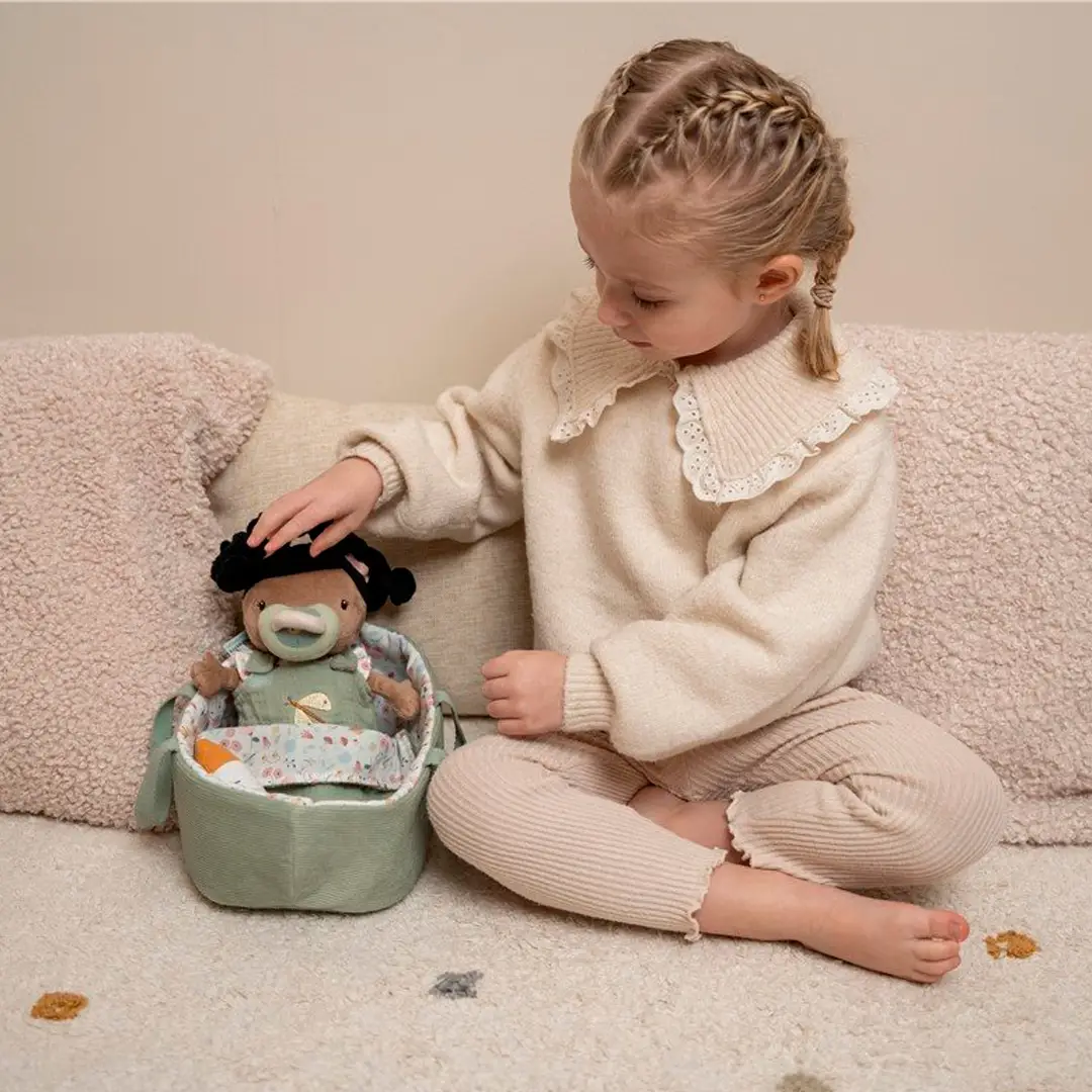 La bebé Evi es adorable, muy blandita y achuchable. Puedes darle un biberón o un chupete, cambiarle el pañal y arroparla debajo de una manta. También puede viajar fácilmente en su bonita cesta de viaje.