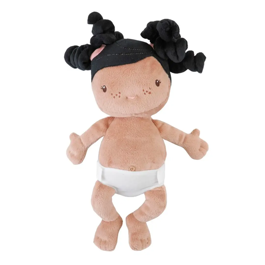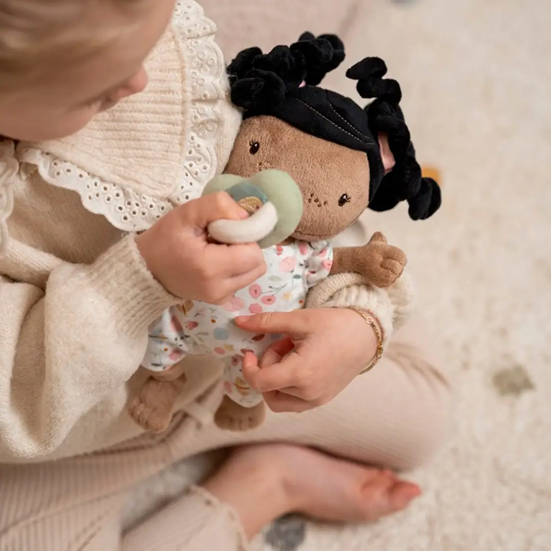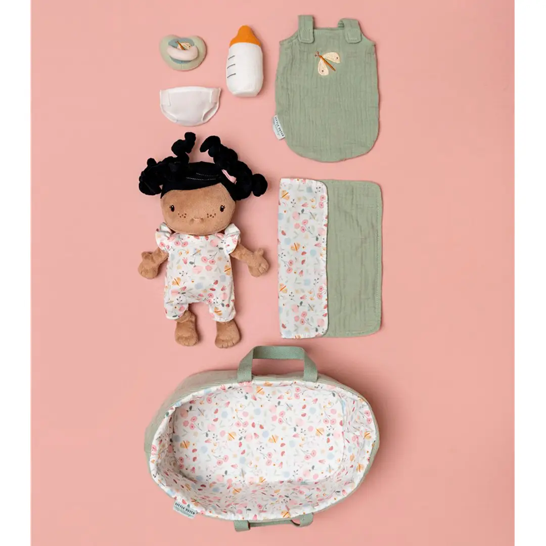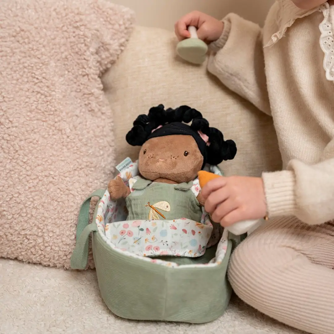 La bebé Evi es adorable, muy blandita y achuchable. Puedes darle un biberón o un chupete, cambiarle el pañal y arroparla debajo de una manta. También puede viajar fácilmente en su bonita cesta de viaje.