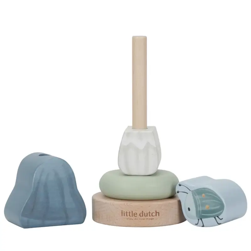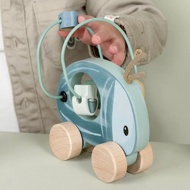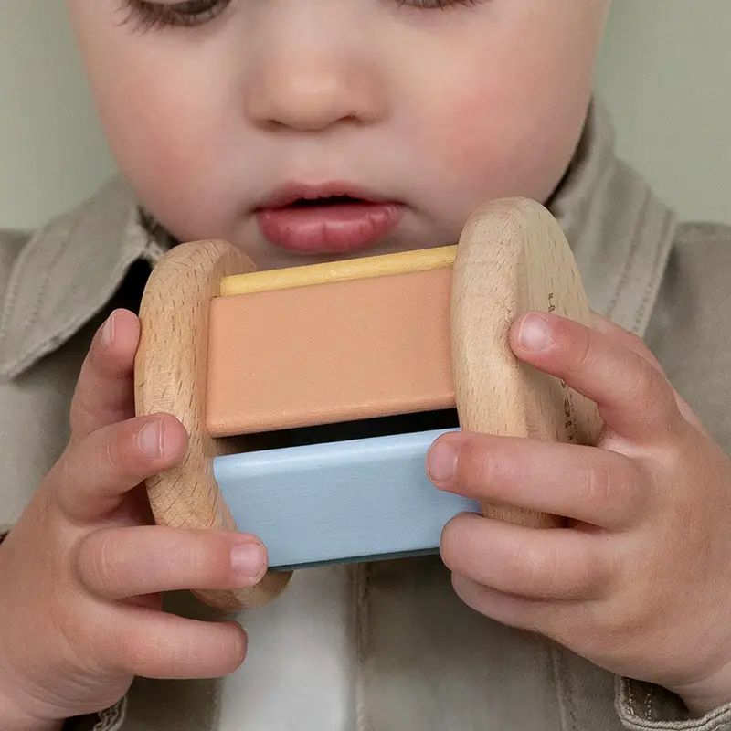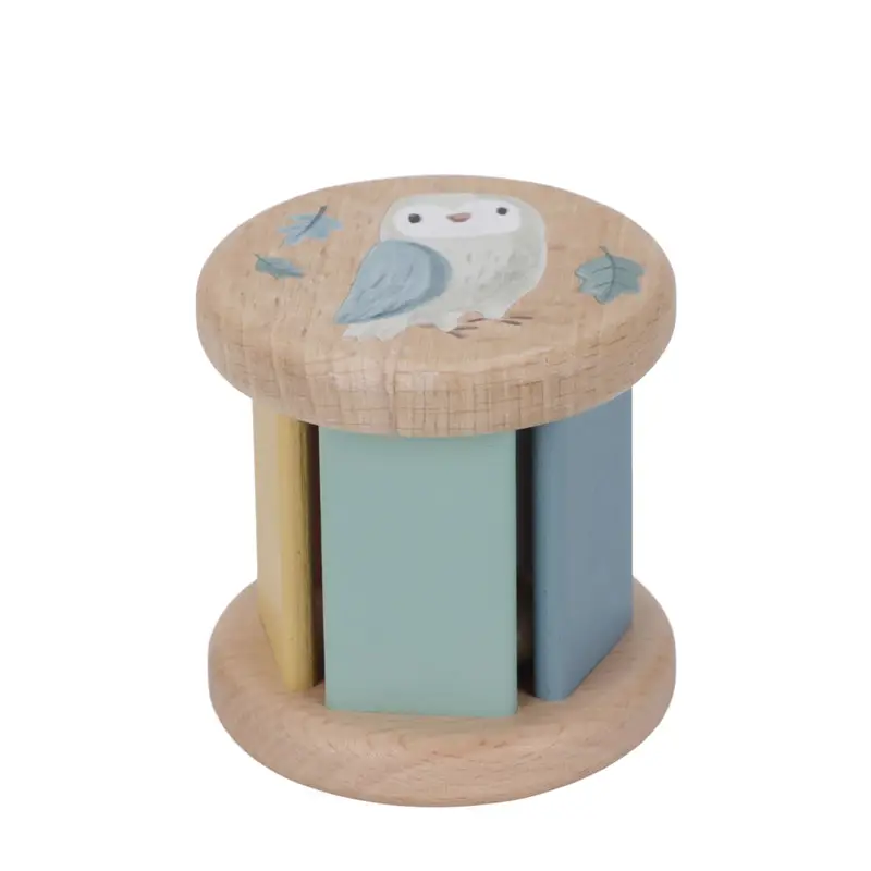 Esta caja contiene tres bonitos juguetes de madera diseñados para esos primeros momentos de juego y desarrollo: un sonajero rodante, un juguete apilable y un escarabajo con ruedas, adornado con una seta, una bellota y hojas para mover a lo largo de la espiral.
