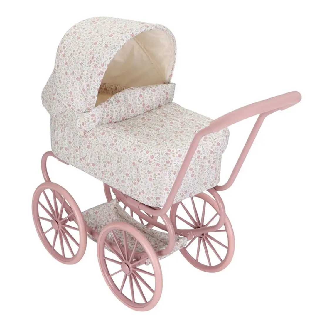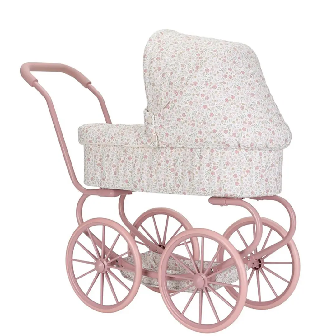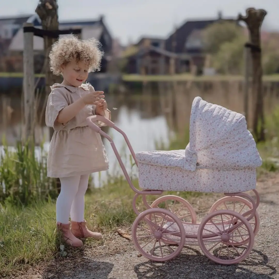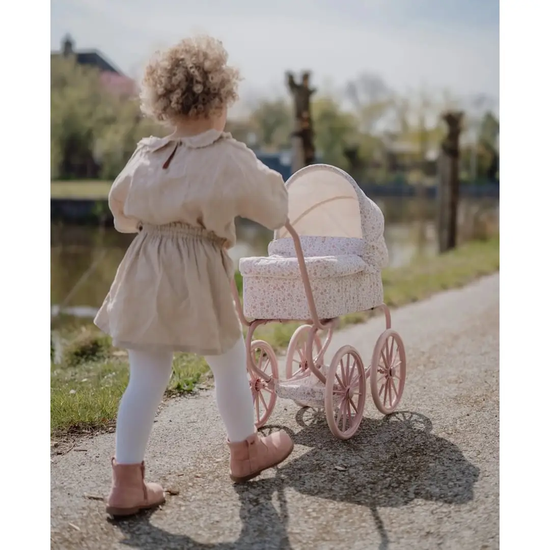 ¡Disfruta de encantadores paseos con este robusto cochecito de metal con una preciosa tela de flores! Gracias a sus cuatro ruedas grandes, este cochecito se mueve de forma suave y estable, perfecto tanto para interiores como para exteriores. En la parte inferior, encontrarás una práctica cesta para guardar los accesorios de tu muñeca/o y tenerlos siempre a mano. El armazón rosa y las suaves asas completan este elegante cochecito.