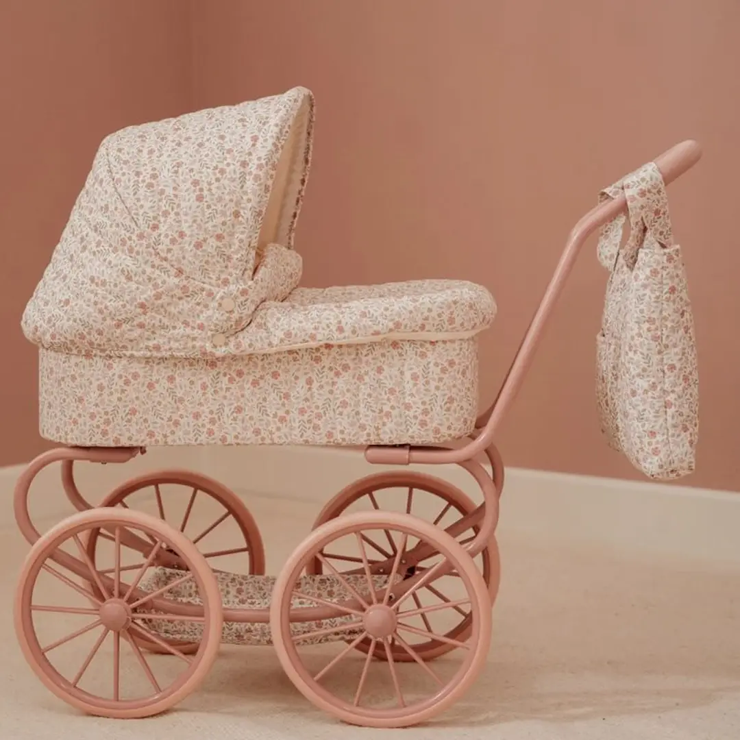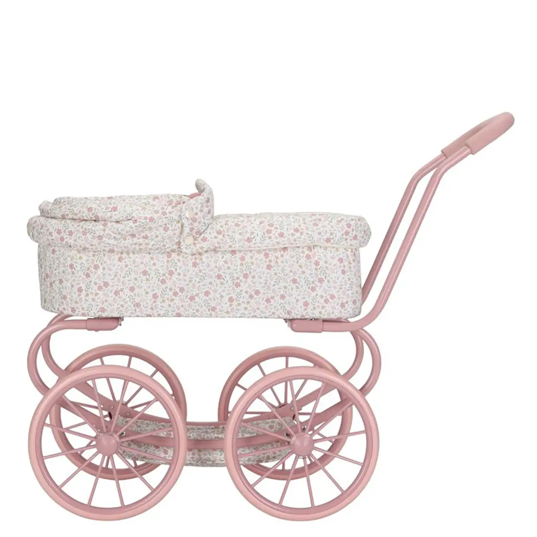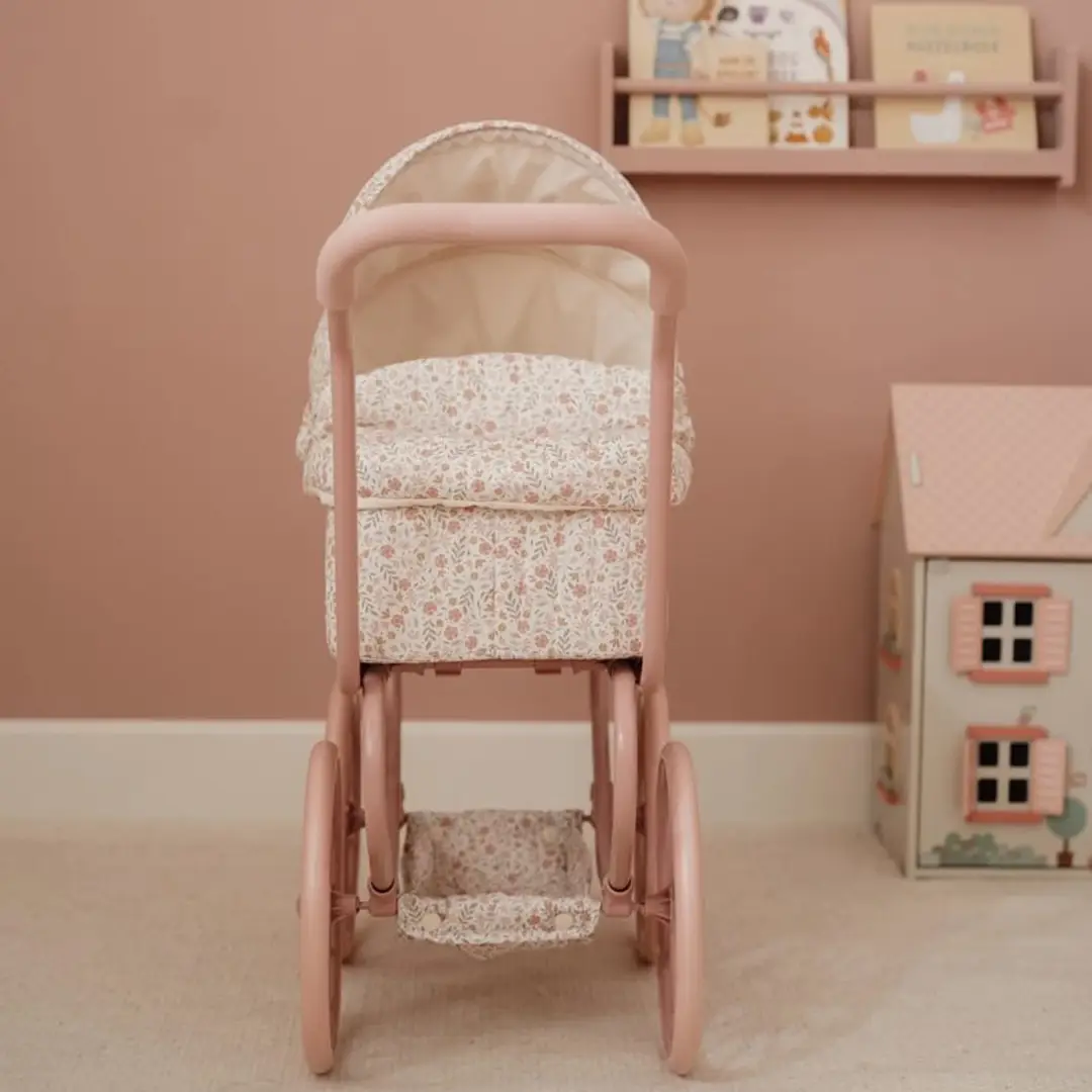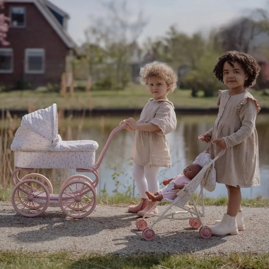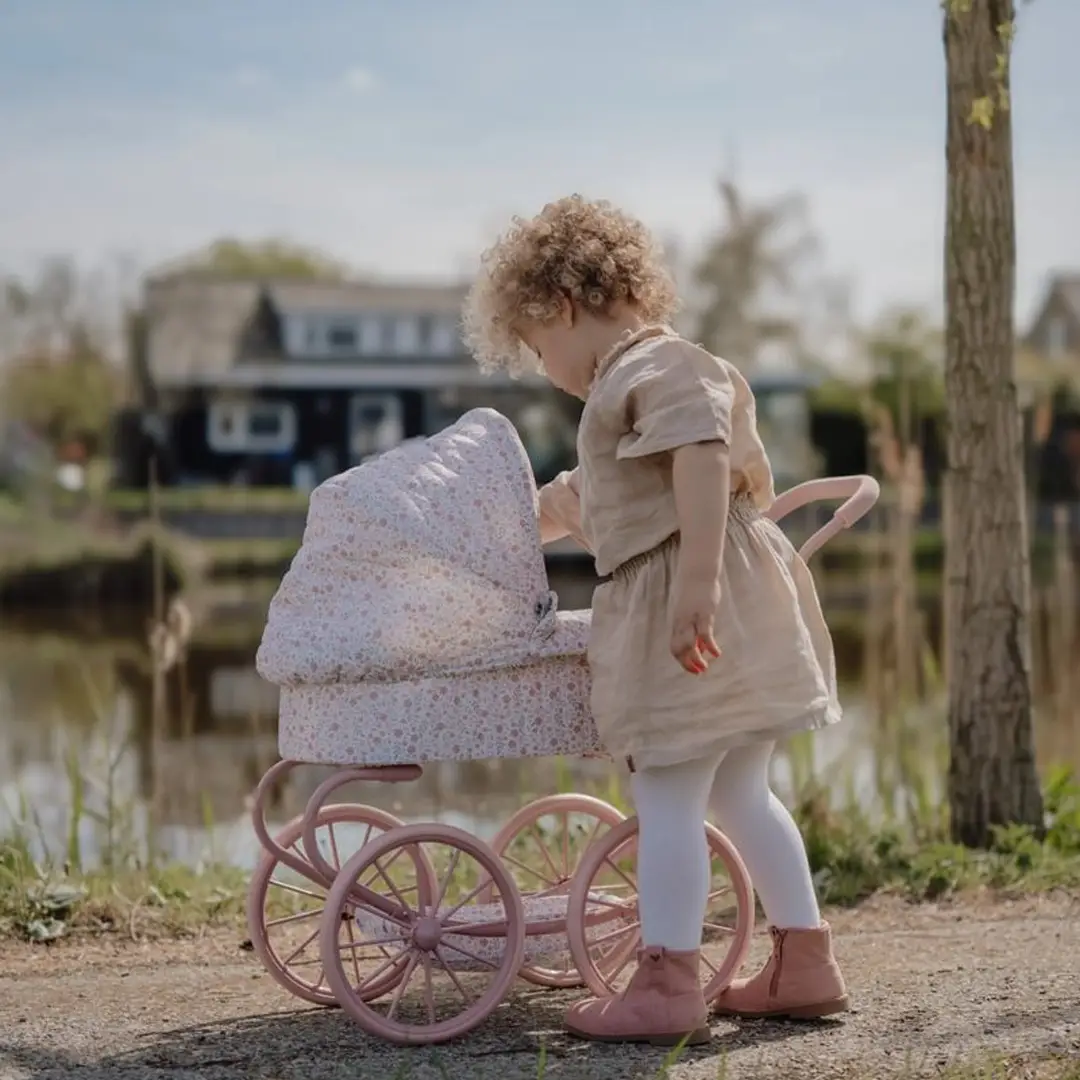 ¡Disfruta de encantadores paseos con este robusto cochecito de metal con una preciosa tela de flores! Gracias a sus cuatro ruedas grandes, este cochecito se mueve de forma suave y estable, perfecto tanto para interiores como para exteriores. En la parte inferior, encontrarás una práctica cesta para guardar los accesorios de tu muñeca/o y tenerlos siempre a mano. El armazón rosa y las suaves asas completan este elegante cochecito.