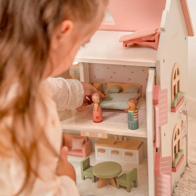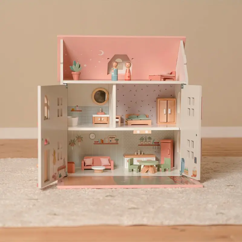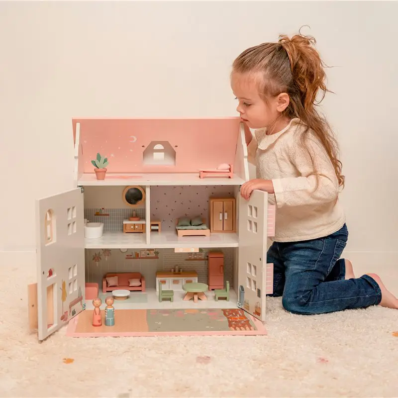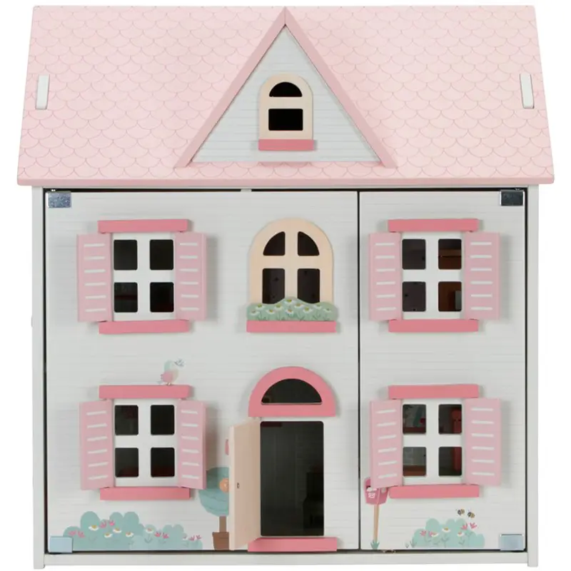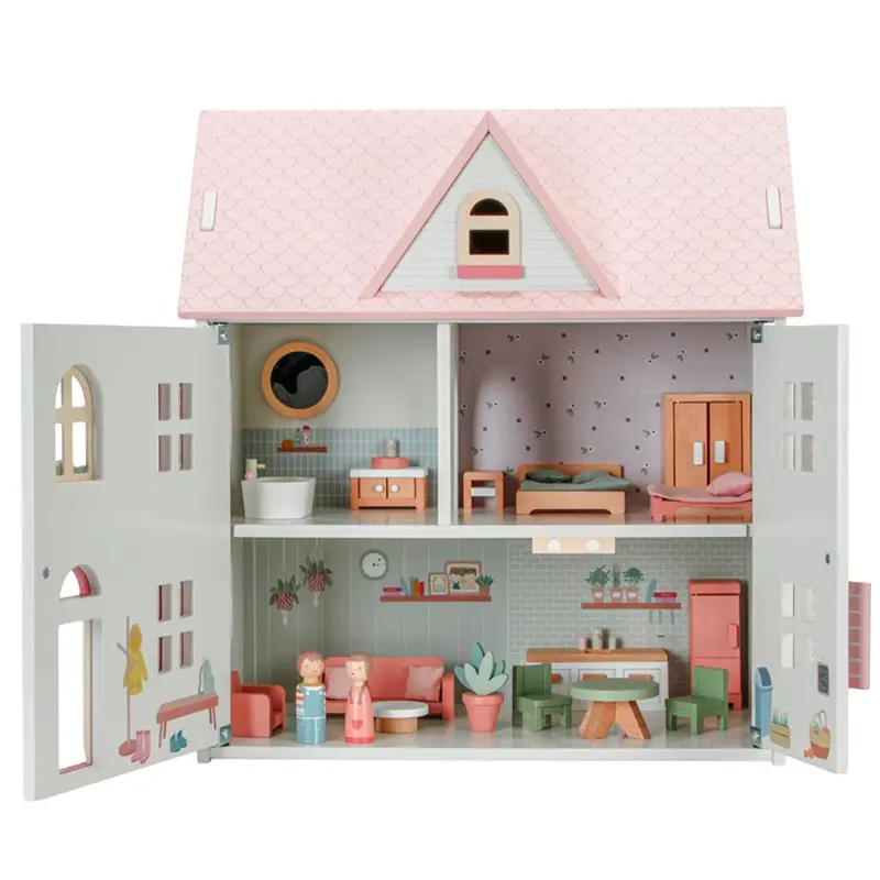 Esta casa de muñecas de madera es súper completa: tiene contraventanas que se pueden abrir y cerrar, el techo también se puede abrir para mayor diversión y, además, parte del techo se puede transformar en un jardín, el interior de la casa es muy detallado y presenta preciosas ilustraciones, tanto por dentro como por fuera, tiene sala, cocina, baño y dos dormitorios y cada habitación está amueblada con muebles y accesorios a juego. Incluye a los muñecos Jim y Rosa para que los peques puedan empezar a jugar inmediatamente.