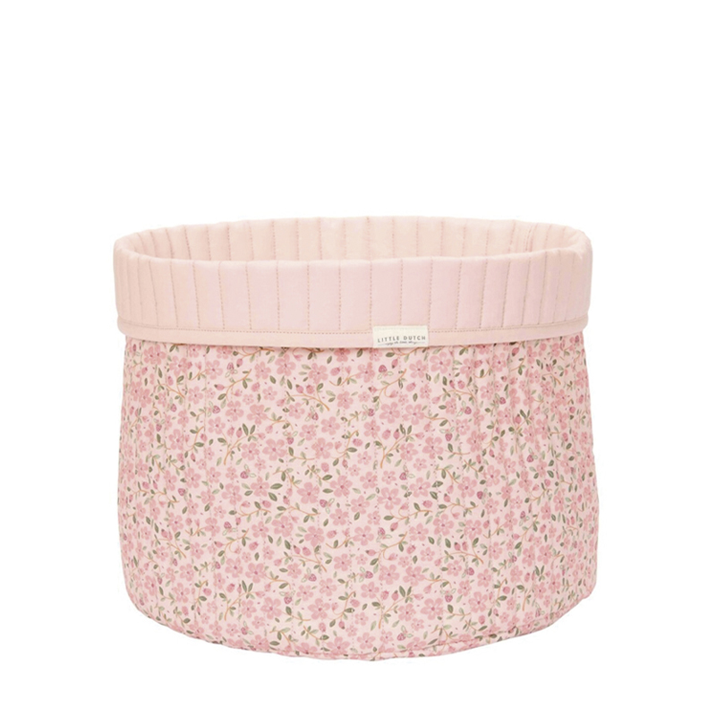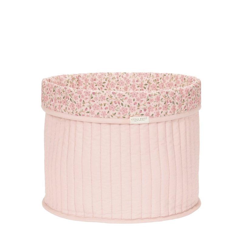Mantén la habitación del bebé organizada y ordenada con esta cesta de almacenamiento. Está fabricada en algodón acolchado, es reversible y tiene un bonito diseño de flores por un lado y un color rosa claro por el otro.