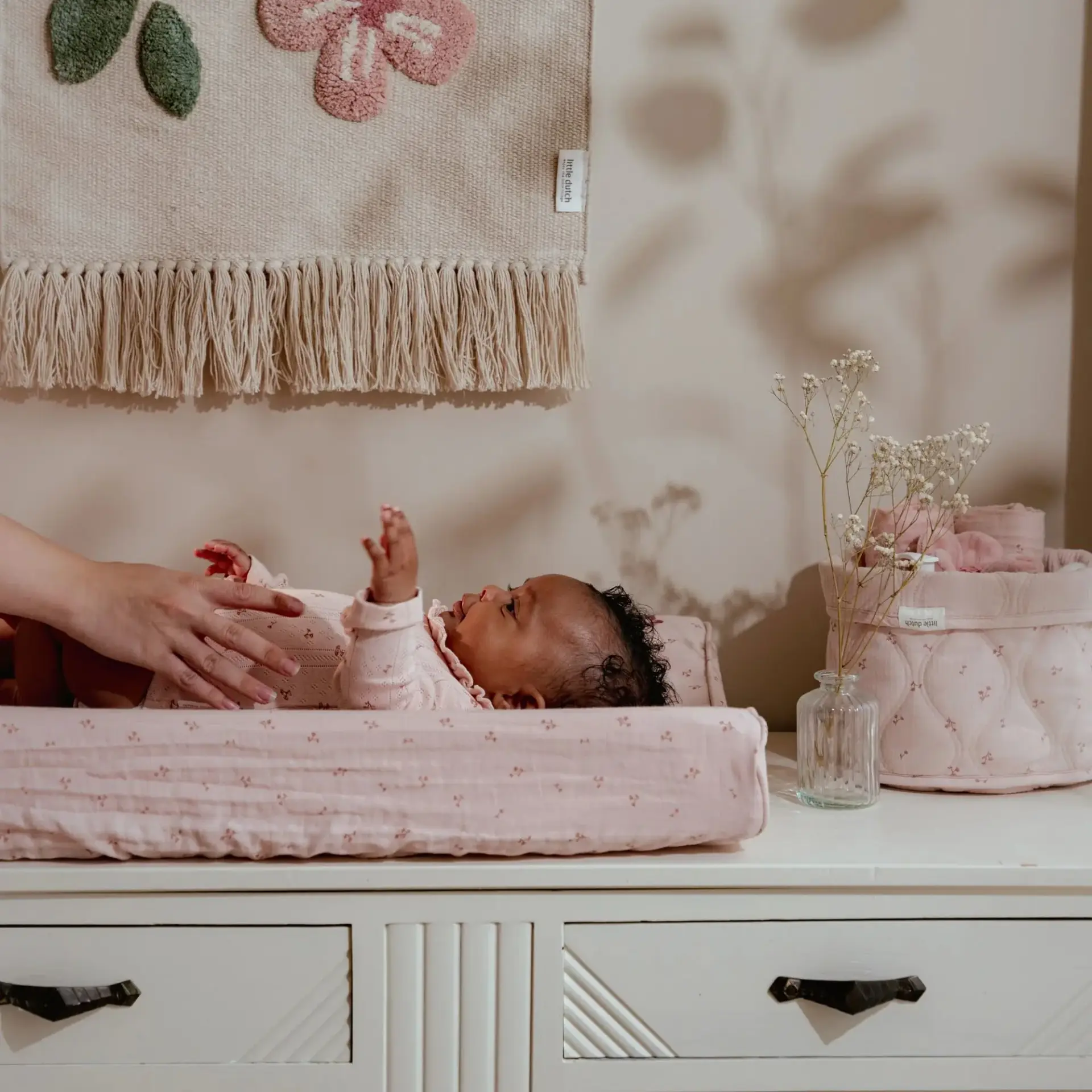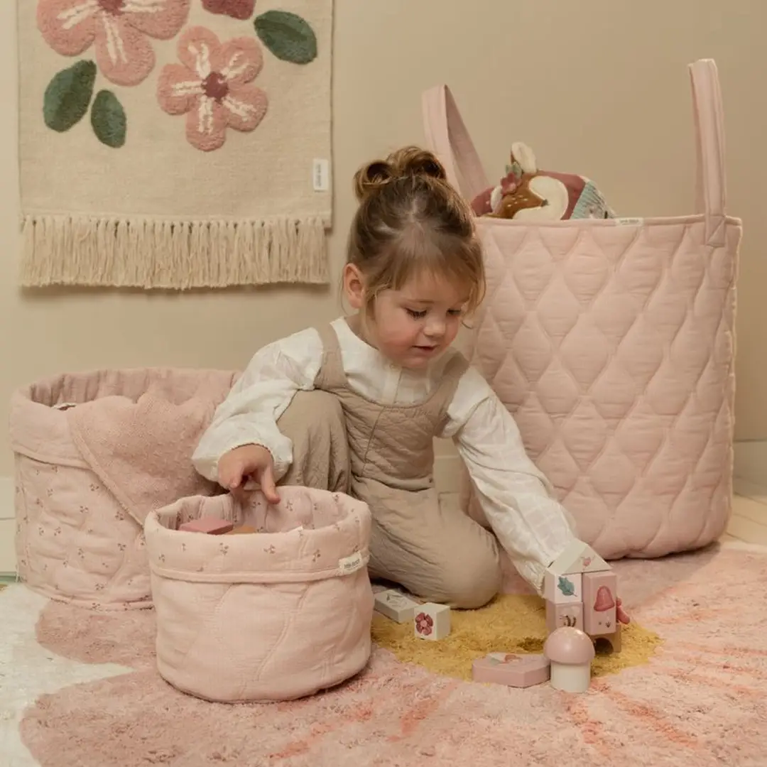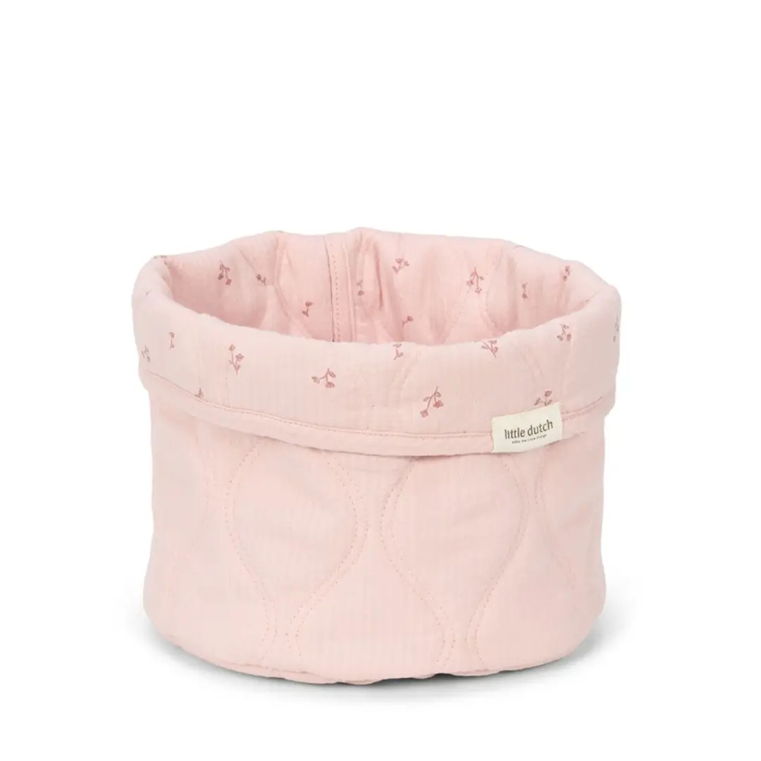 Mantén la habitación del bebé organizada y ordenada con esta cesta de almacenamiento. Está fabricada en algodón acolchado, es reversible y tiene un sutil estampado de flores por un lado y un color rosa liso por el otro.