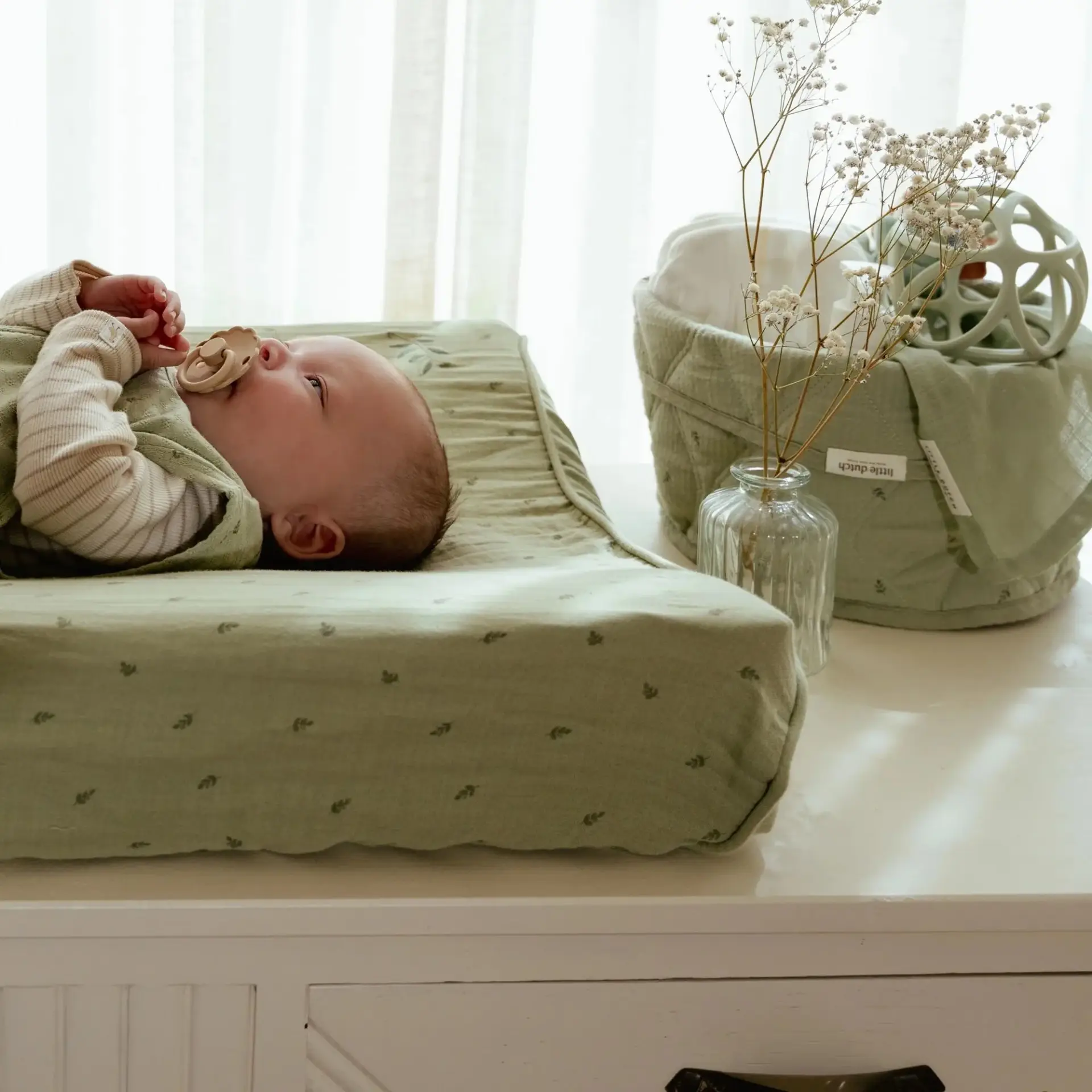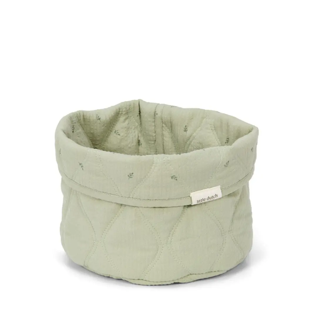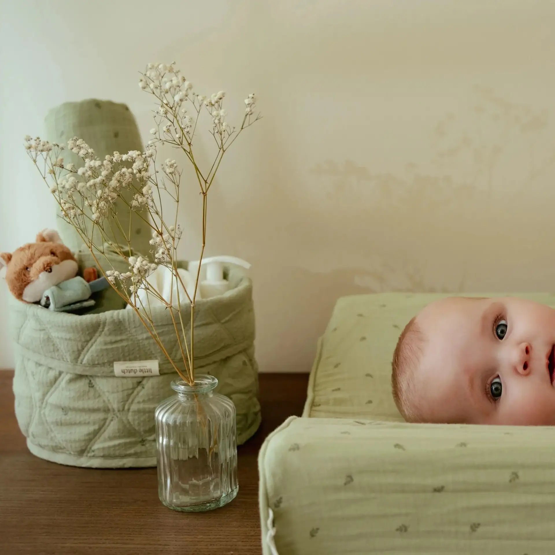 Mantén la habitación del bebé organizada y ordenada con esta cesta de almacenamiento. Está fabricada en algodón acolchado, es reversible y tiene un sutil estampado de hojas por un lado y un color verde liso por el otro.