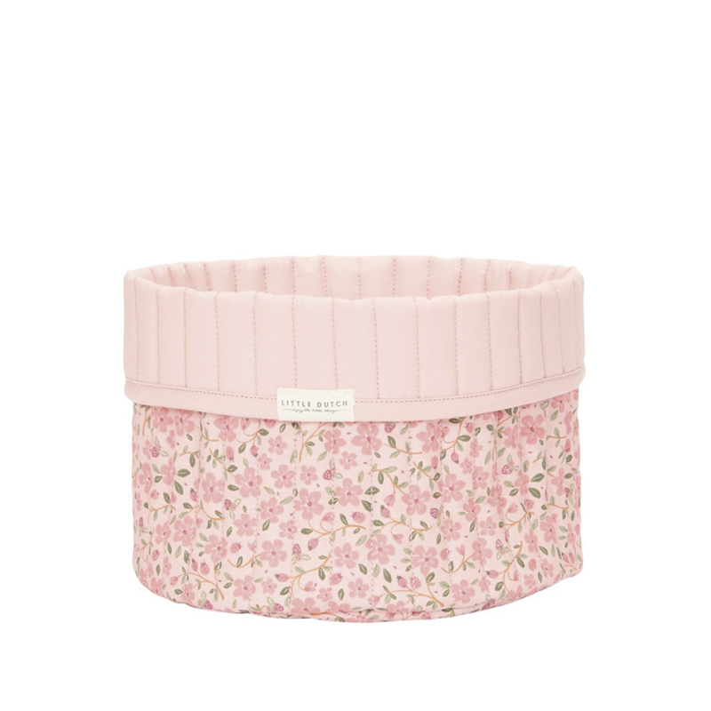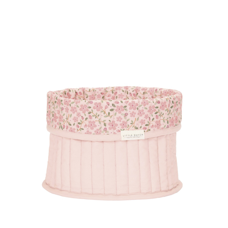 Mantén la habitación del bebé organizada y ordenada con esta cesta de almacenamiento. Está fabricada en algodón acolchado, es reversible y tiene un bonito diseño de flores por un lado y un color rosa claro por el otro.