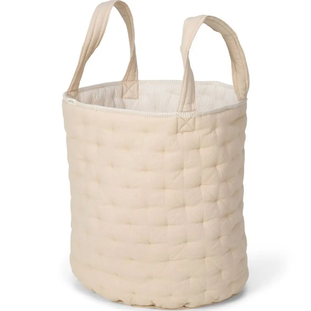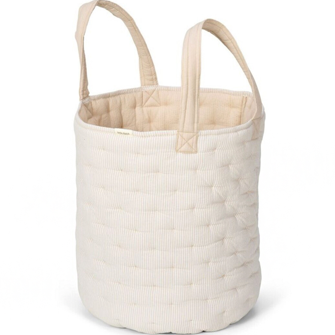 Mantén la habitación organizada y ordenada con esta maxi cesta de almacenamiento con asas. Está fabricada en algodón acolchado, es reversible y tiene un elegante estampado de rayas por un lado y un color beige liso por el otro.