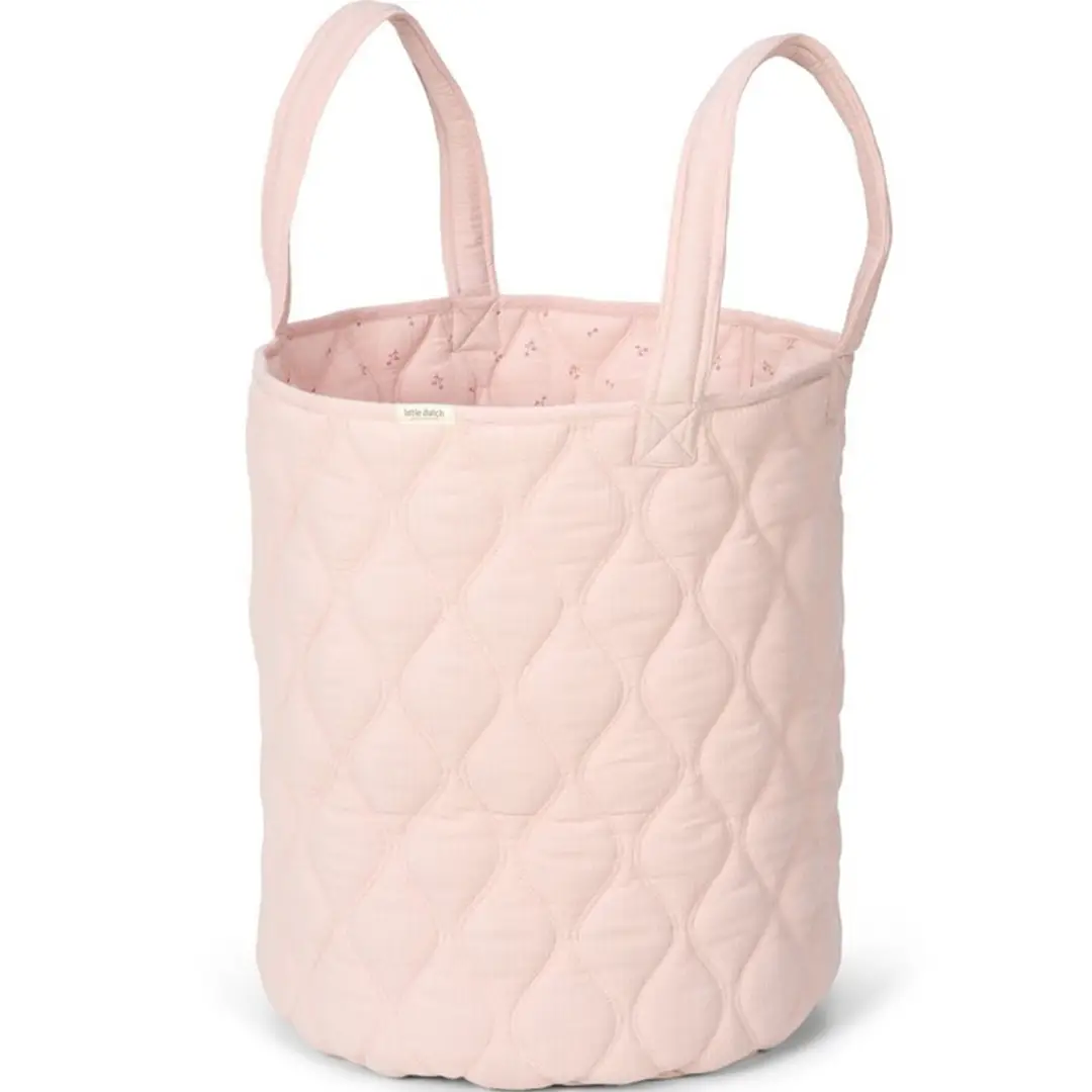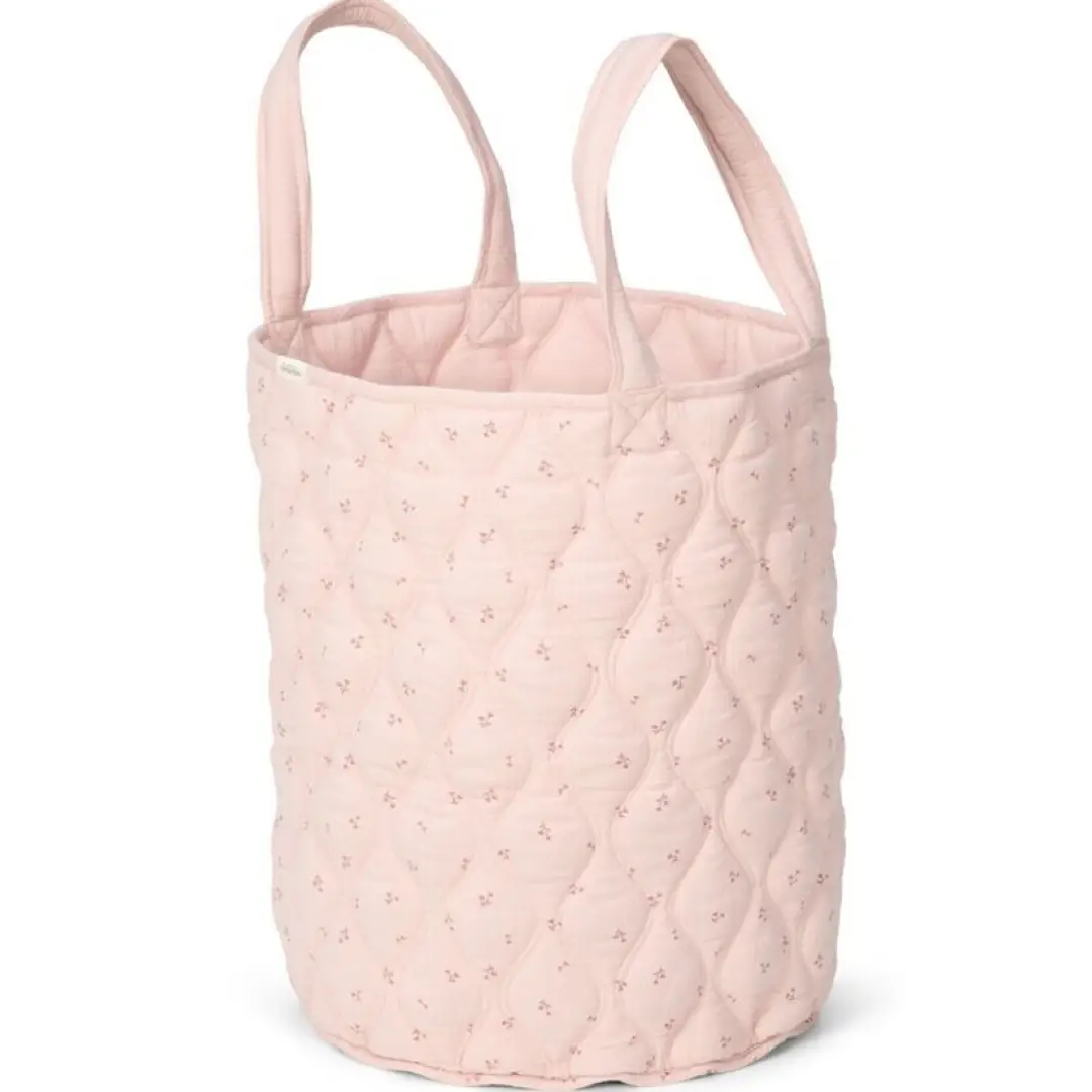Mantén la habitación organizada y ordenada con esta maxi cesta de almacenamiento con asas. Está fabricada en algodón acolchado, es reversible y tiene un sutil estampado de flores por un lado y un color rosa liso por el otro.