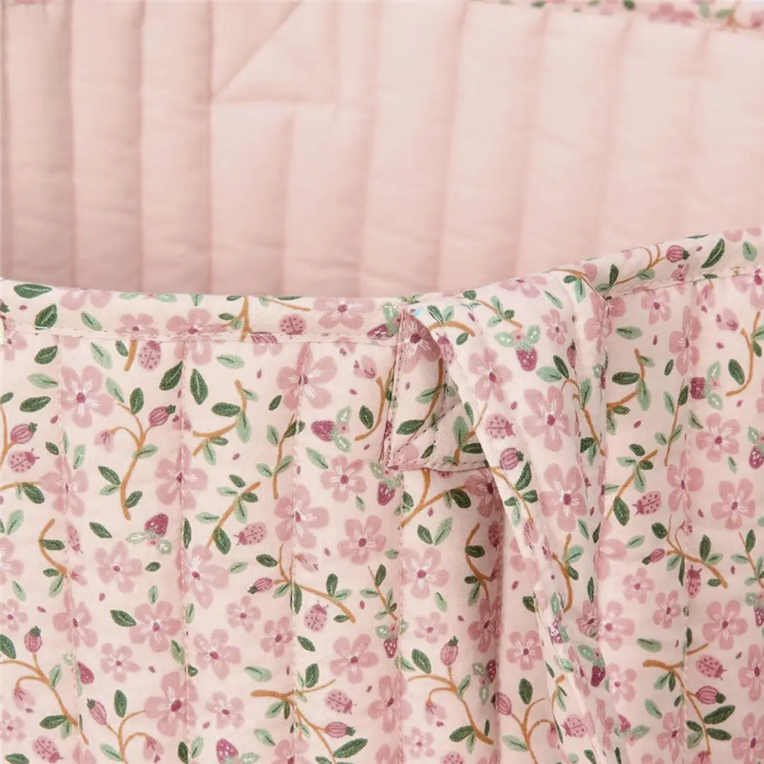 Mantén la habitación organizada y ordenada con esta maxi cesta de almacenamiento con asas. Está fabricada en algodón acolchado, es reversible y tiene un bonito diseño de flores por un lado y un color rosa claro por el otro.
