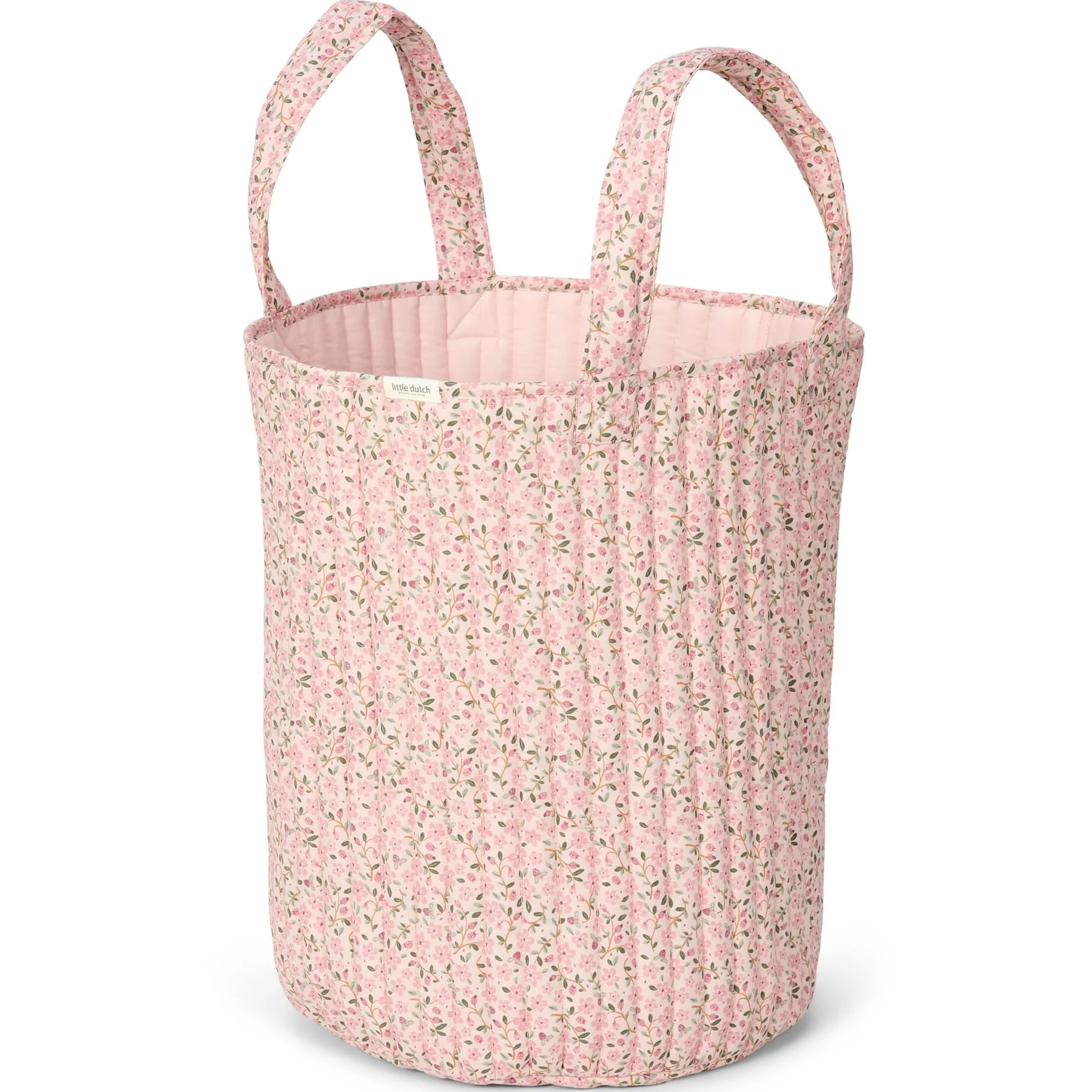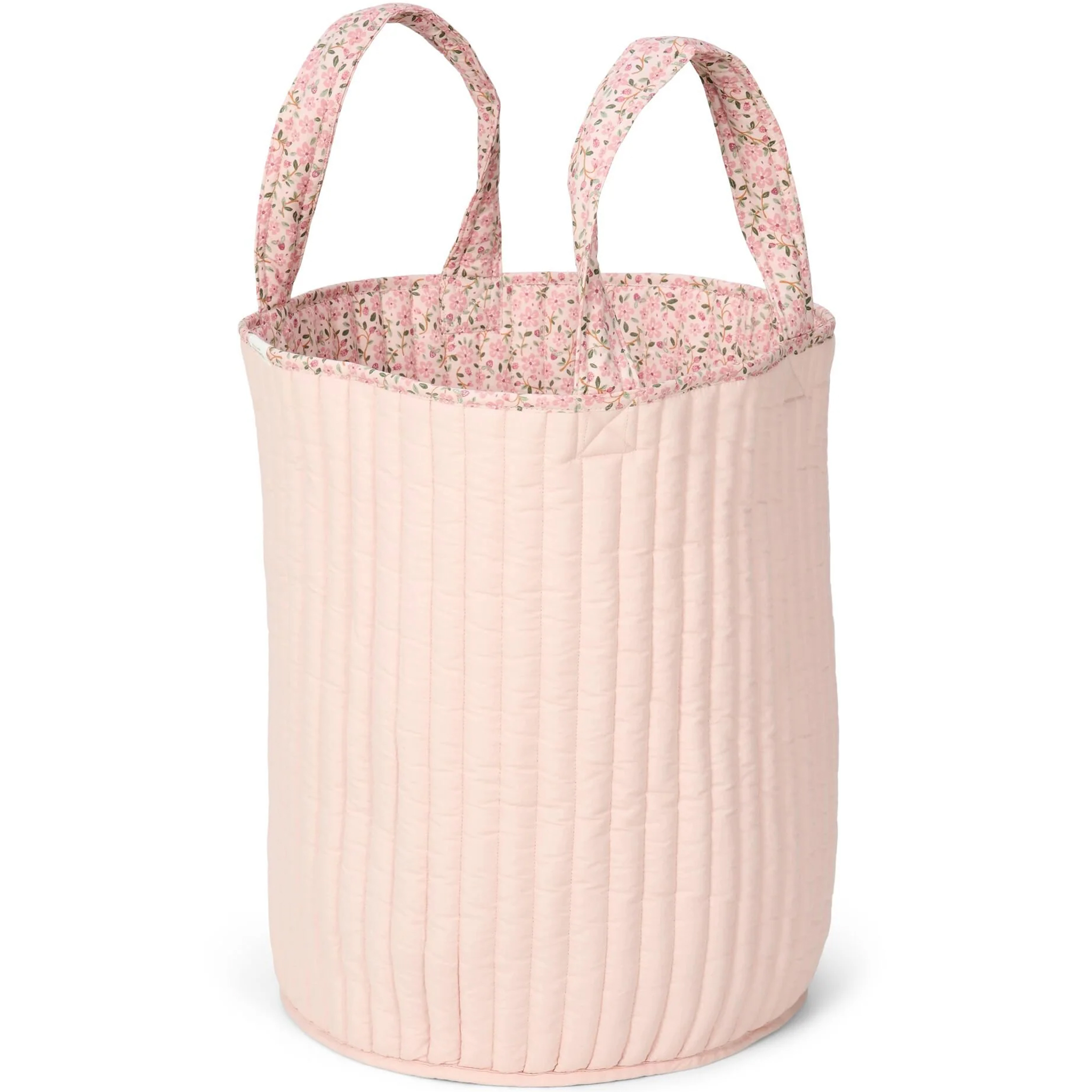 Mantén la habitación organizada y ordenada con esta maxi cesta de almacenamiento con asas. Está fabricada en algodón acolchado, es reversible y tiene un bonito diseño de flores por un lado y un color rosa claro por el otro.