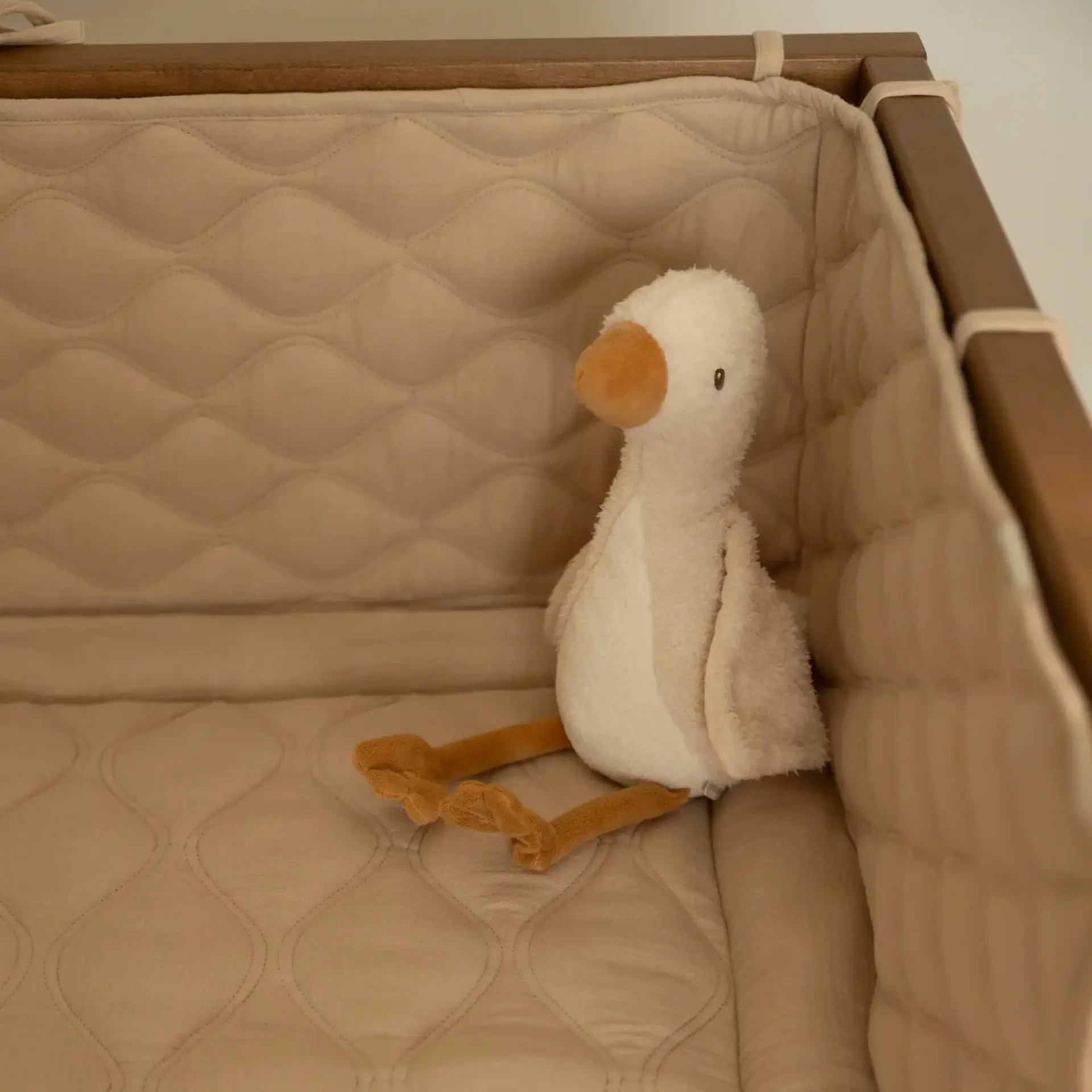 Fabricado en tejido muselina prelavada y arrugada, acolchada y súper suave. Puedes fijarlo fácilmente a la cuna con los cordones.