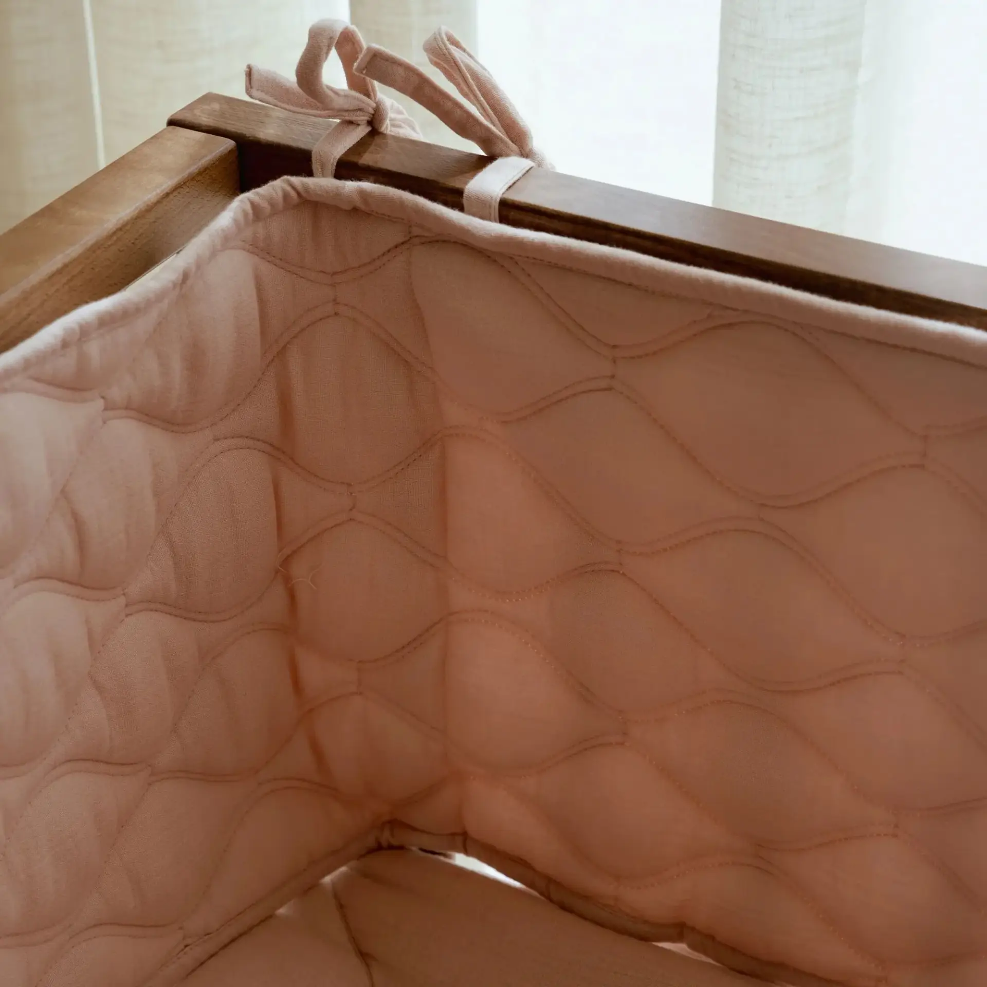 Fabricado en tejido muselina prelavada y arrugada, acolchada y súper suave. Puedes fijarlo fácilmente a la cuna con los cordones.