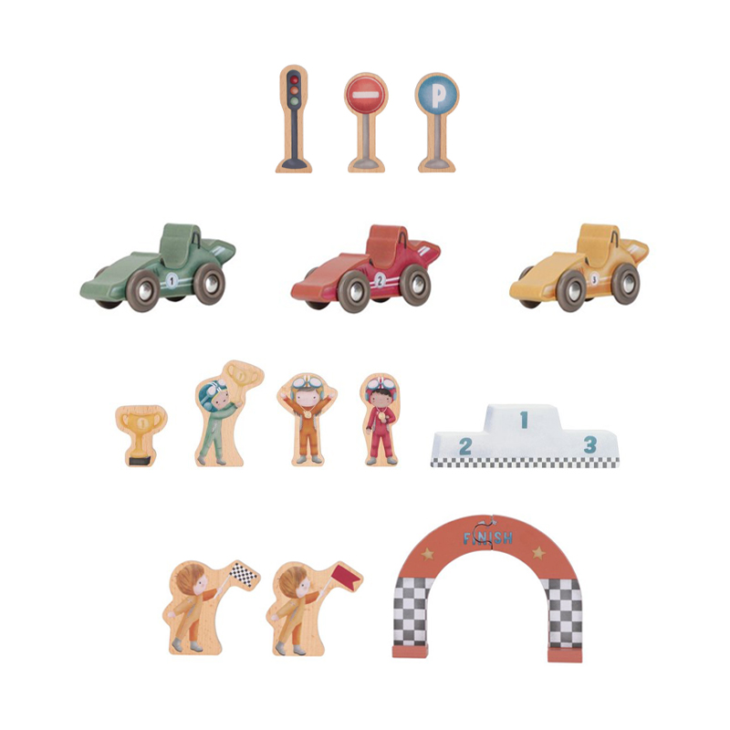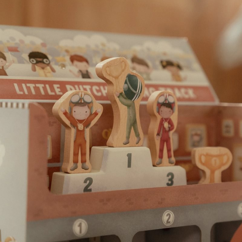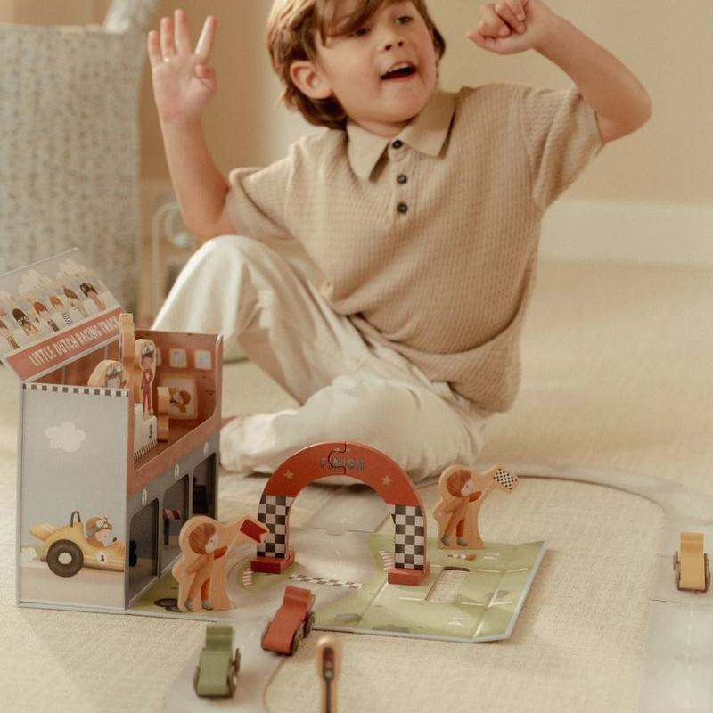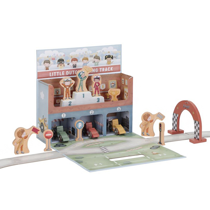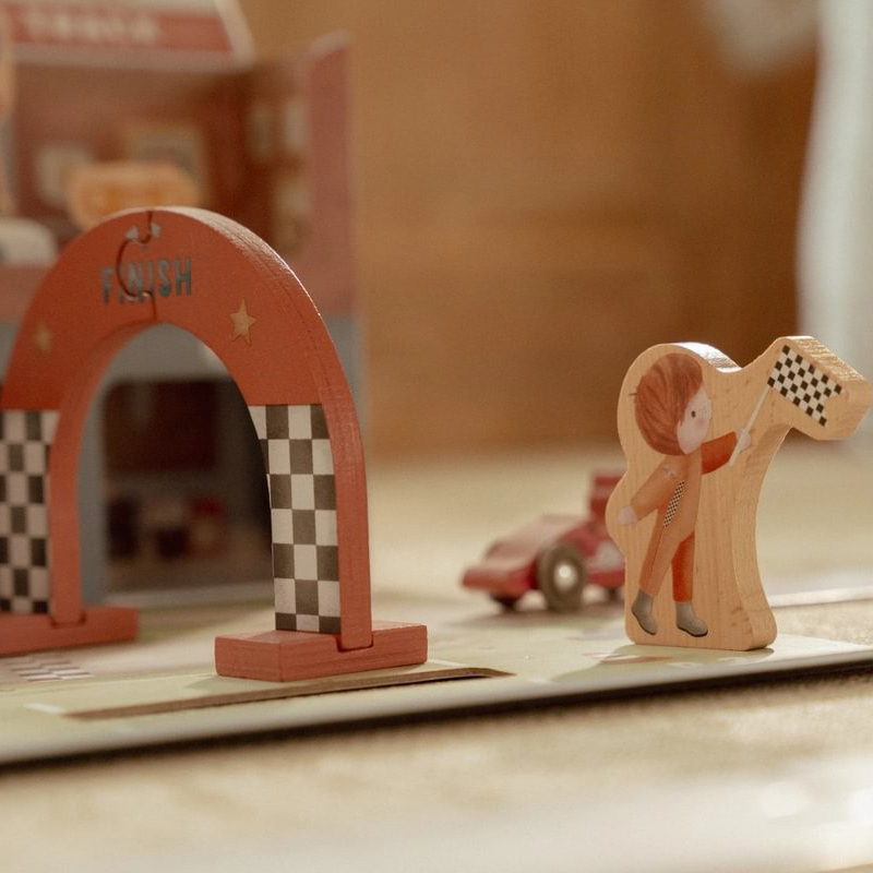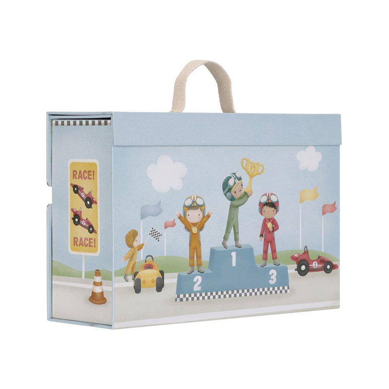 ¡Arranquen motores! Este estuche de cartón se transforma en una pista de carreras completa. El set incluye todo lo necesario para una carrera emocionante: coches de carreras, pilotos, una línea de meta, señales de tráfico, un trofeo y un podio de ganadores. La pista de cartón consta de piezas independientes que se ensamblan fácilmente como un rompecabezas. Después de la carrera, puedes guardar todo cuidadosamente en el estuche. ¿Listo para la siguiente carrera?