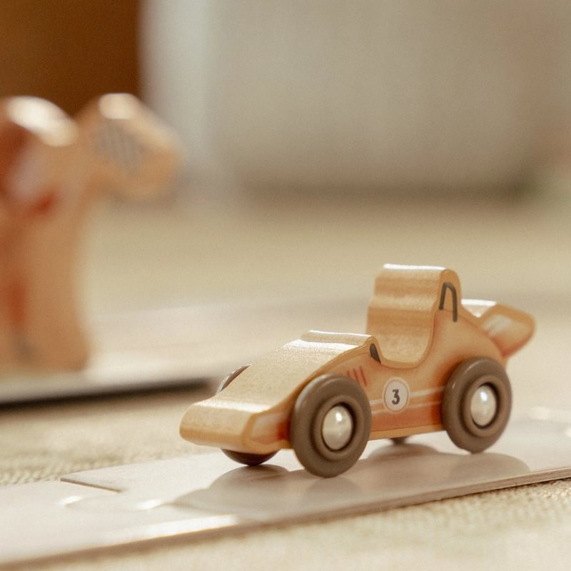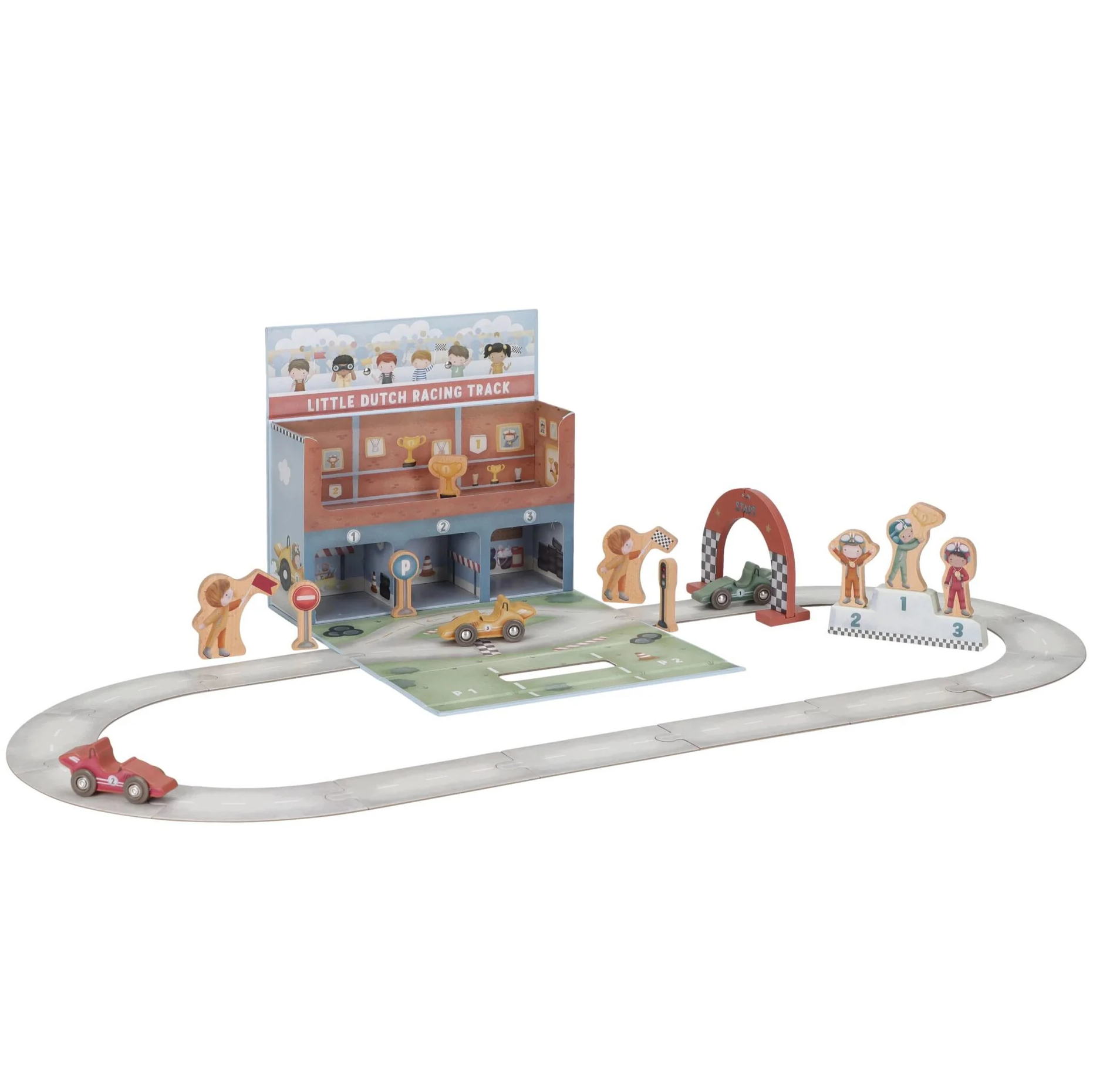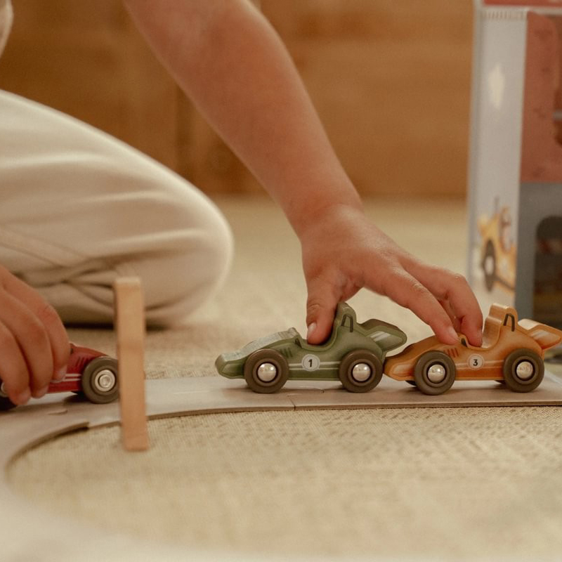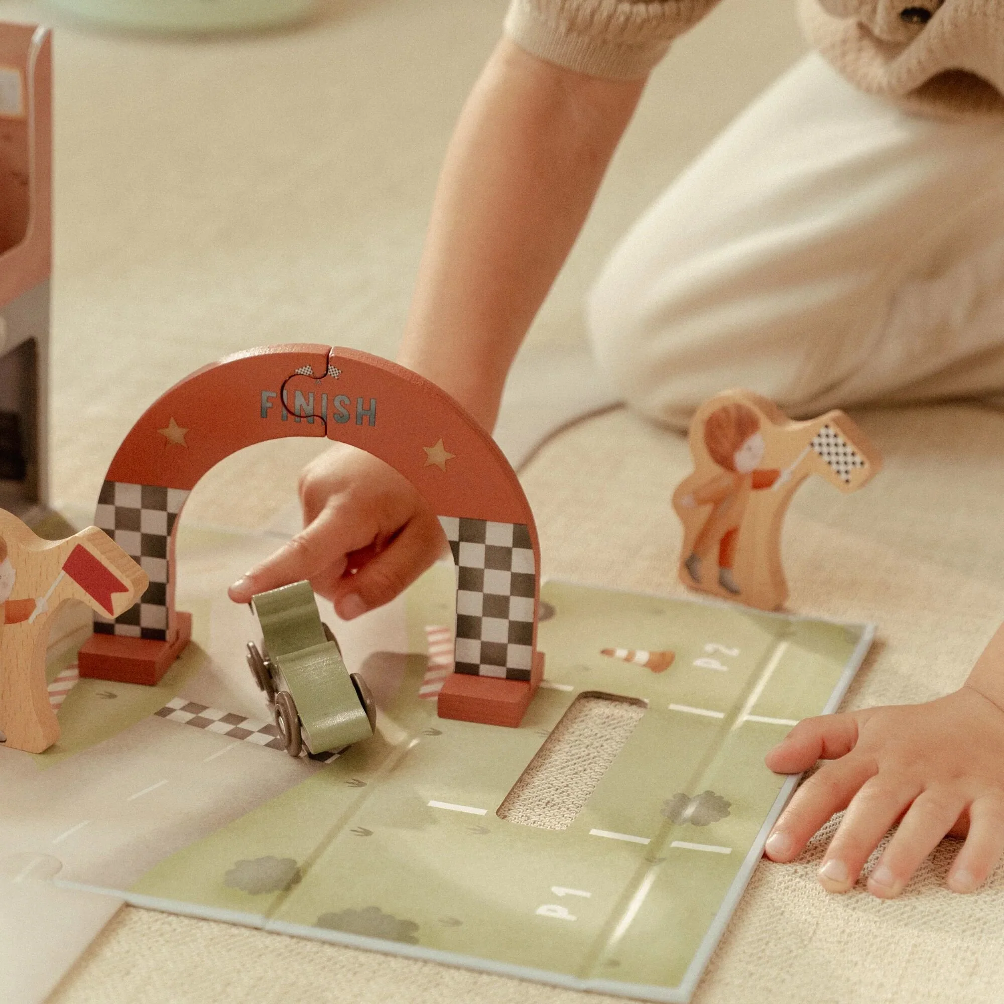 ¡Arranquen motores! Este estuche de cartón se transforma en una pista de carreras completa. El set incluye todo lo necesario para una carrera emocionante: coches de carreras, pilotos, una línea de meta, señales de tráfico, un trofeo y un podio de ganadores. La pista de cartón consta de piezas independientes que se ensamblan fácilmente como un rompecabezas. Después de la carrera, puedes guardar todo cuidadosamente en el estuche. ¿Listo para la siguiente carrera?