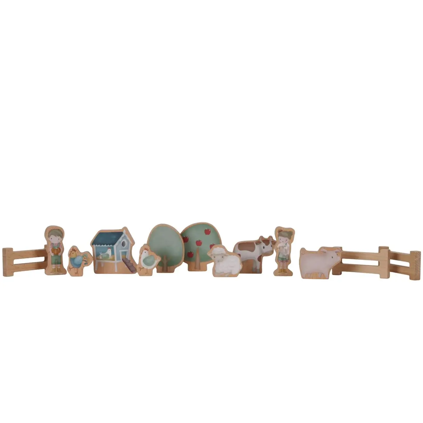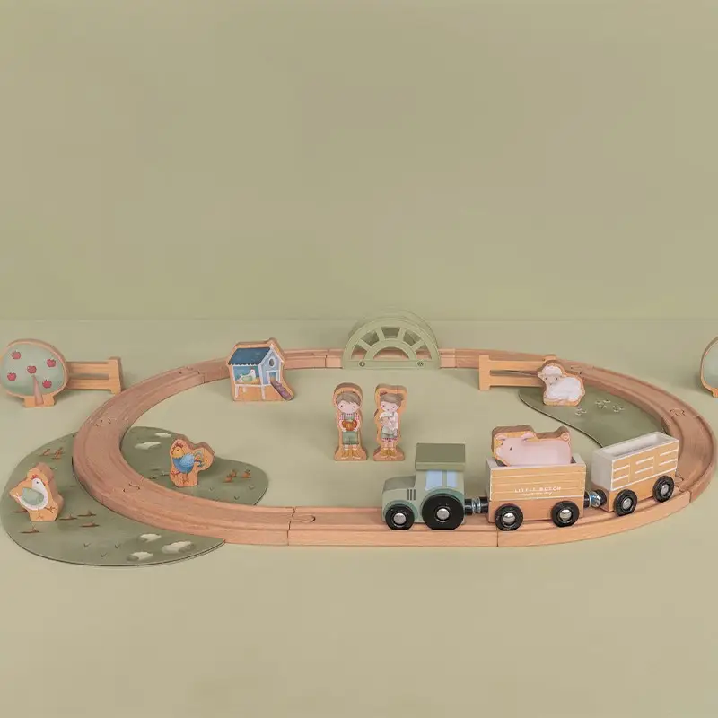 El set contiene una locomotora con dos vagones, raíles, un puente, árboles, vallas, animales, un gallinero, bloques de césped y de huerto, un granjero y una granjera. Cada figura de madera está ilustrada en detalle por ambos lados.