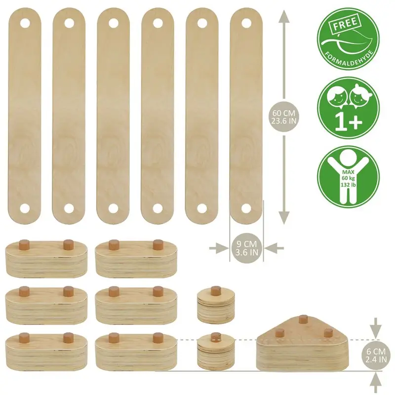Crea tu propio circuito o estructura de equilibrio con este set de 15 piezas de madera. El set incluye: 6 listones de madera, 2 conectores individuales, 6 conectores dobles y 1 conector triple. Cada listón de madera tiene una medida de 60 cm de largo y 9 cm de ancho. Es perfecto para jugar tanto dentro como fuera de casa.