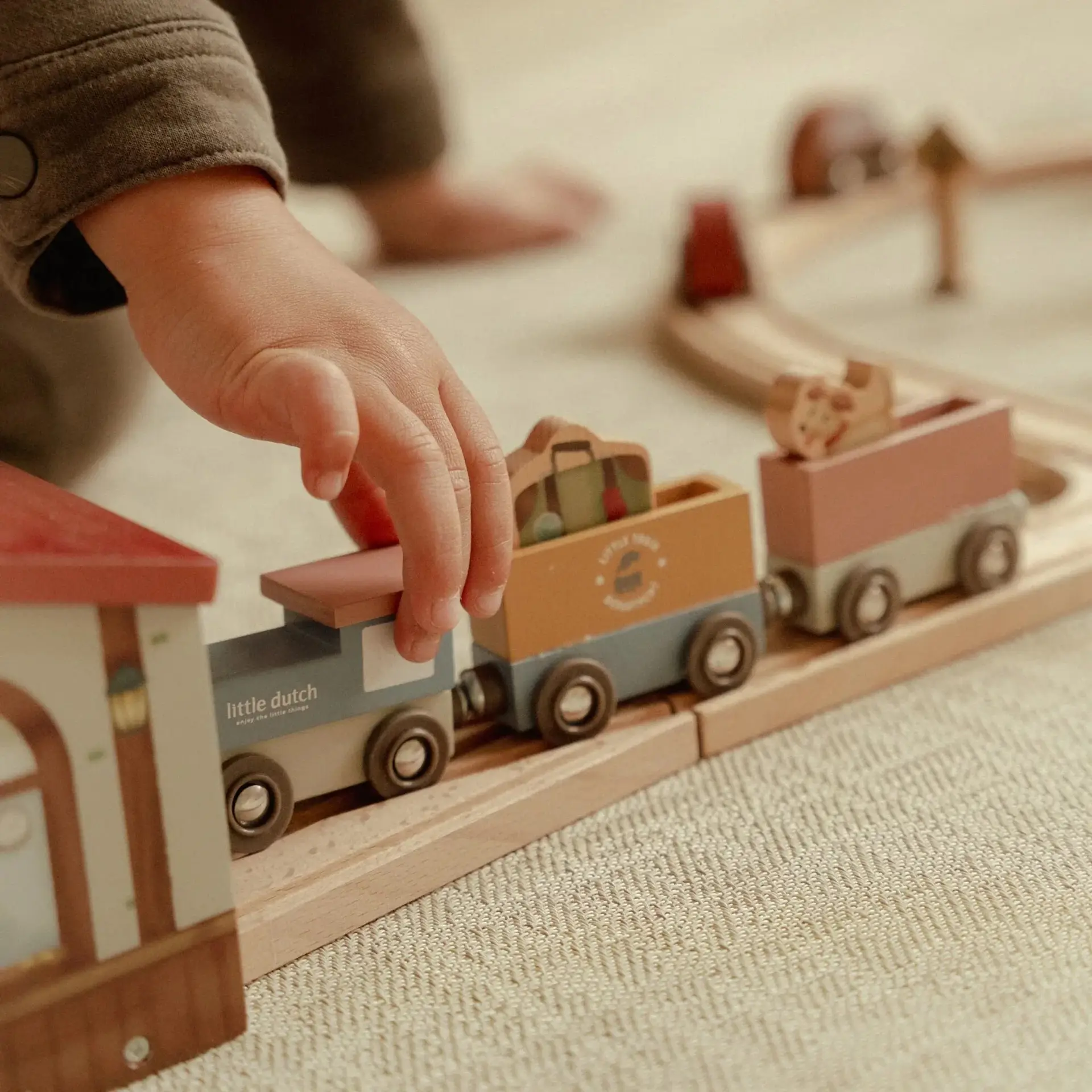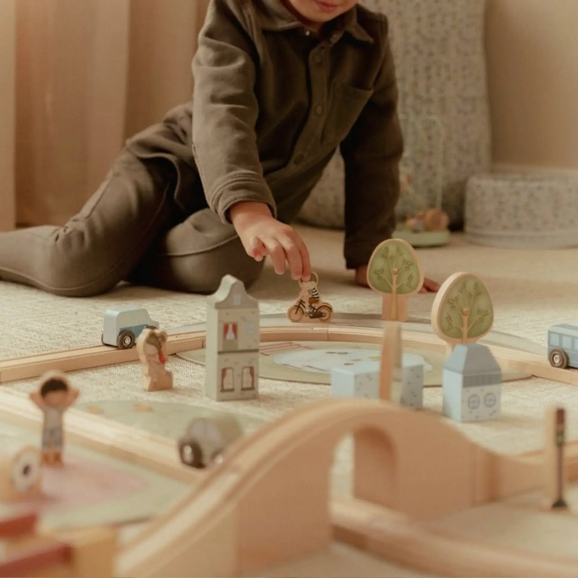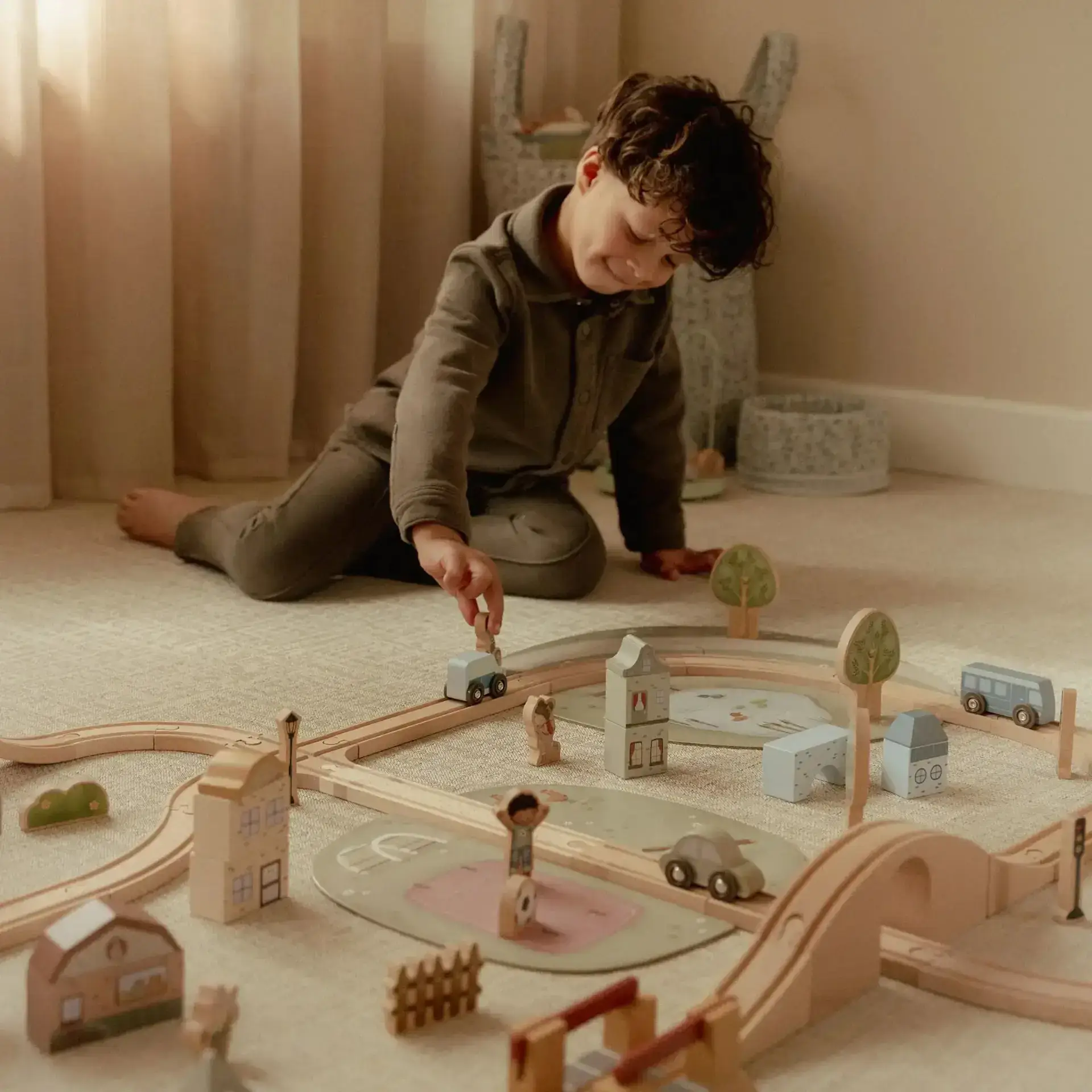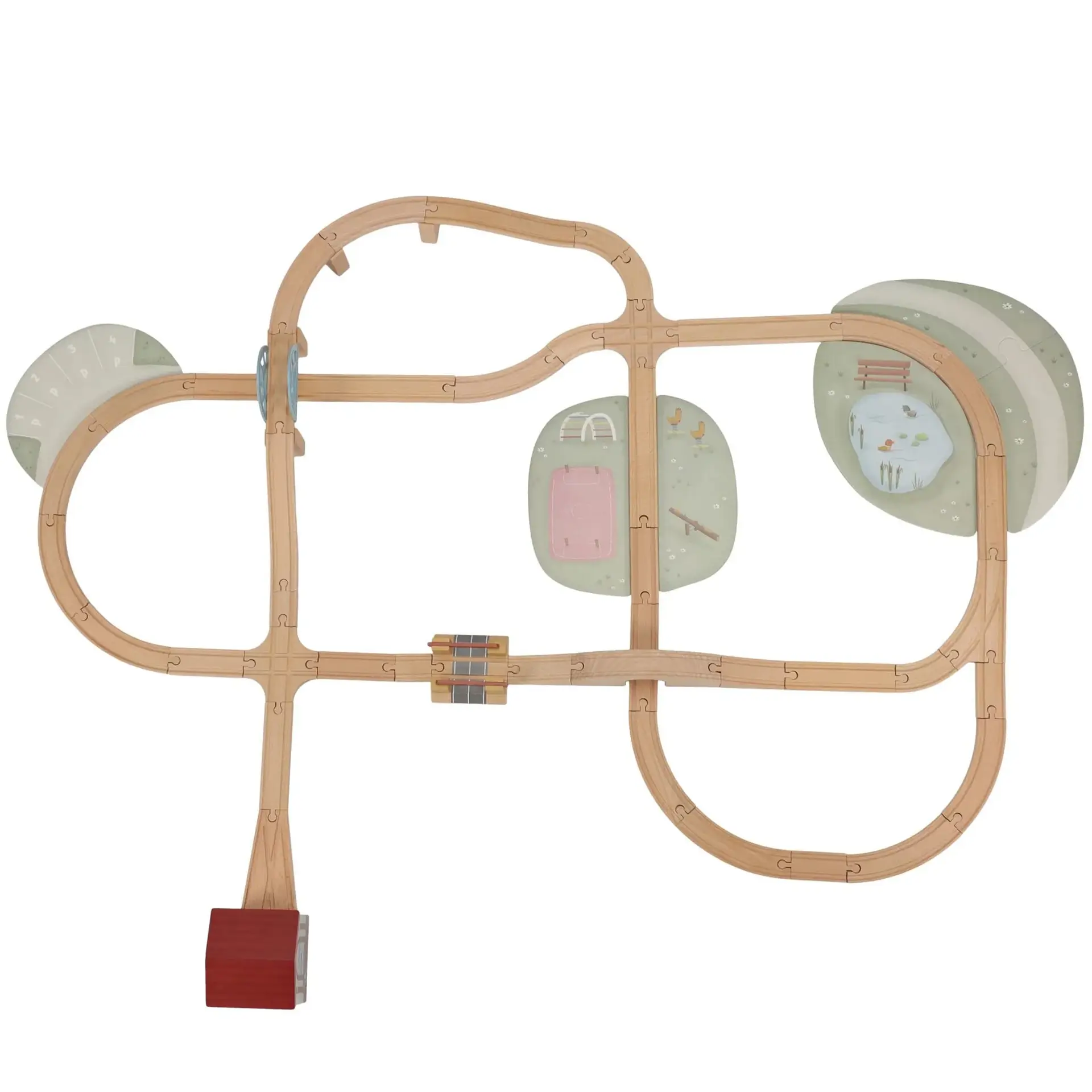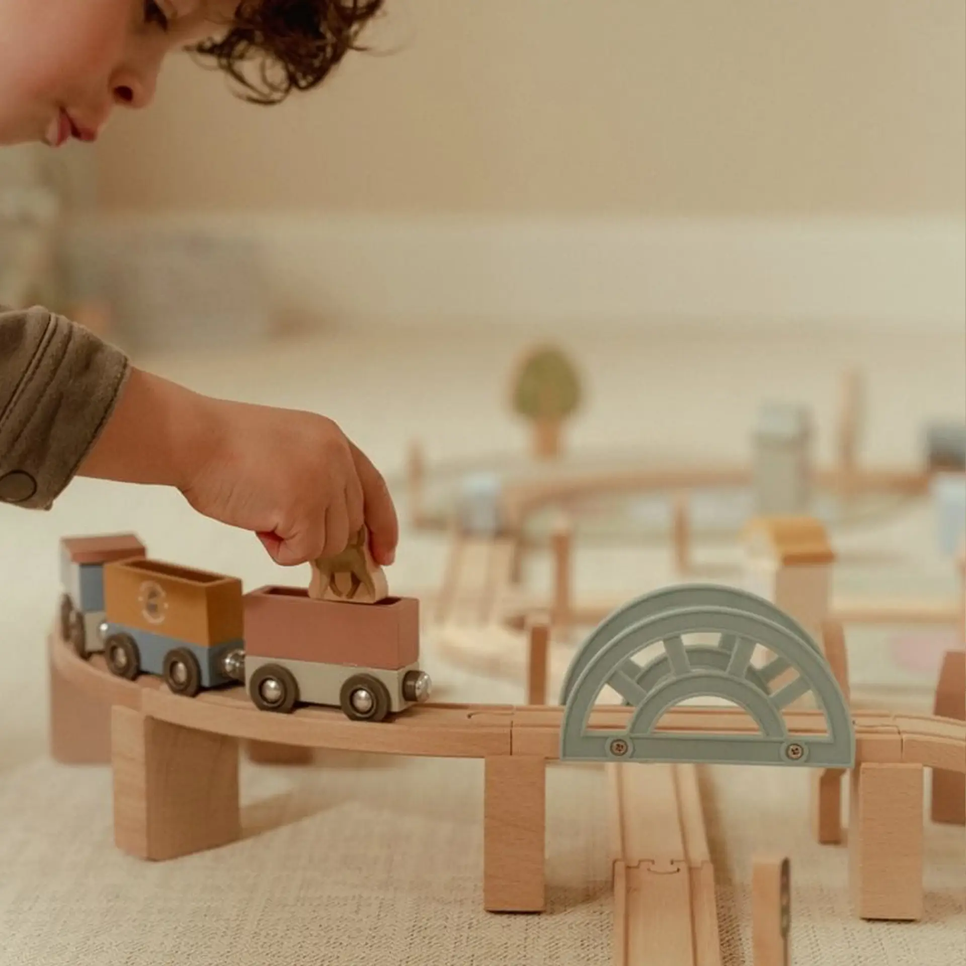¡Crea tu propio mundo con este circuito de tren de madera! Este conjunto ofrece muchas opciones para crear nuevas combinaciones una y otra vez. ¡Las posibilidades son infinitas!