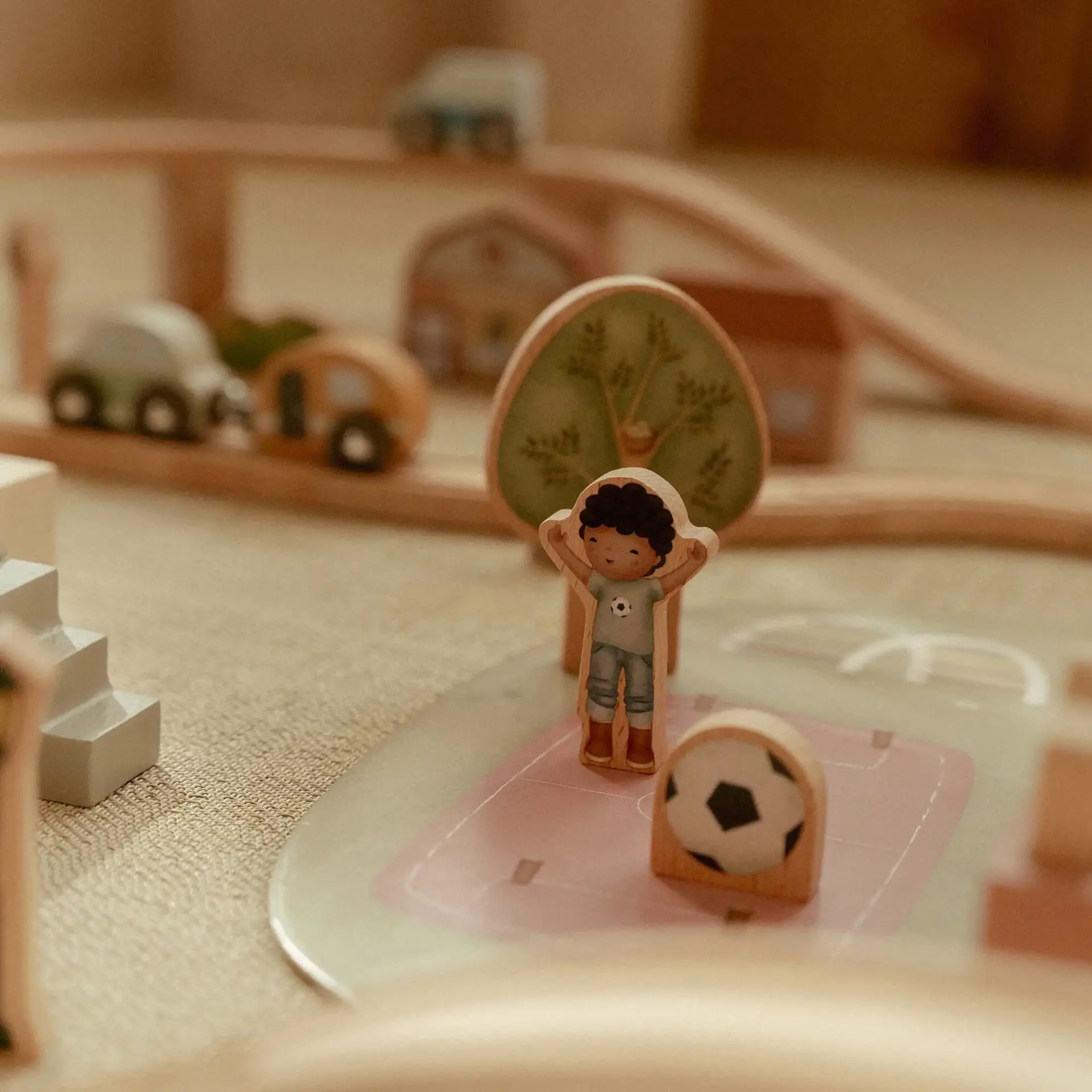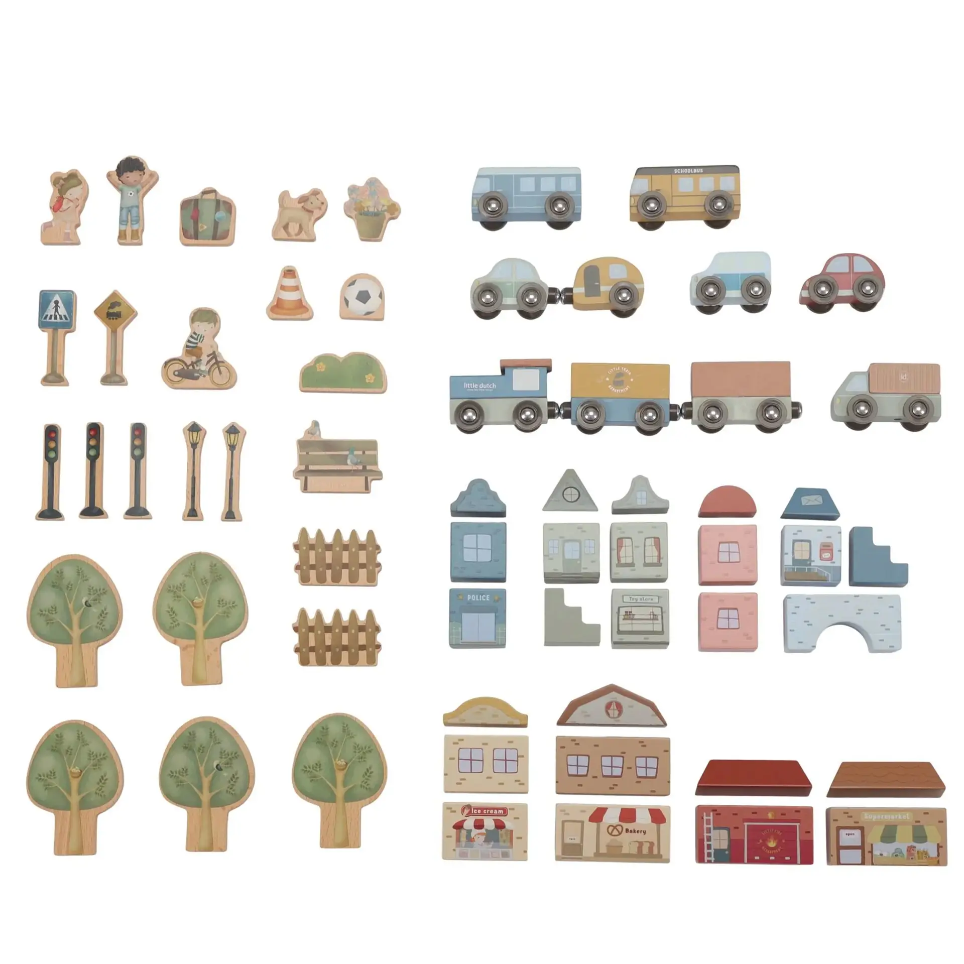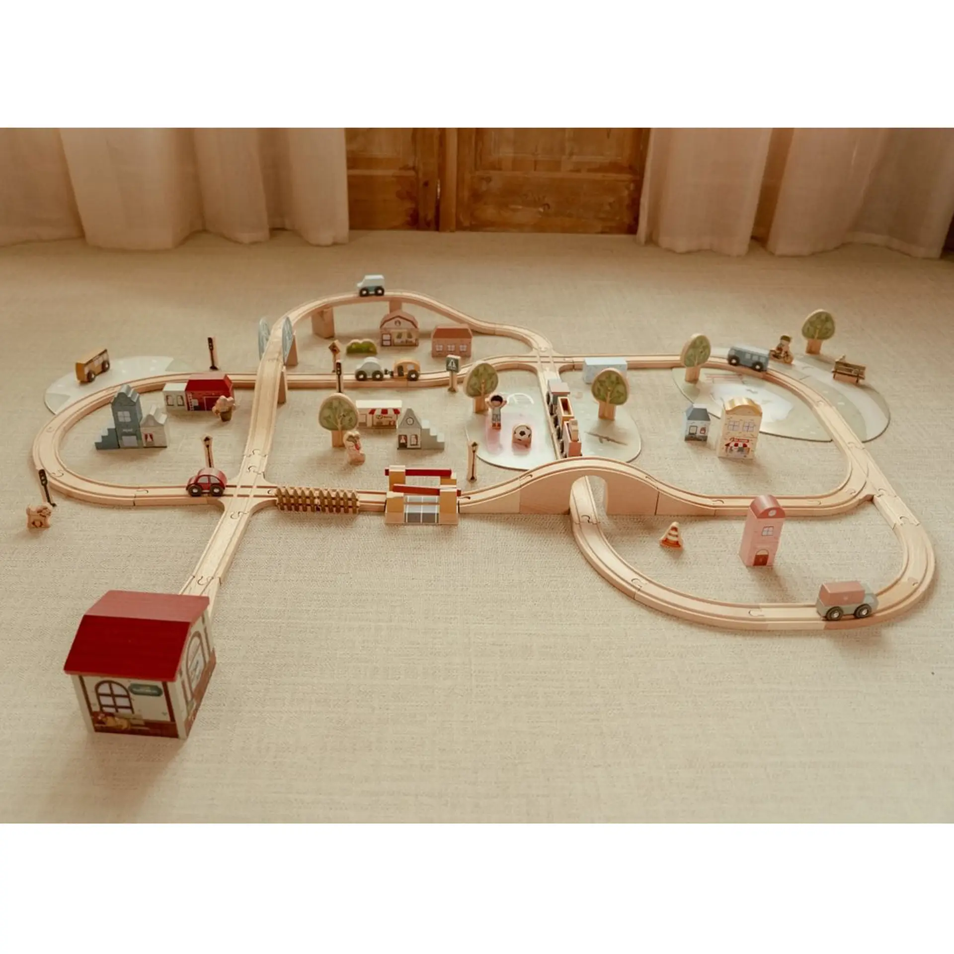 Este completo set incluye una locomotora, vías, puentes, edificios, coches, árboles, señales de tráfico, personas y más. Las figuras de madera tienen ilustraciones detalladas en ambos lados para hacerlo más realista y divertido.