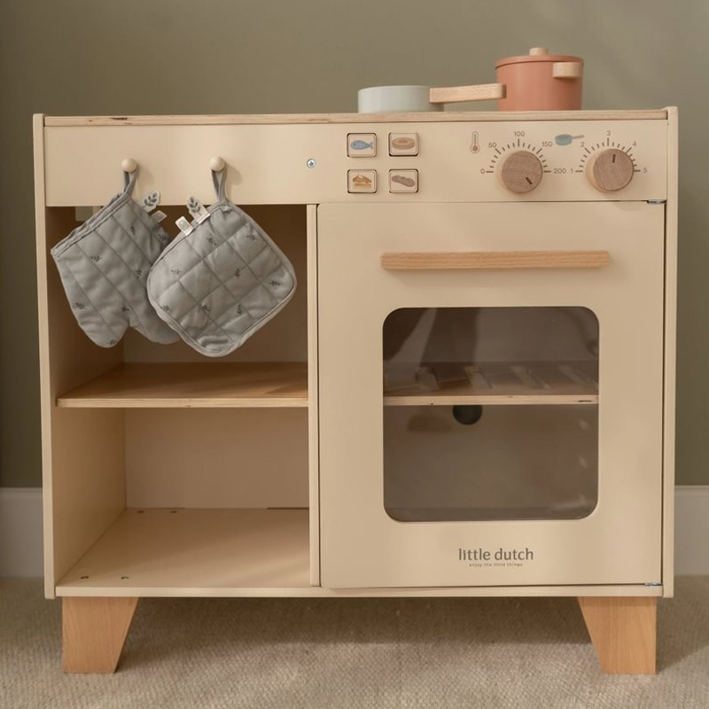 ¿Qué hay en el menú de hoy? Esta preciosa estación de cocina de madera es perfecta para preparar las comidas más deliciosas. Hornea un pastel o cocina verduras frescas en el horno. El set incluye una sartén, un cazo, una manopla y un paño, y está equipada con botones con ilustraciones para mayor realismo.