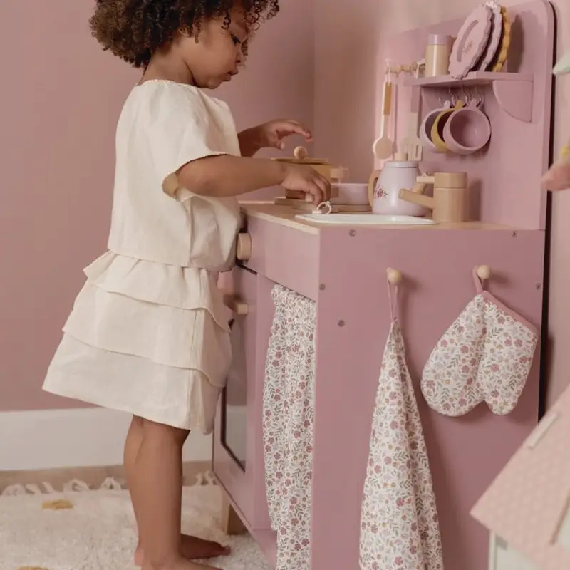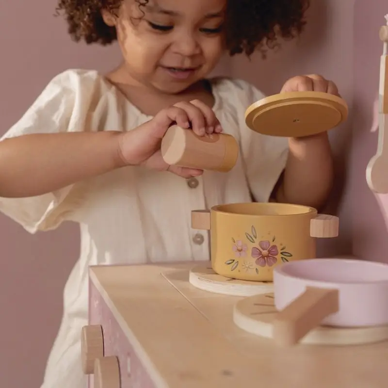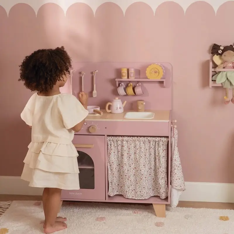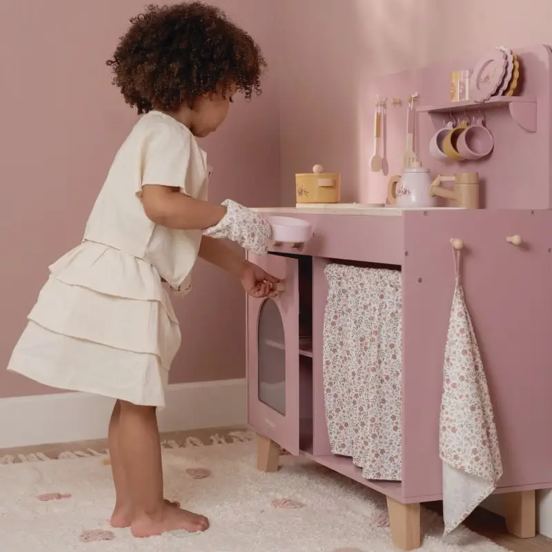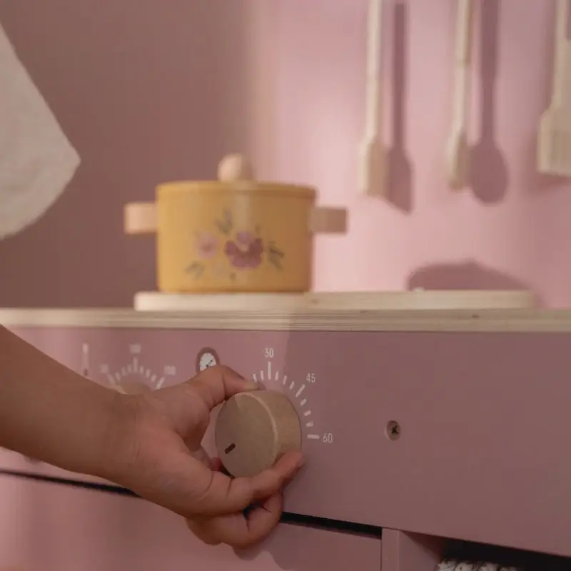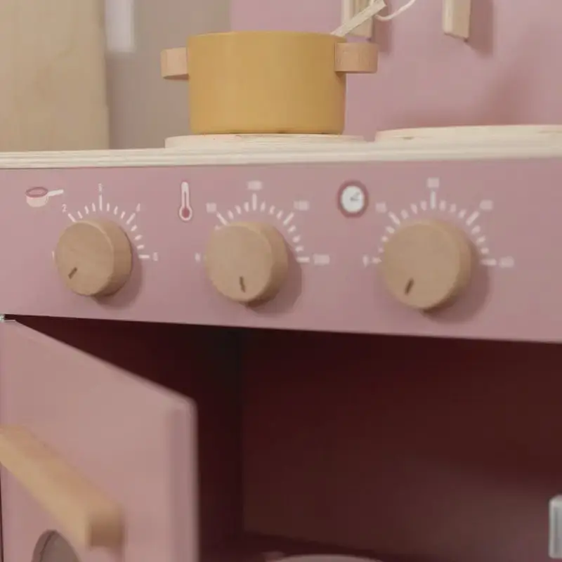 ¡Una encantadora cocina para divertirse jugando a ser chef! Los peques pueden hornear un pastel en el horno, cocinar vegetales en el fuego, que produce un sonido burbujeante al colocar el cazo, lavarse las manos en el fregadero antes de comenzar a cocinar, guardar la compra en la alacena… La cocina incluye un cazo, una sartén, utensilios de cocina, tres tazas, tres platos, una tetera, un juego de sal y pimienta, el paño de cocina y la manopla de horno.