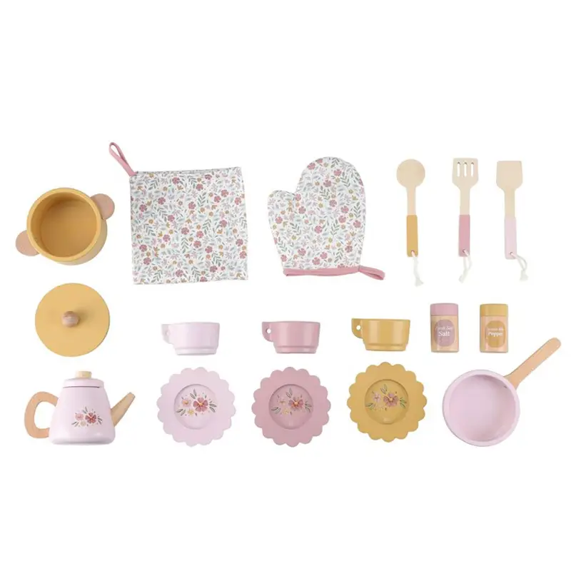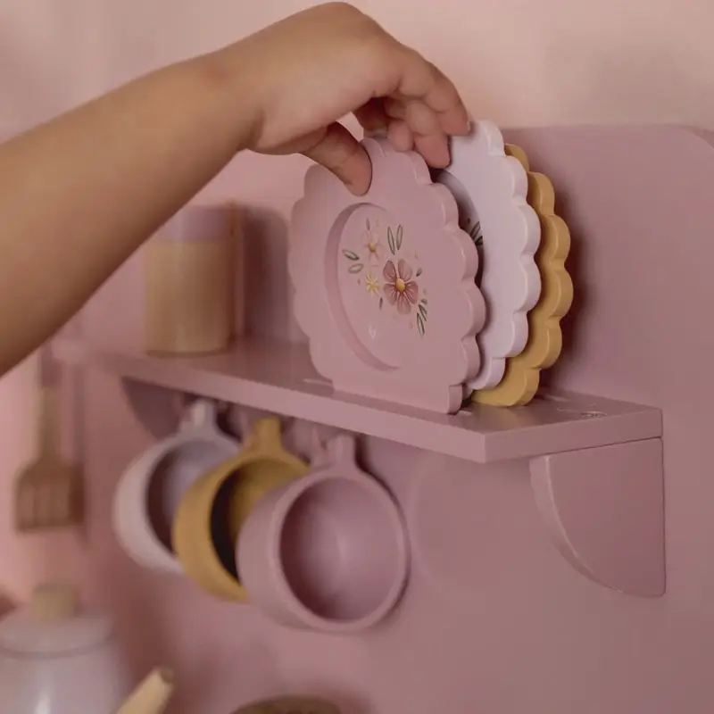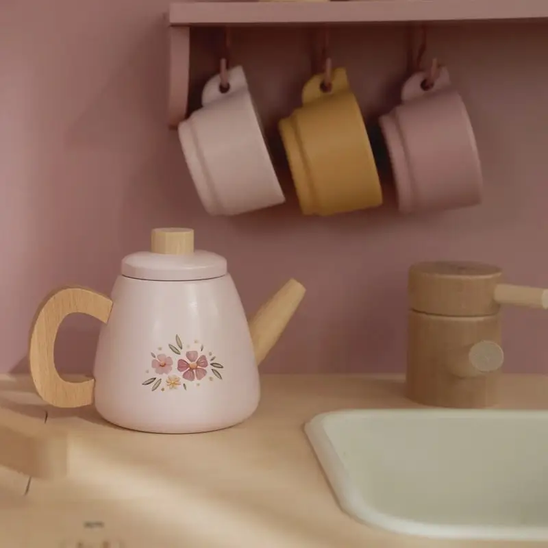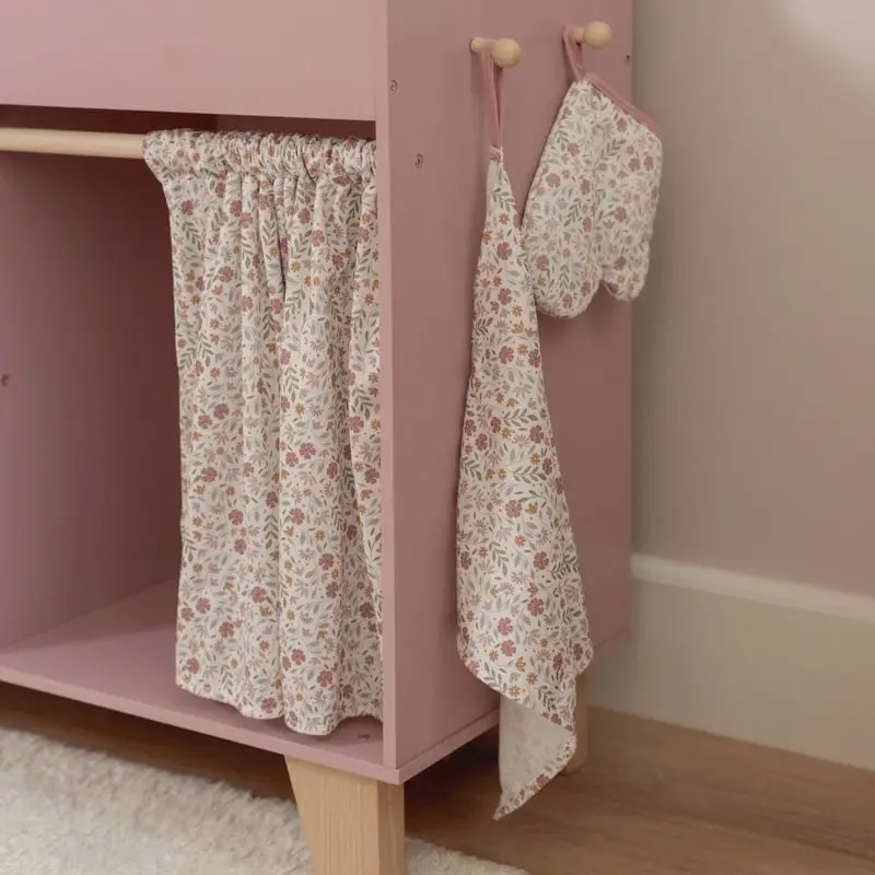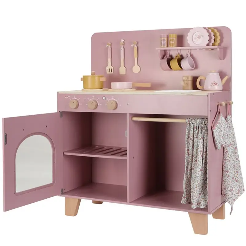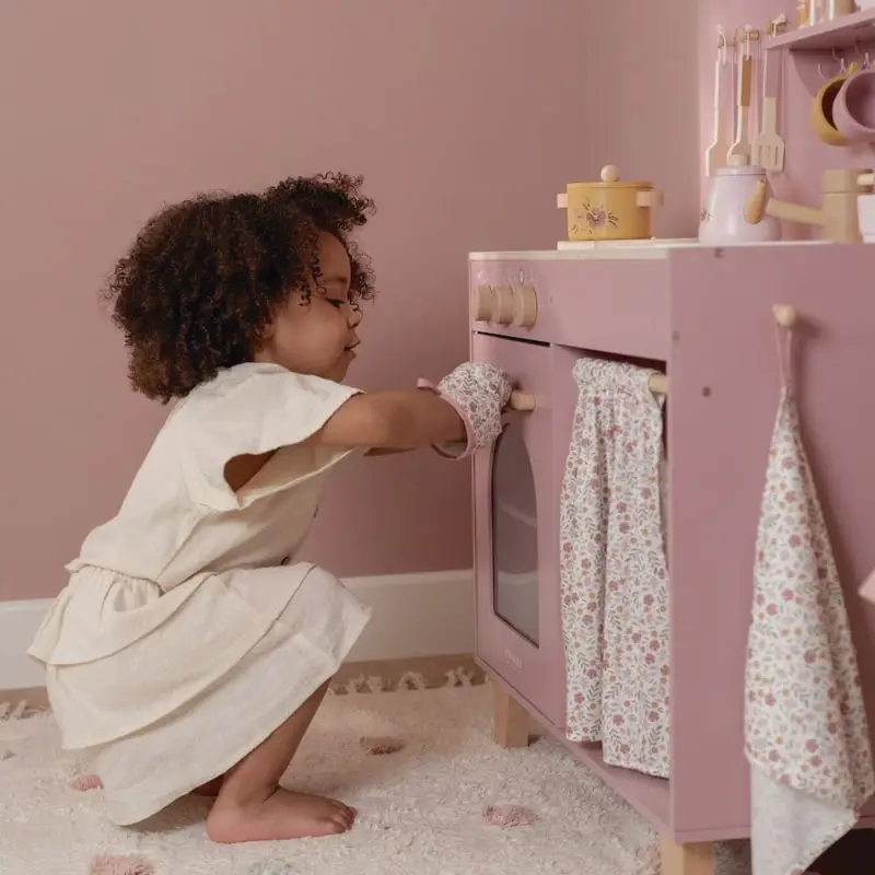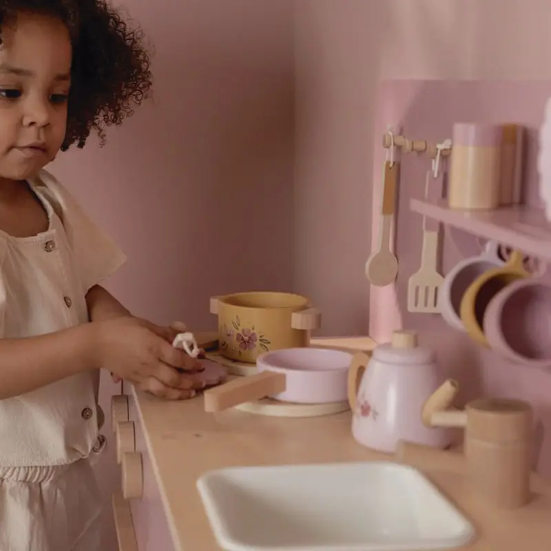 ¡Una encantadora cocina para divertirse jugando a ser chef! Los peques pueden hornear un pastel en el horno, cocinar vegetales en el fuego, que produce un sonido burbujeante al colocar el cazo, lavarse las manos en el fregadero antes de comenzar a cocinar, guardar la compra en la alacena… La cocina incluye un cazo, una sartén, utensilios de cocina, tres tazas, tres platos, una tetera, un juego de sal y pimienta, el paño de cocina y la manopla de horno.