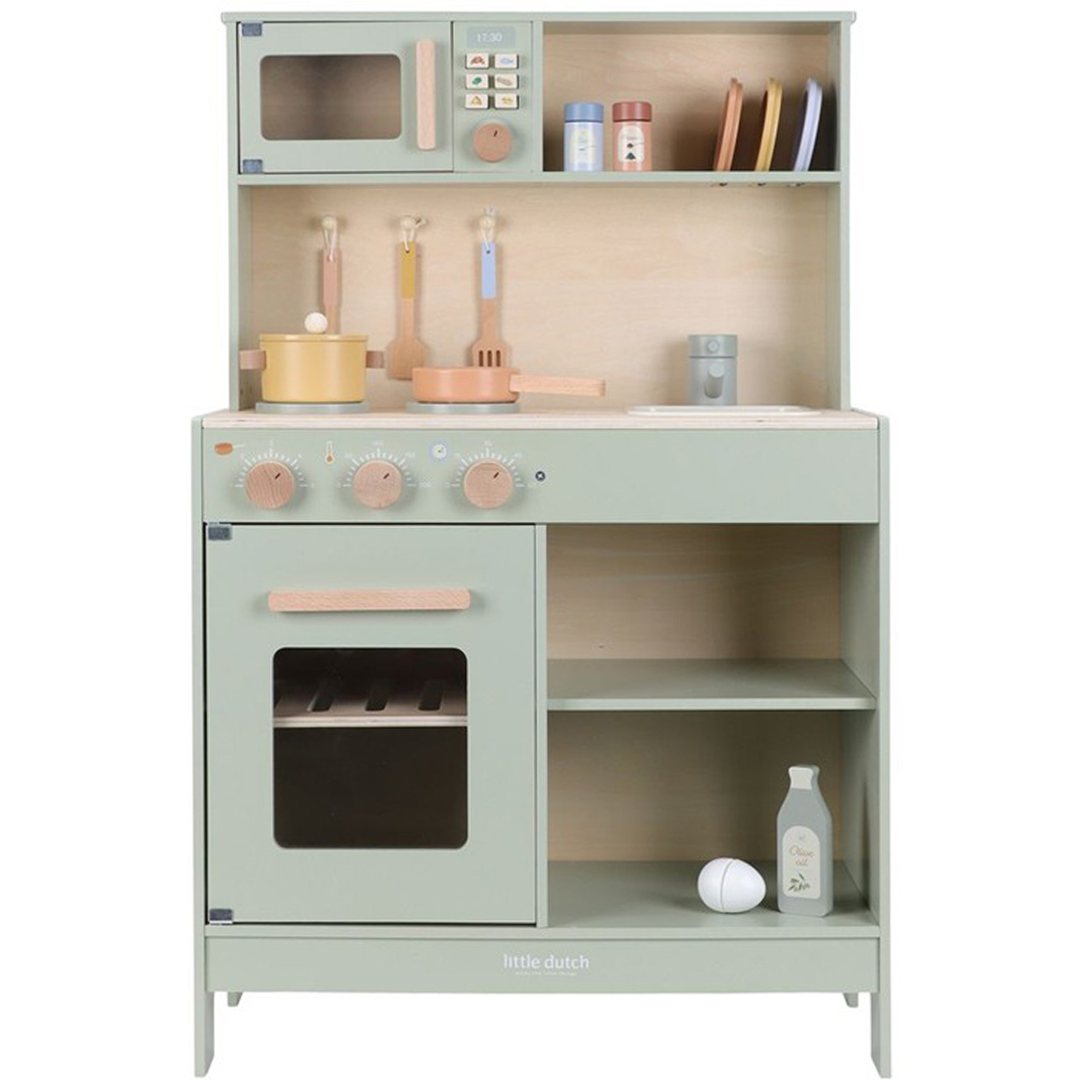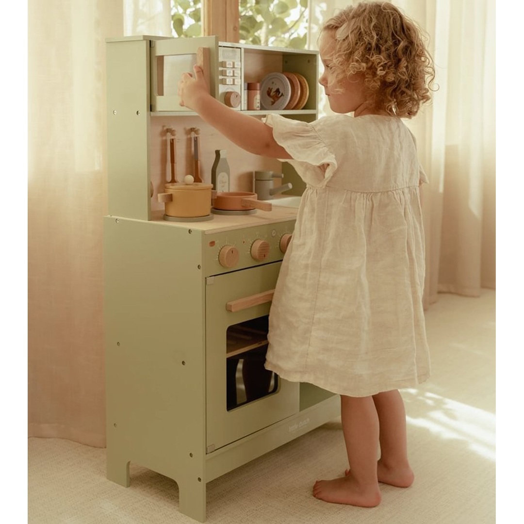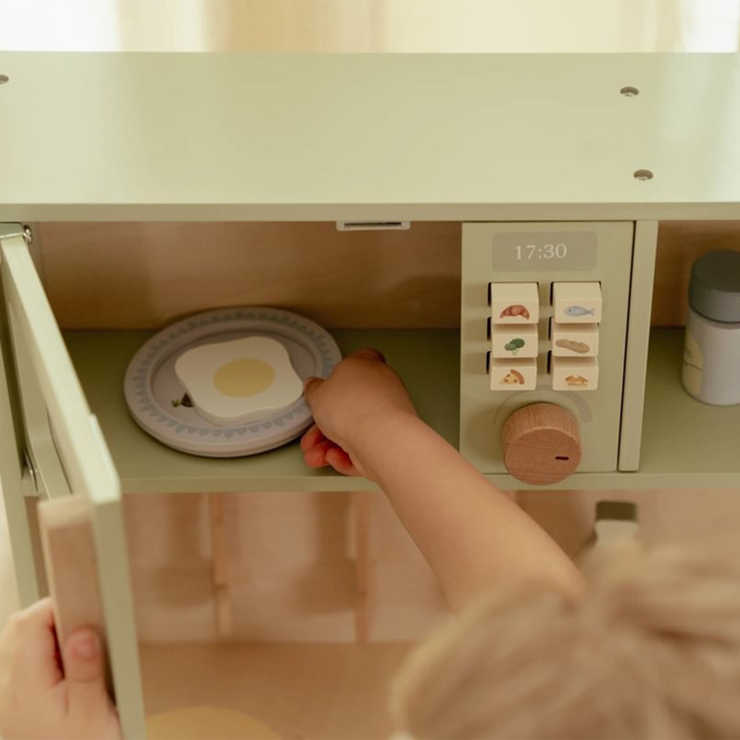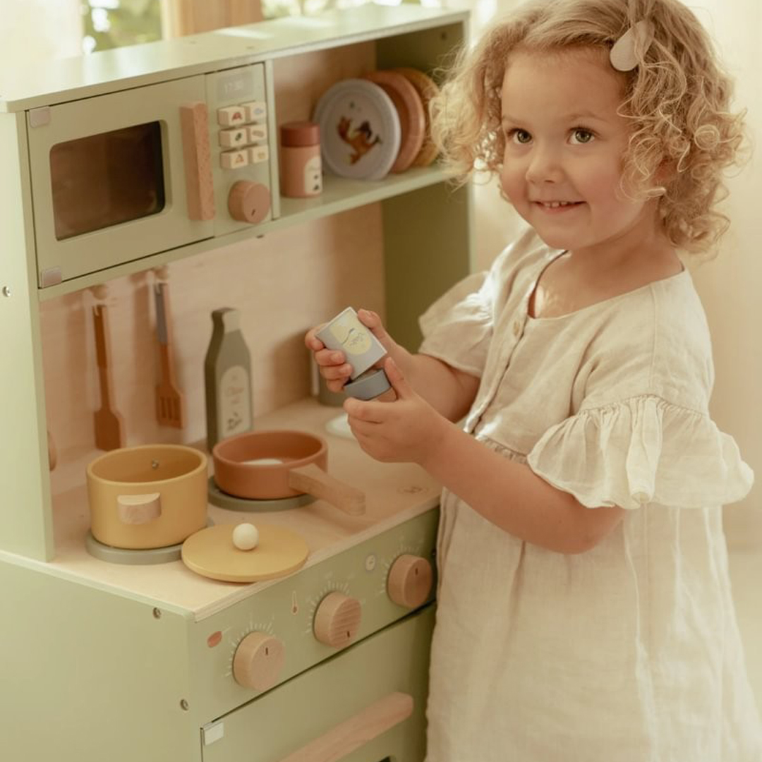 ¡A cocinar! Con esta súper cocina de madera los peques se convertirán en auténticos chefs. Pueden hornear un delicioso pastel en el horno, cocinar vegetales en el fuego, freír un huevo en la sartén o lavarse las manos en el fregadero antes de comenzar a cocinar. La cocina está completamente equipada con un cazo, una sartén, utensilios de cocina, tres platos, un set de sal y pimienta, una botella de aceite de oliva, un armario para guardar los comestibles, además de horno y microondas con mandos giratorios y botones con ilustraciones para mayor diversión.