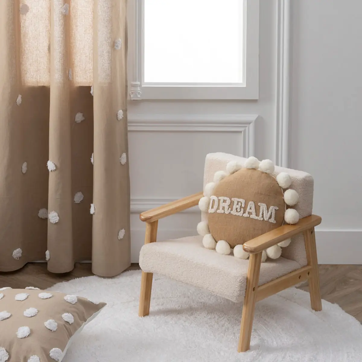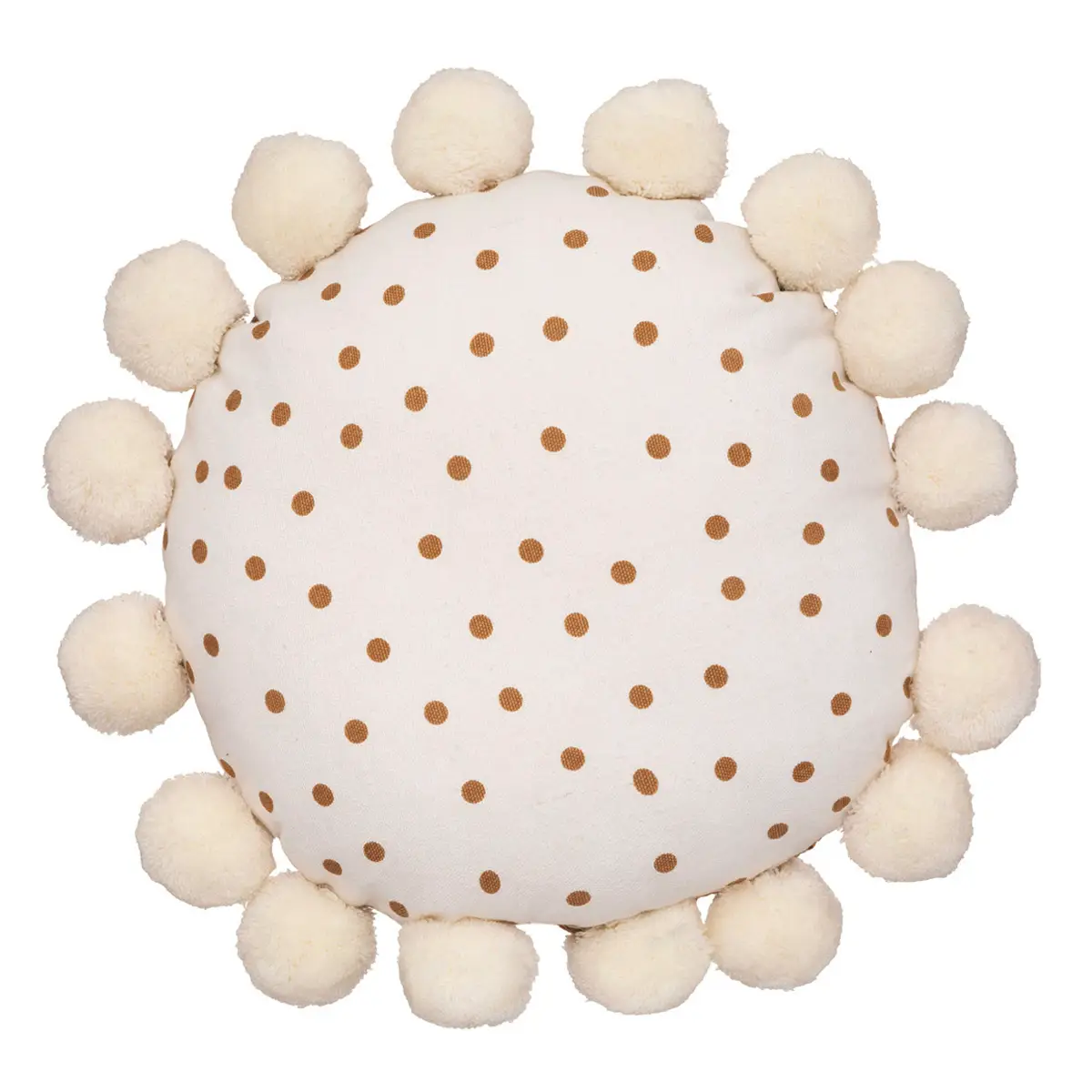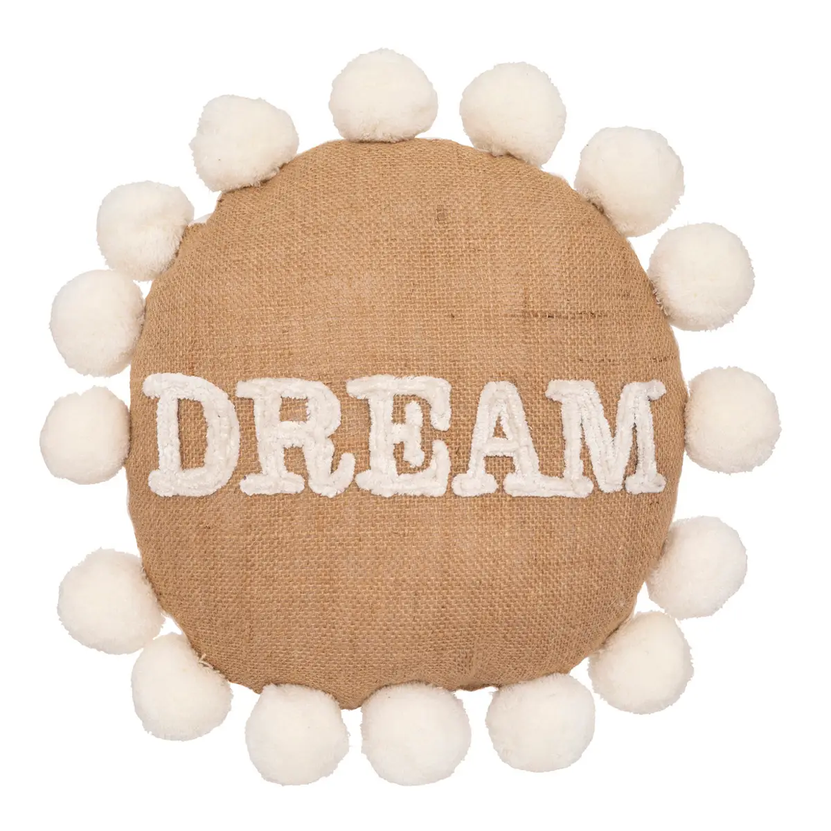 Cojín lleno con la palabra DREAM en relieve por un lado y con topos por el otro lado, también tiene divertidos pompones. Es ideal para decorar la habitación infantil.