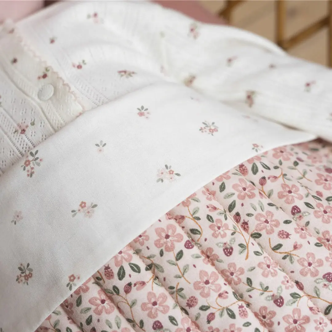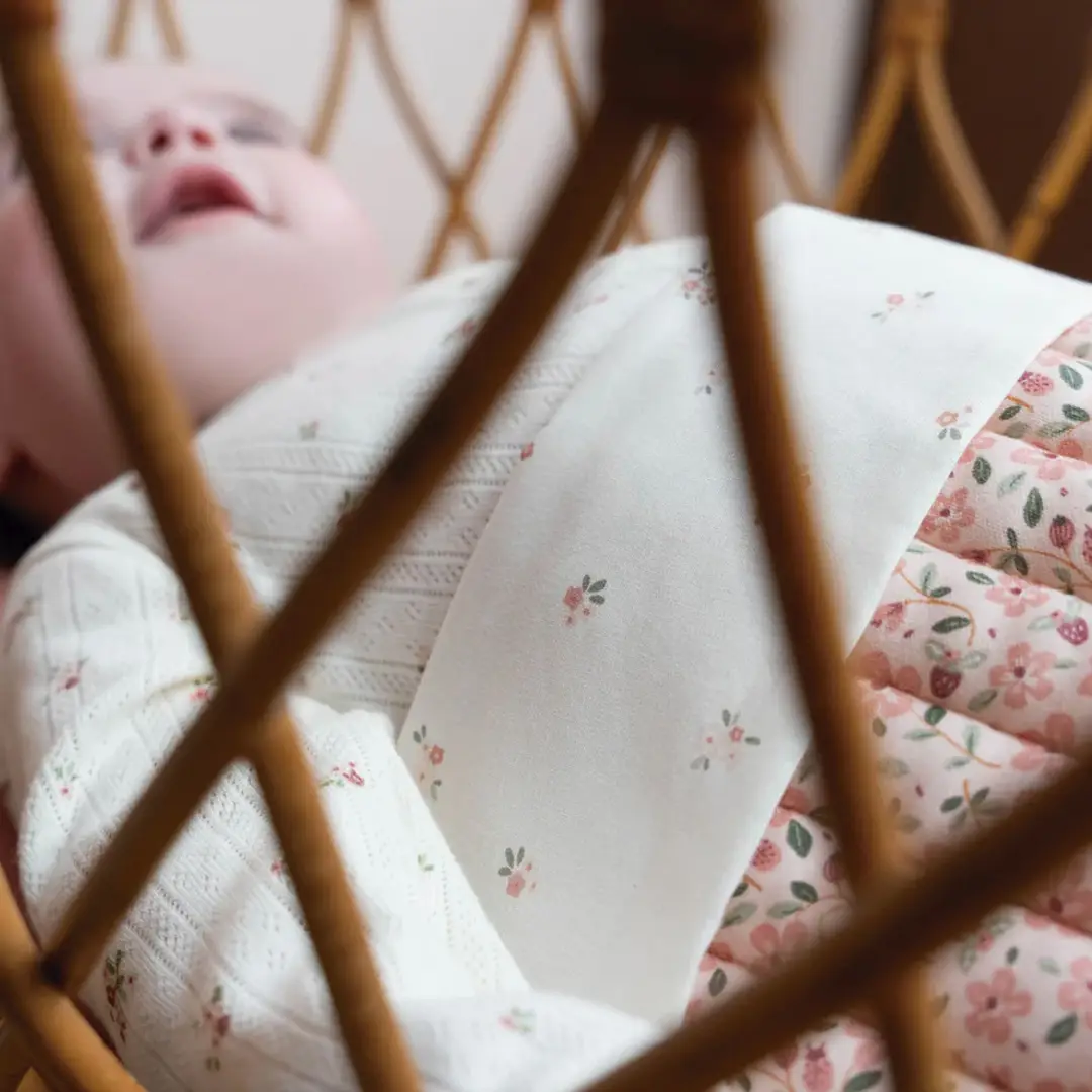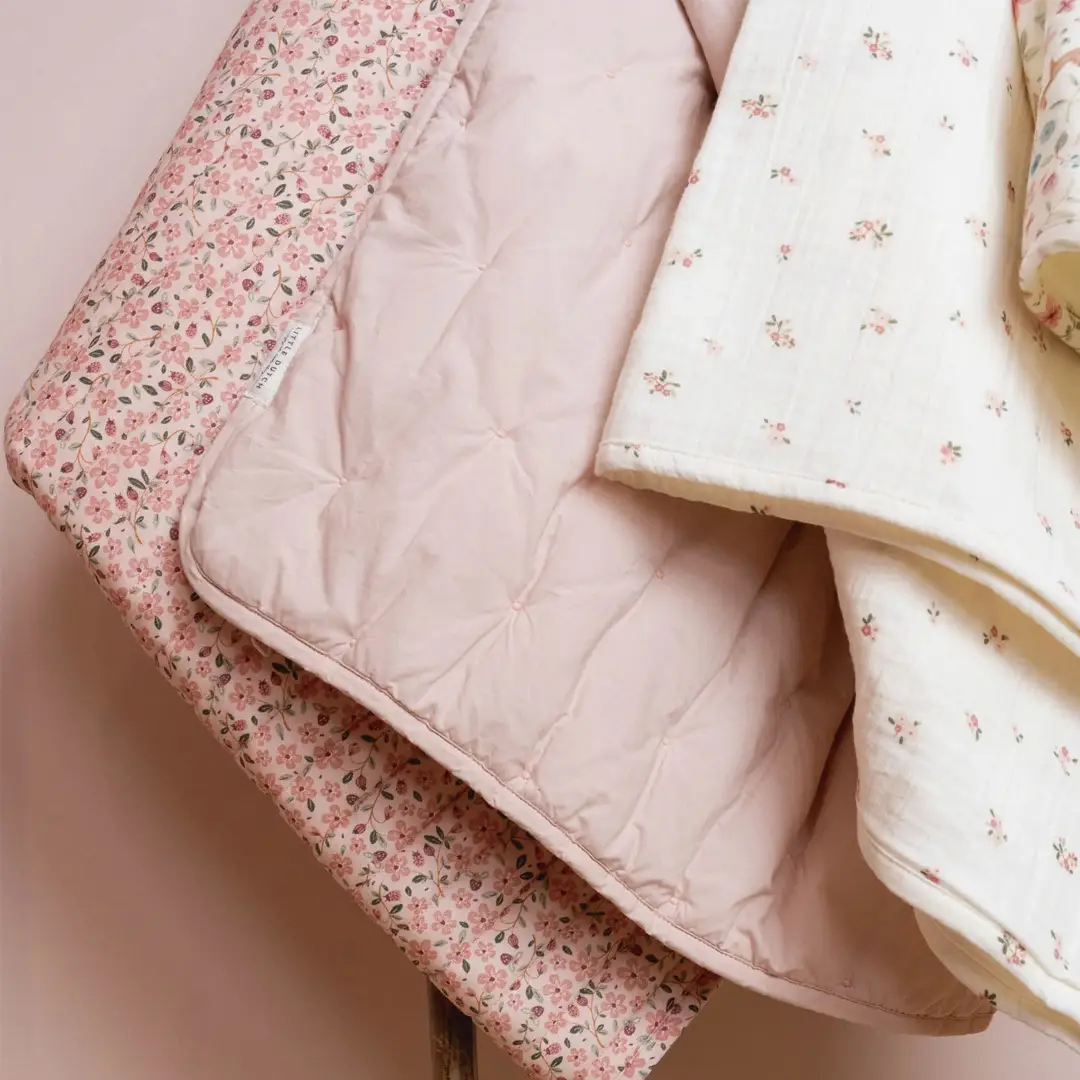 Manta ligeramente acolchada con rayas, calidad interlock suave y con dos bonitos estampados de la colección Fairy Garden, el alegre estampado Fairy Floral por un lado y el sutil estampado Fairy Blossom por el otro.