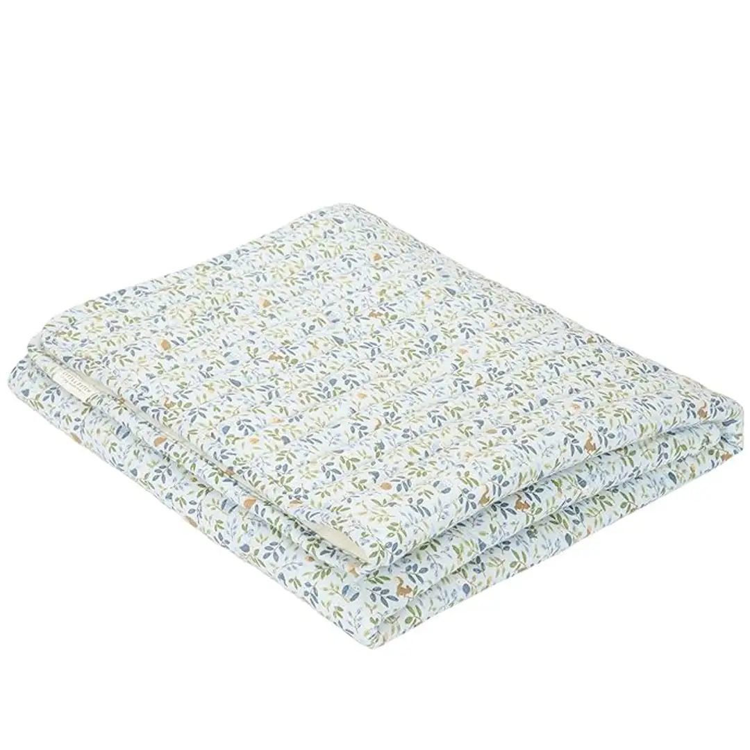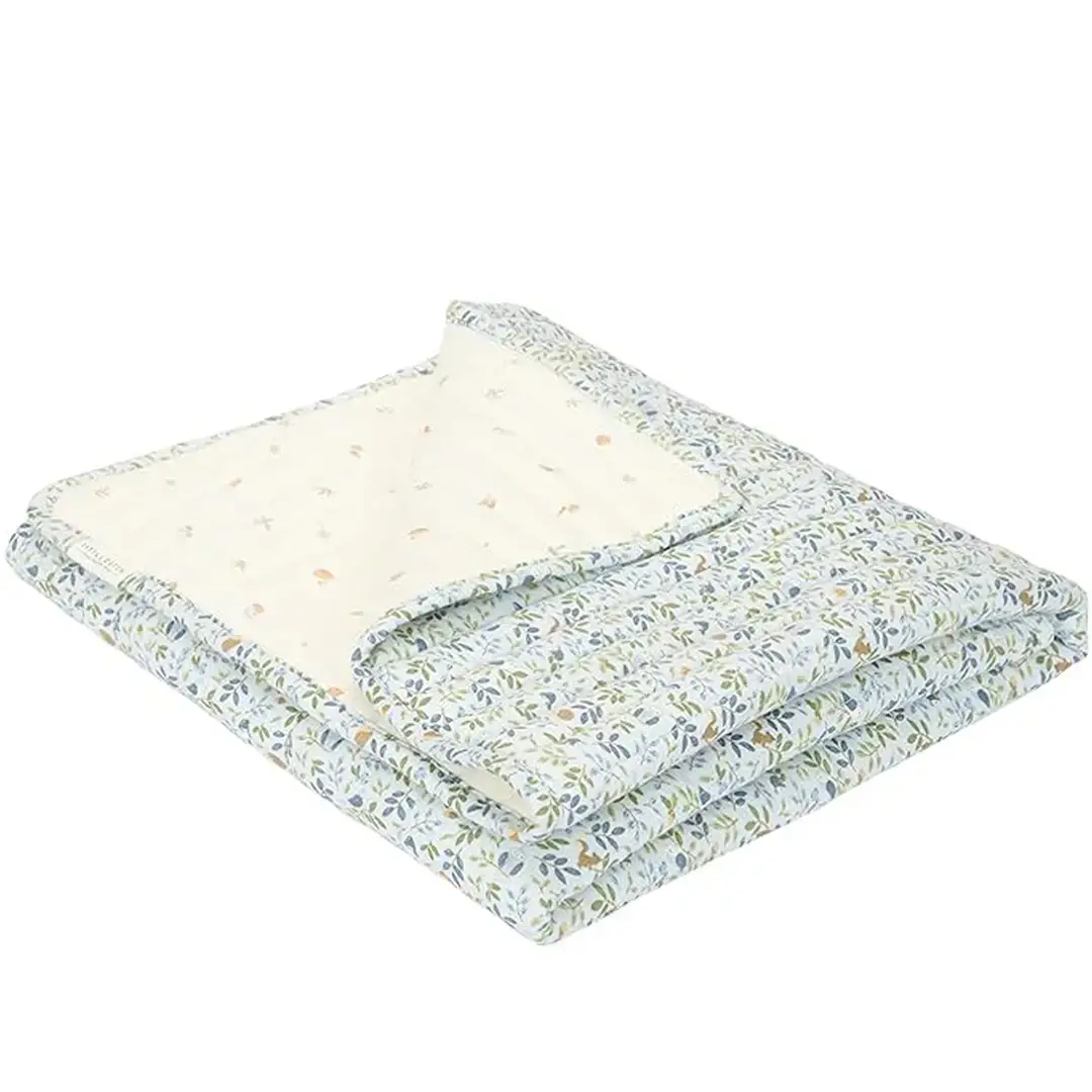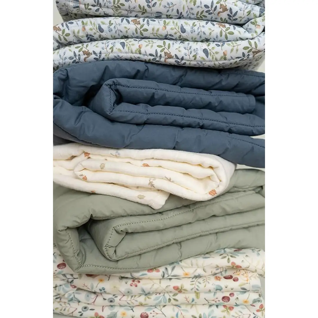 Manta ligeramente acolchada con rayas, calidad interlock suave y con dos bonitos estampados de la colección Forest Friends, el alegre estampado Forest Adventure por un lado y el sutil estampado Forest Treasures por el otro.