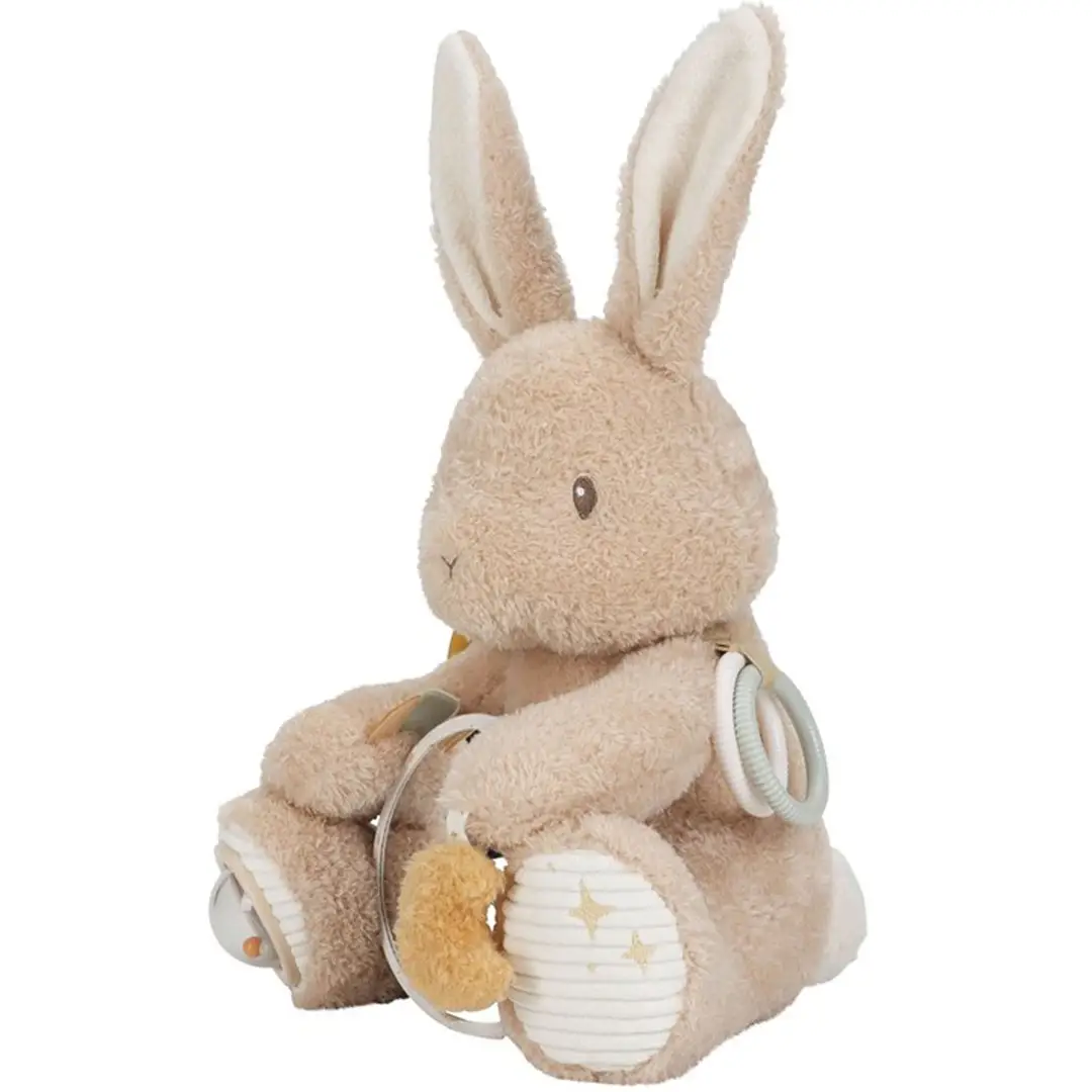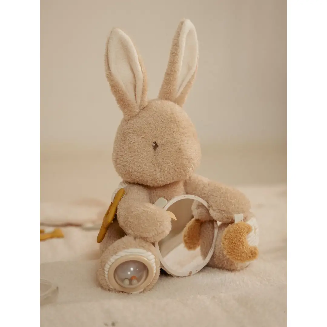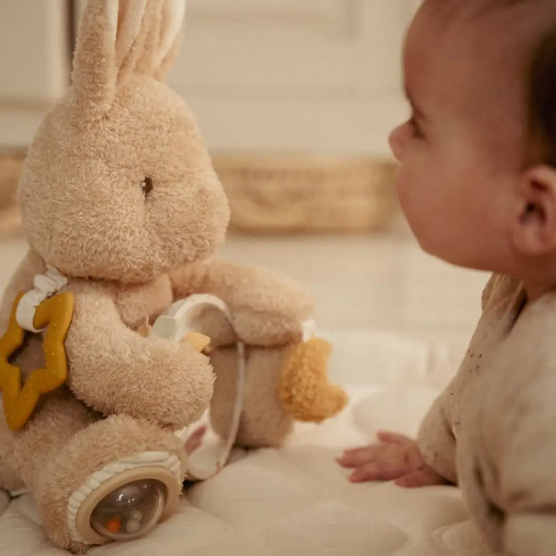 Este dulce conejito, además de ser muy suave y blandito, contiene muchas actividades que estimulan los sentidos del bebé y despiertan su curiosidad: un espejo, sonidos de cascabel, etiquetas… ¡mucho por descubrir y jugar!