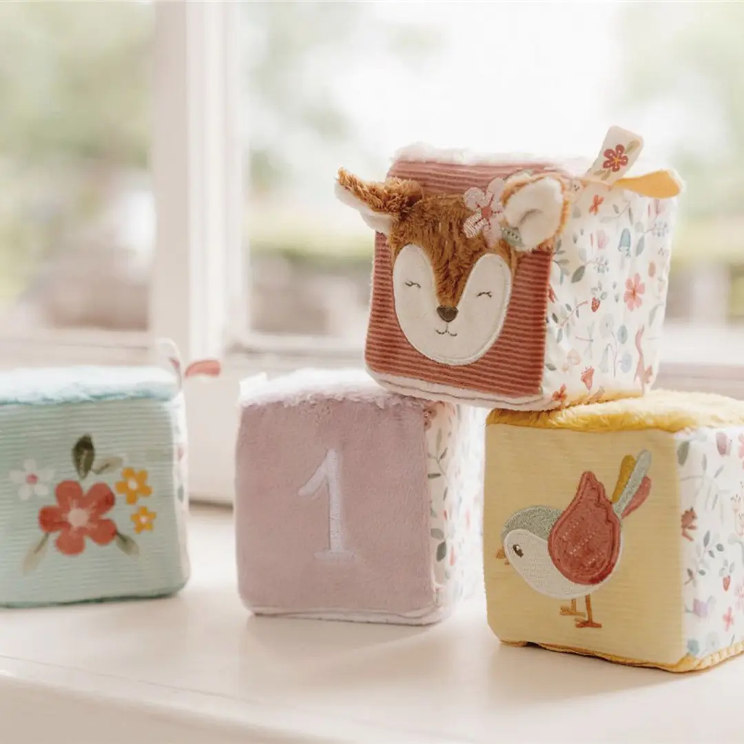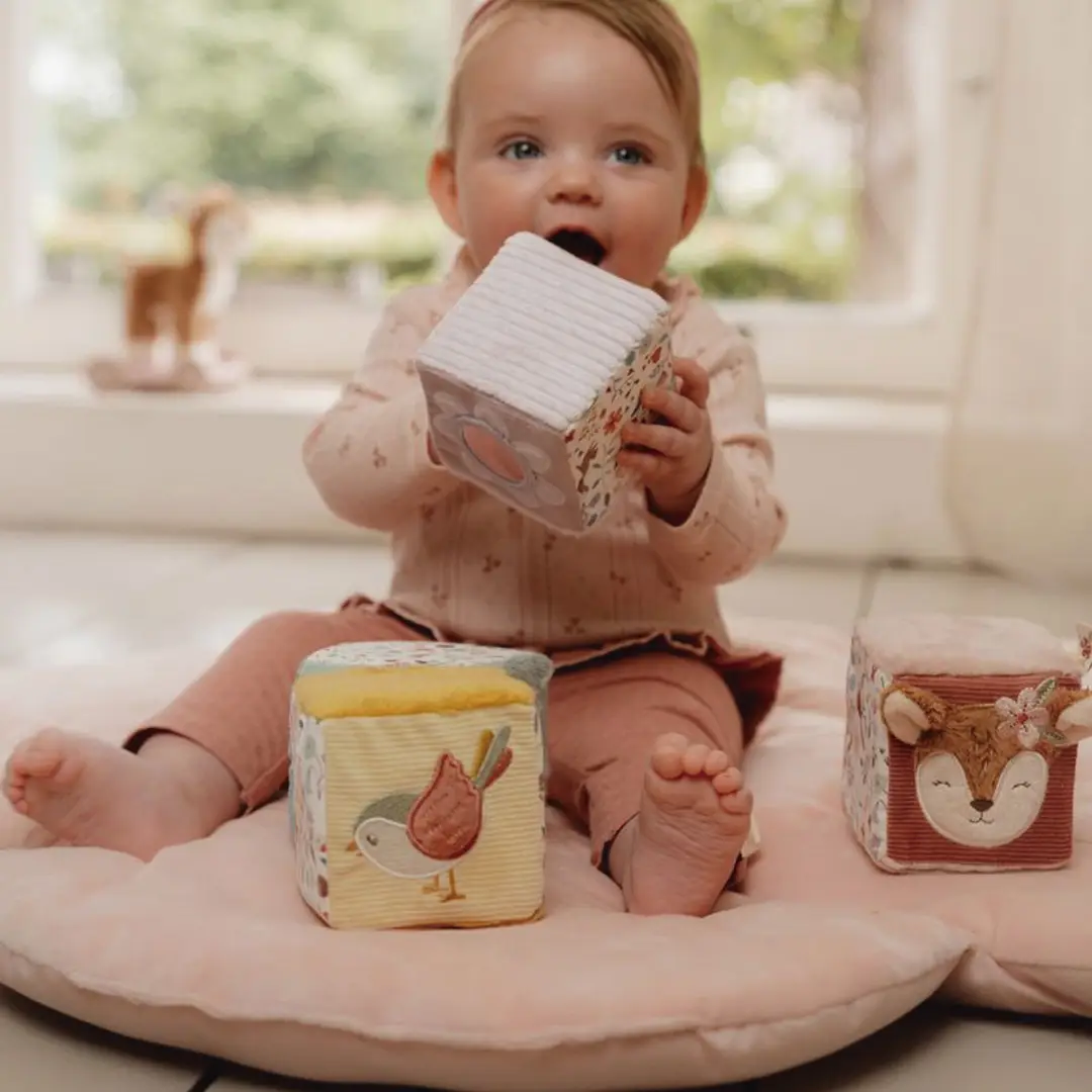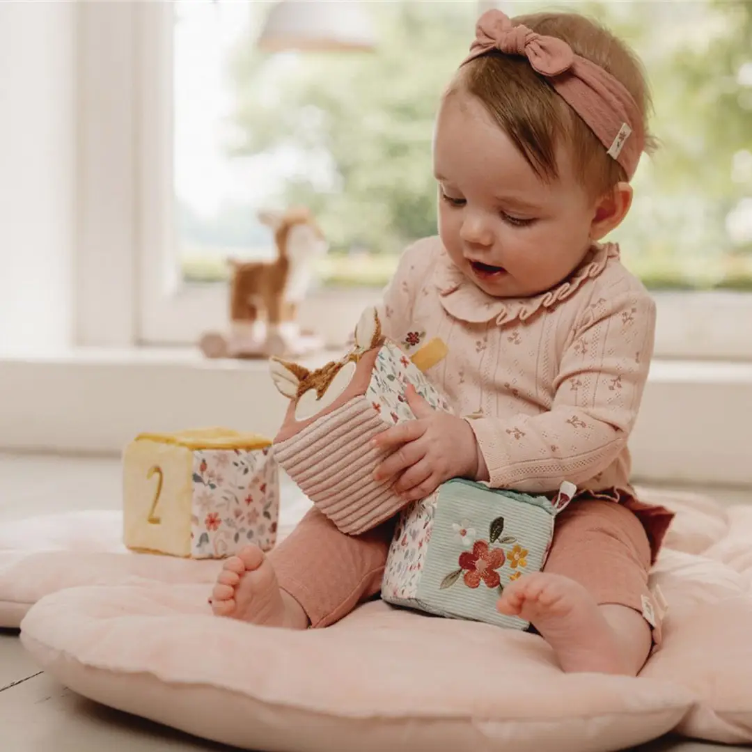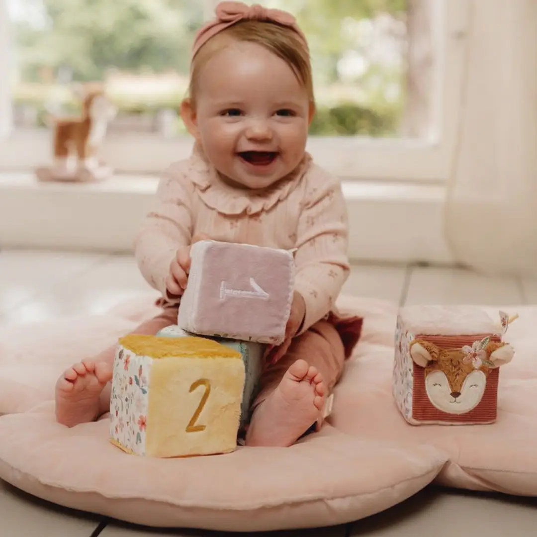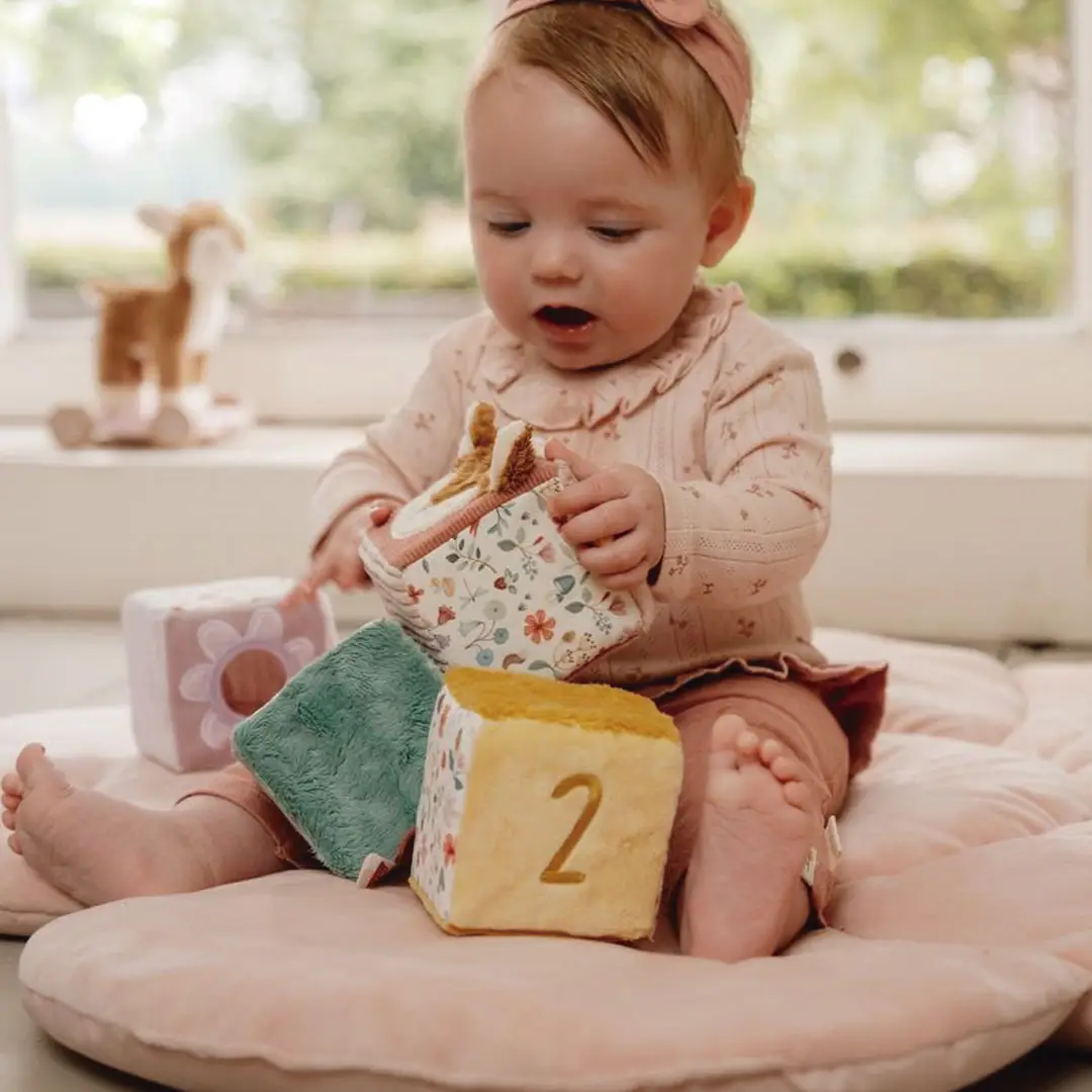 Conjunto de cuatro cubos blanditos apilables, cada uno contiene diferentes actividades que estimulan los sentidos del bebé: colores, etiquetas, texturas, que fomentan el juego sensorial y la coordinación mano-ojo. El bebé también descubrirá un espejo, un sonajero… ¡Mucho por descubrir y jugar!