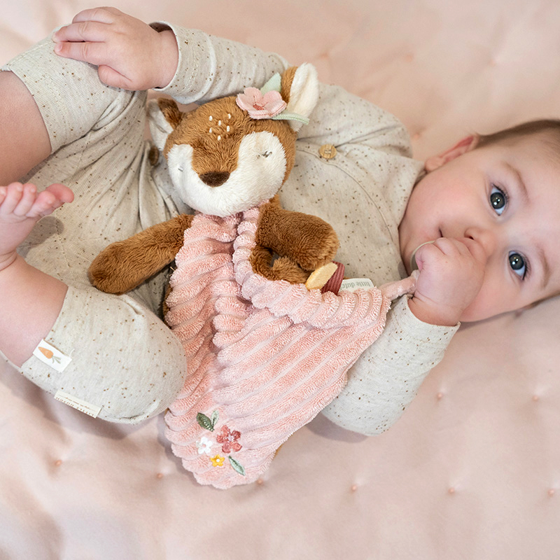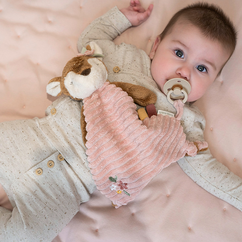 Este adorable doudou es súper suave para que el bebé lo abrace y lo use como mantita de apego. Tiene diferentes texturas y etiquetas para tocar y sentir, lo que estimula los sentidos del bebé. También puedes sujetar un chupete a él.