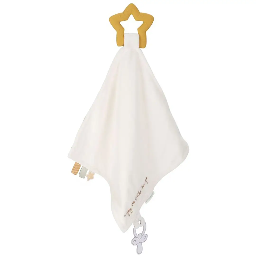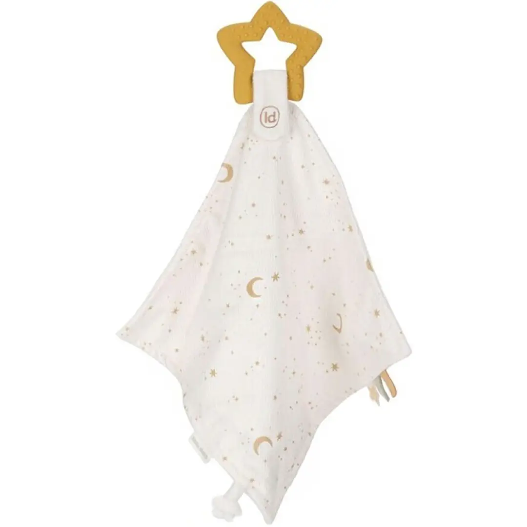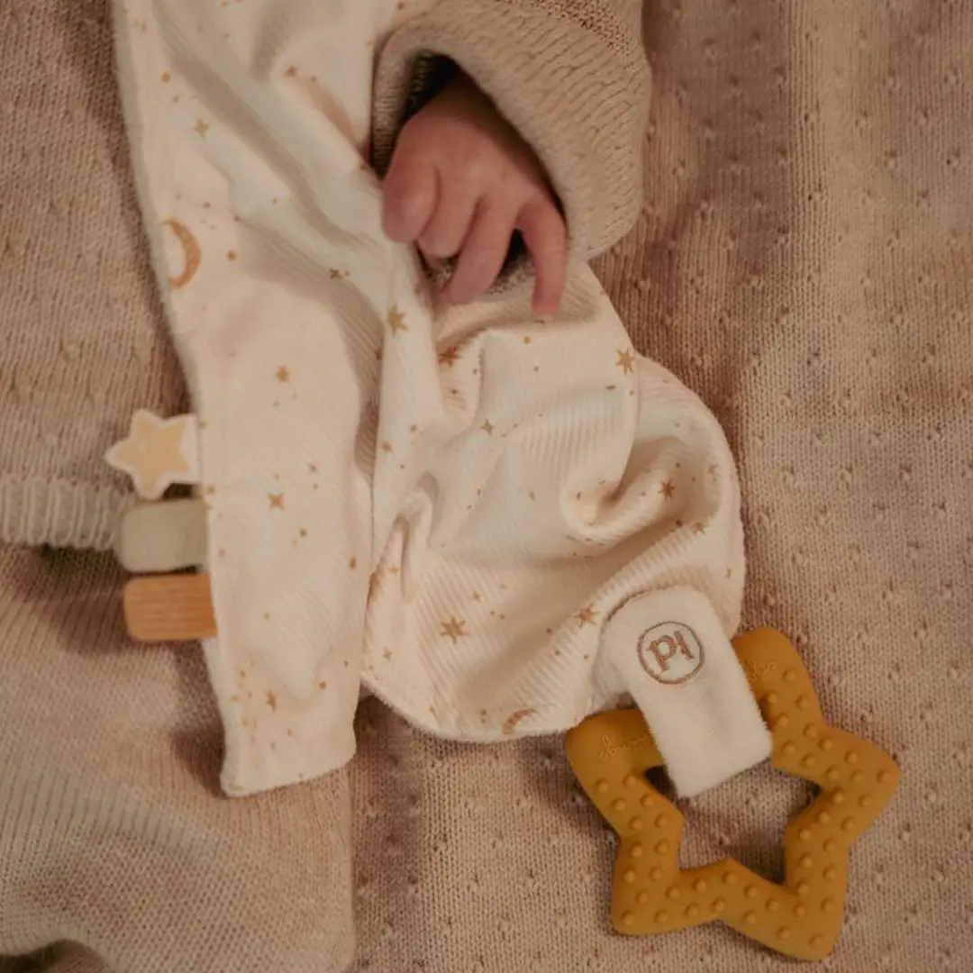 Este bonito doudou con mordedor ofrece la combinación perfecta, el paño suave proporciona una sensación de seguridad, mientras que el mordedor alivia las encías. Es ligero y fácil de sujetar, ideal para las manitas pequeñas. Tiene diferentes texturas y etiquetas para tocar y sentir, lo que estimula los sentidos del bebé. También puedes sujetar un chupete a él.