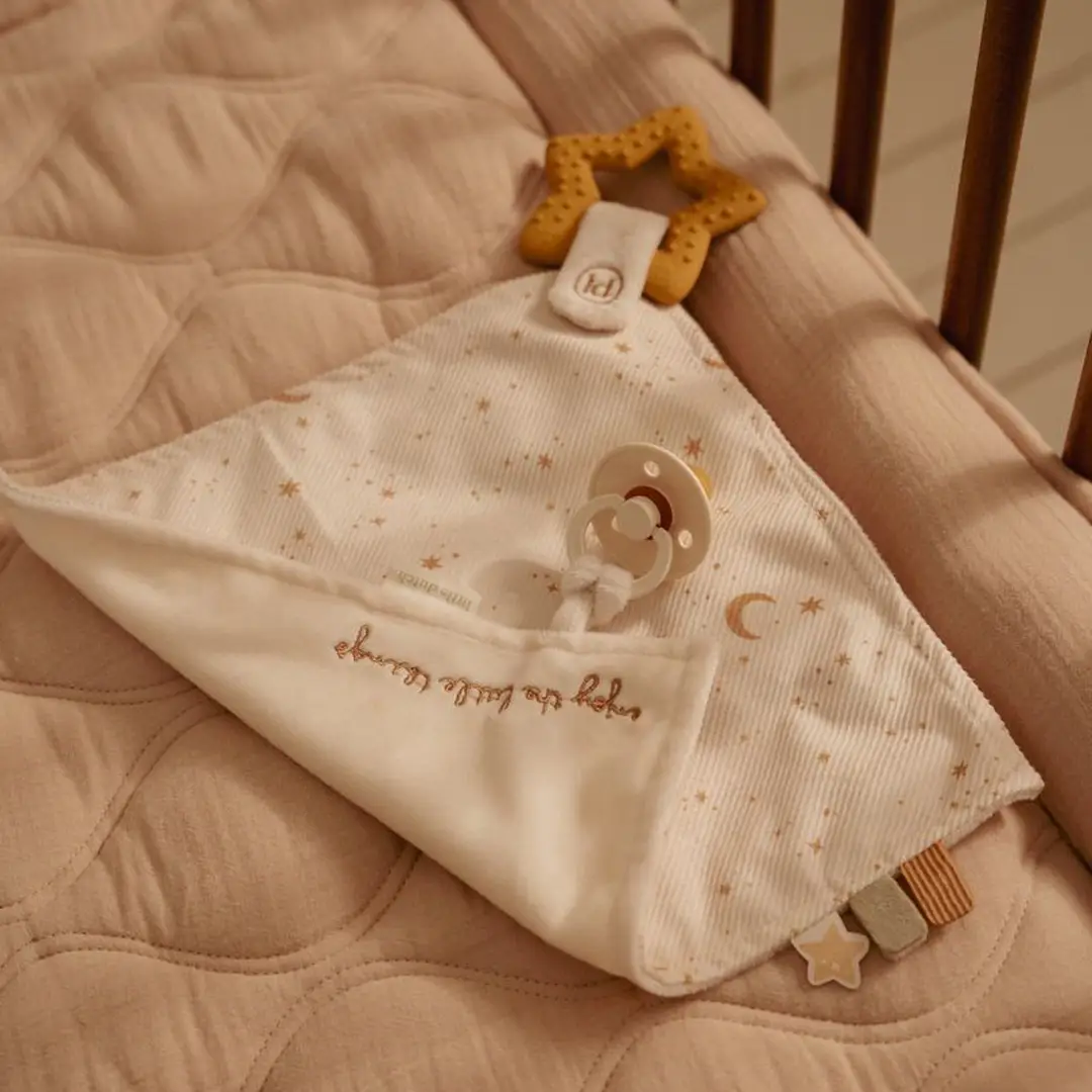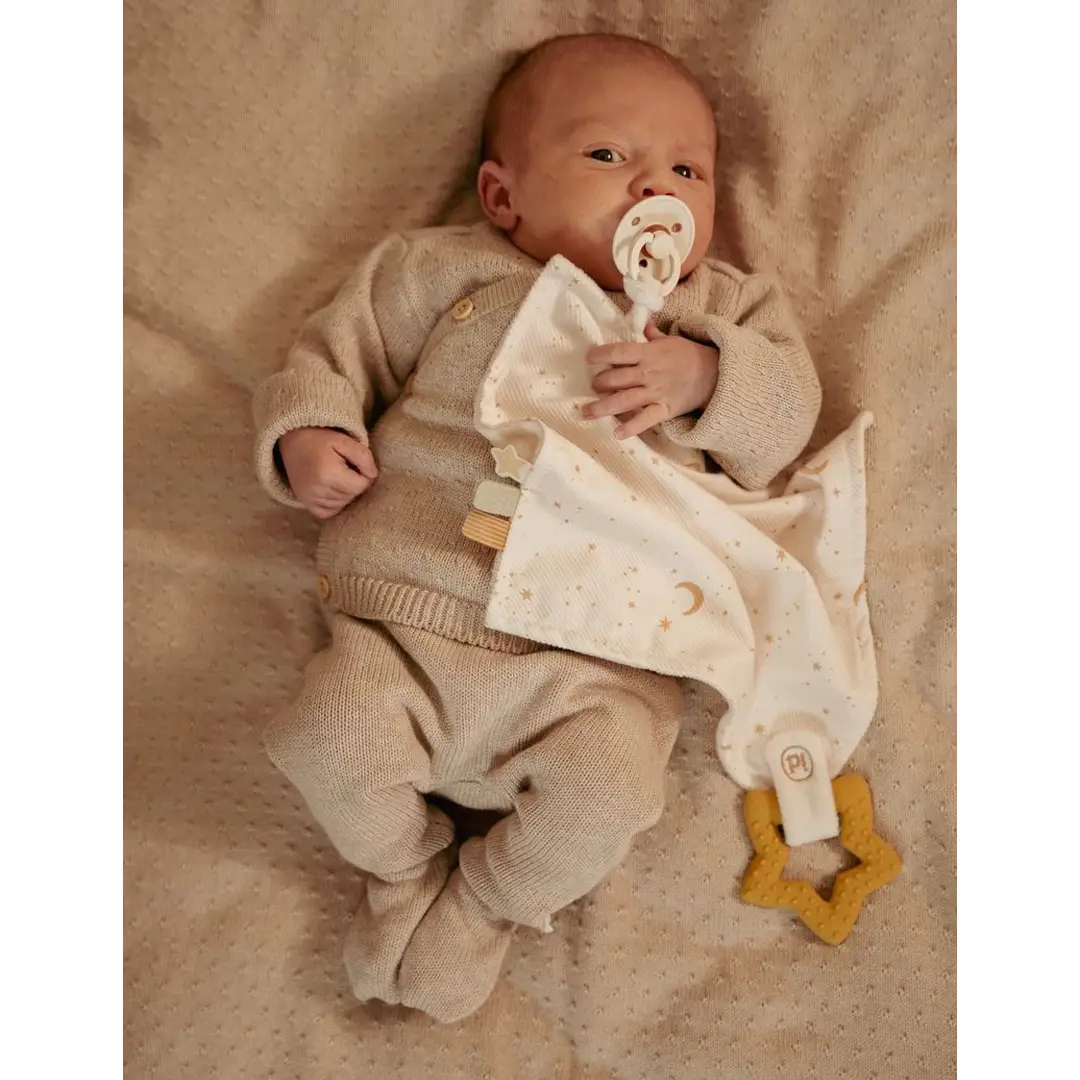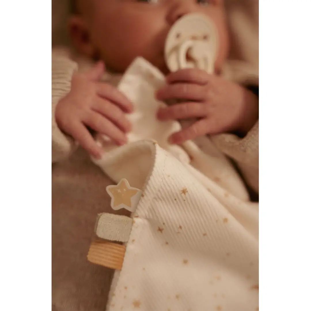 Este bonito doudou con mordedor ofrece la combinación perfecta, el paño suave proporciona una sensación de seguridad, mientras que el mordedor alivia las encías. Es ligero y fácil de sujetar, ideal para las manitas pequeñas. Tiene diferentes texturas y etiquetas para tocar y sentir, lo que estimula los sentidos del bebé. También puedes sujetar un chupete a él.