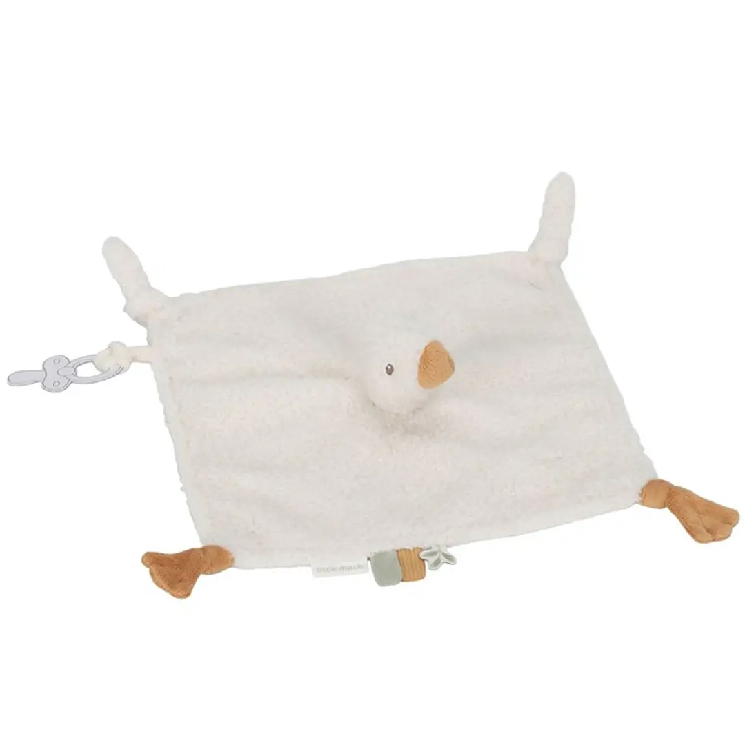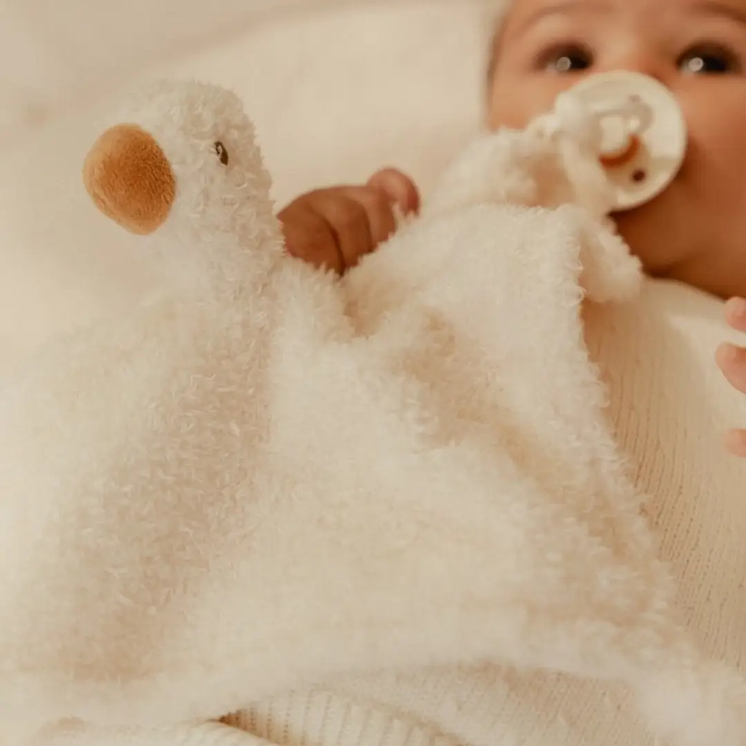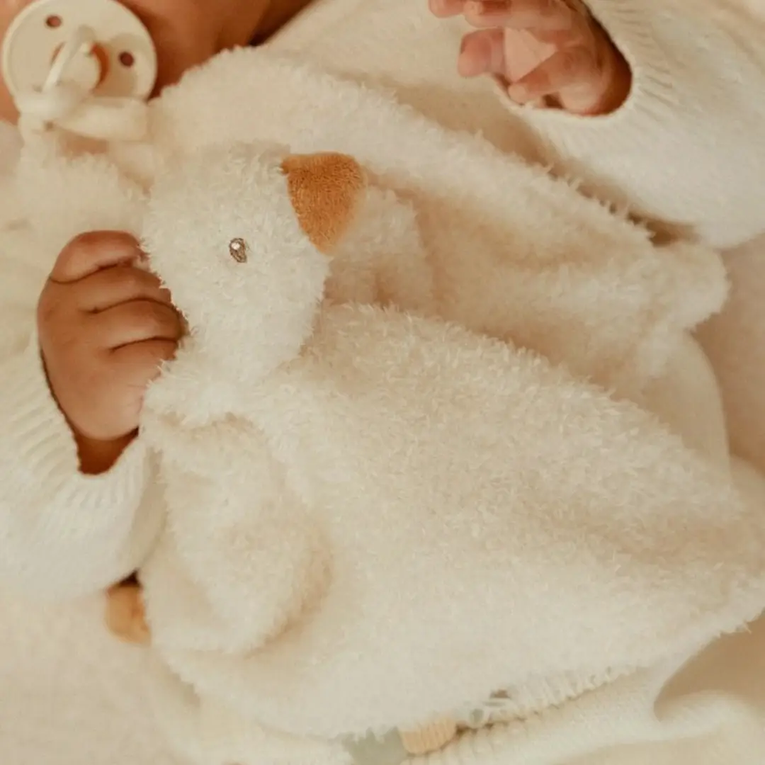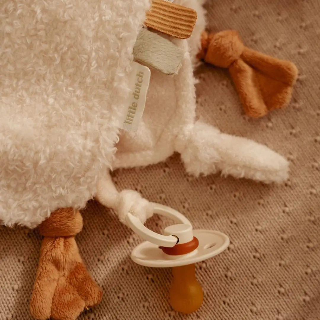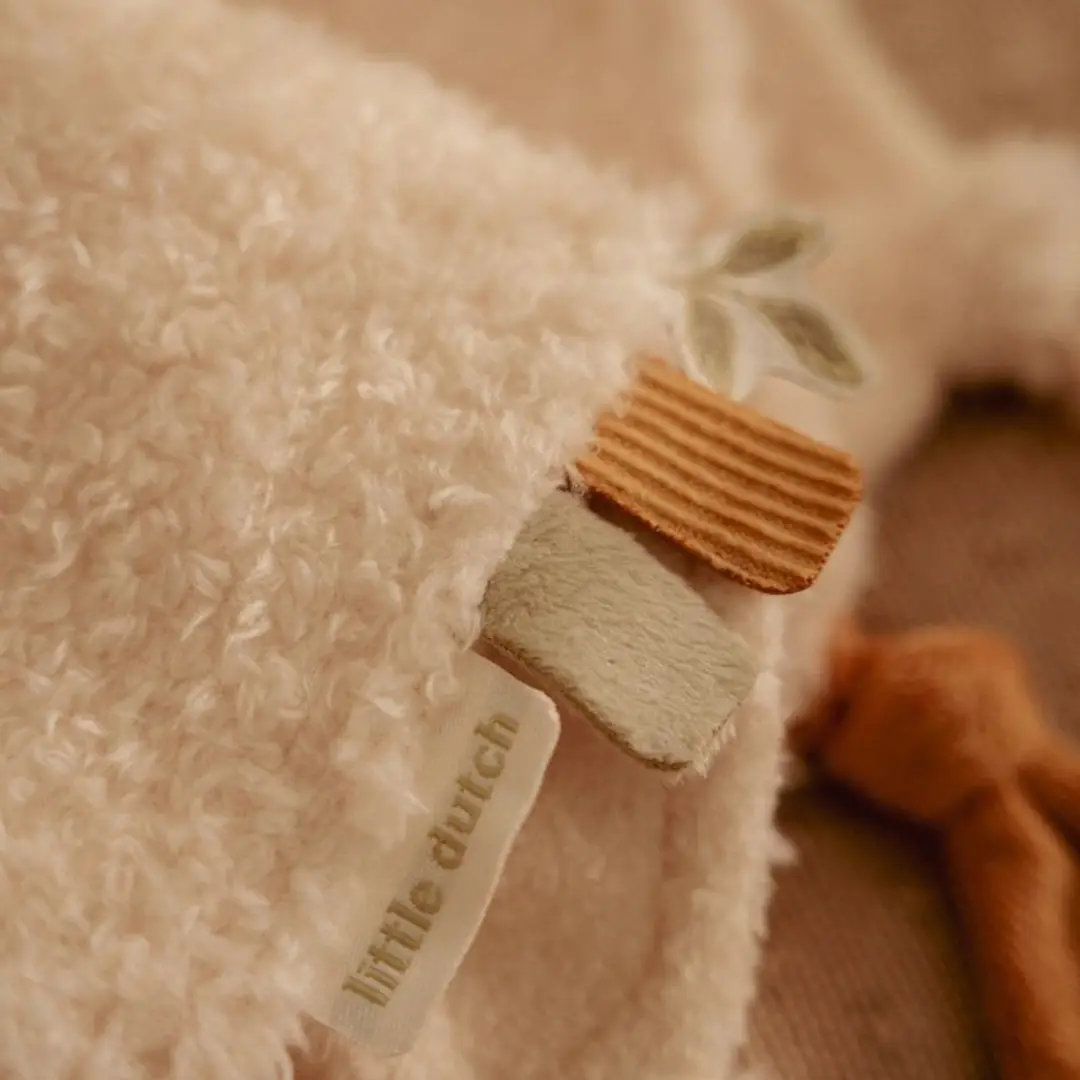 Este adorable doudou es súper suave para que el bebé lo abrace y lo use como mantita de apego. Tiene diferentes texturas y etiquetas para tocar y sentir, lo que estimula los sentidos del bebé. También puedes sujetar un chupete a él.