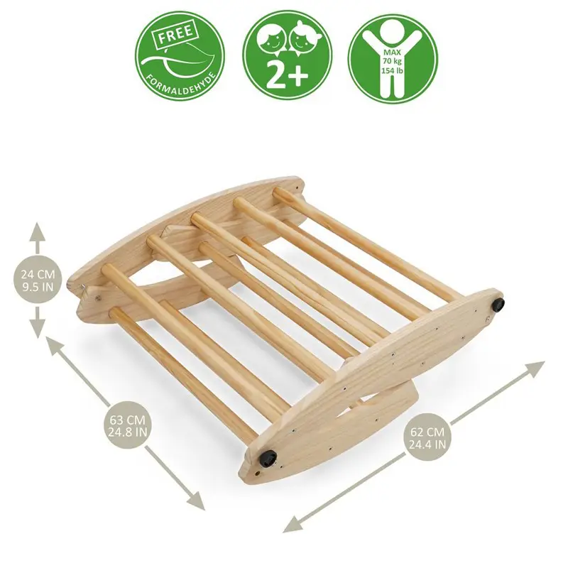 Estructura de escalada fabricada en madera de pino con bordes redondeados de acabado liso para que los niños estén cómodos y seguros durante el juego. Es perfecta para jugar tanto dentro como fuera de casa. Soporta un máximo de 70 kgs. Se pliega para almacenarla con facilidad.
