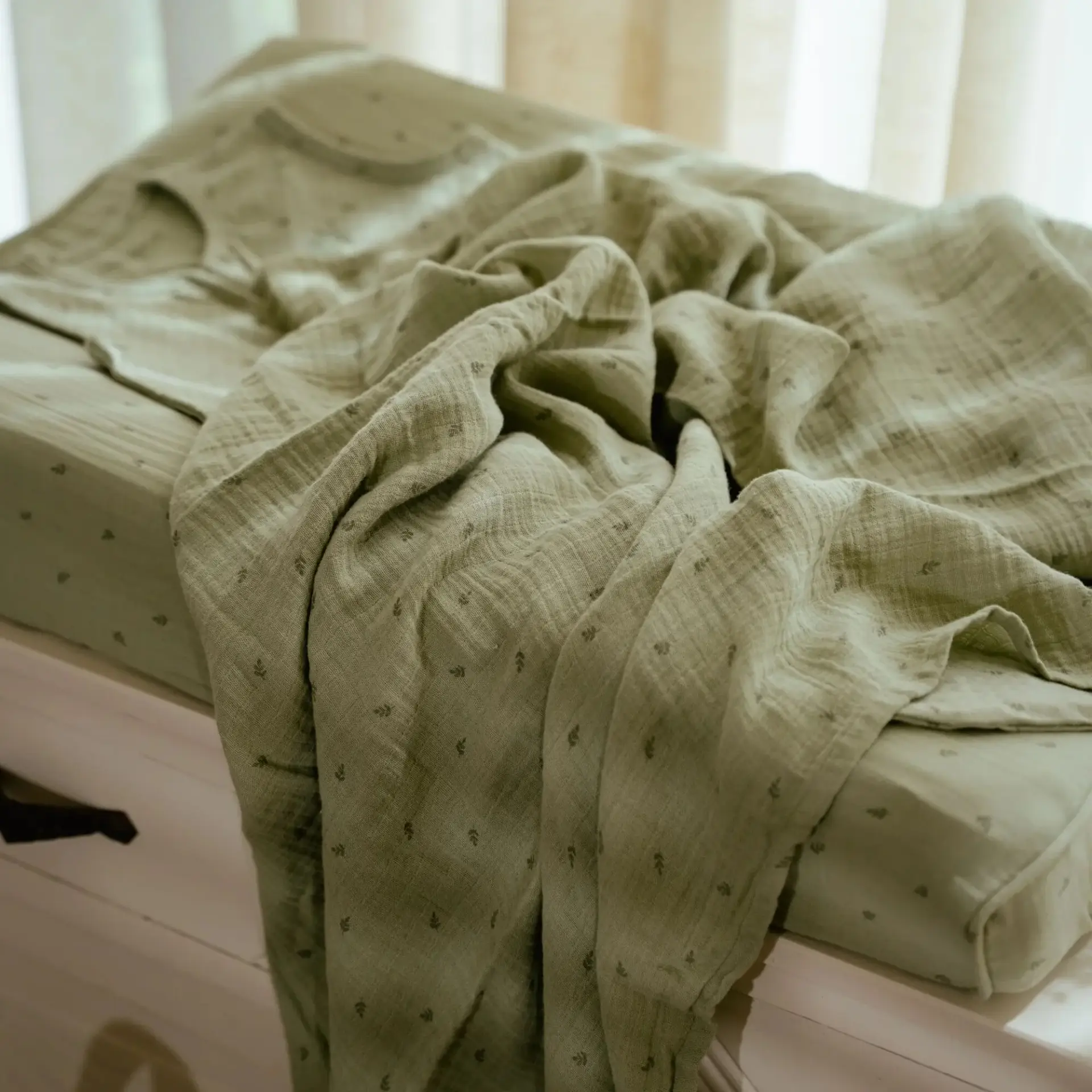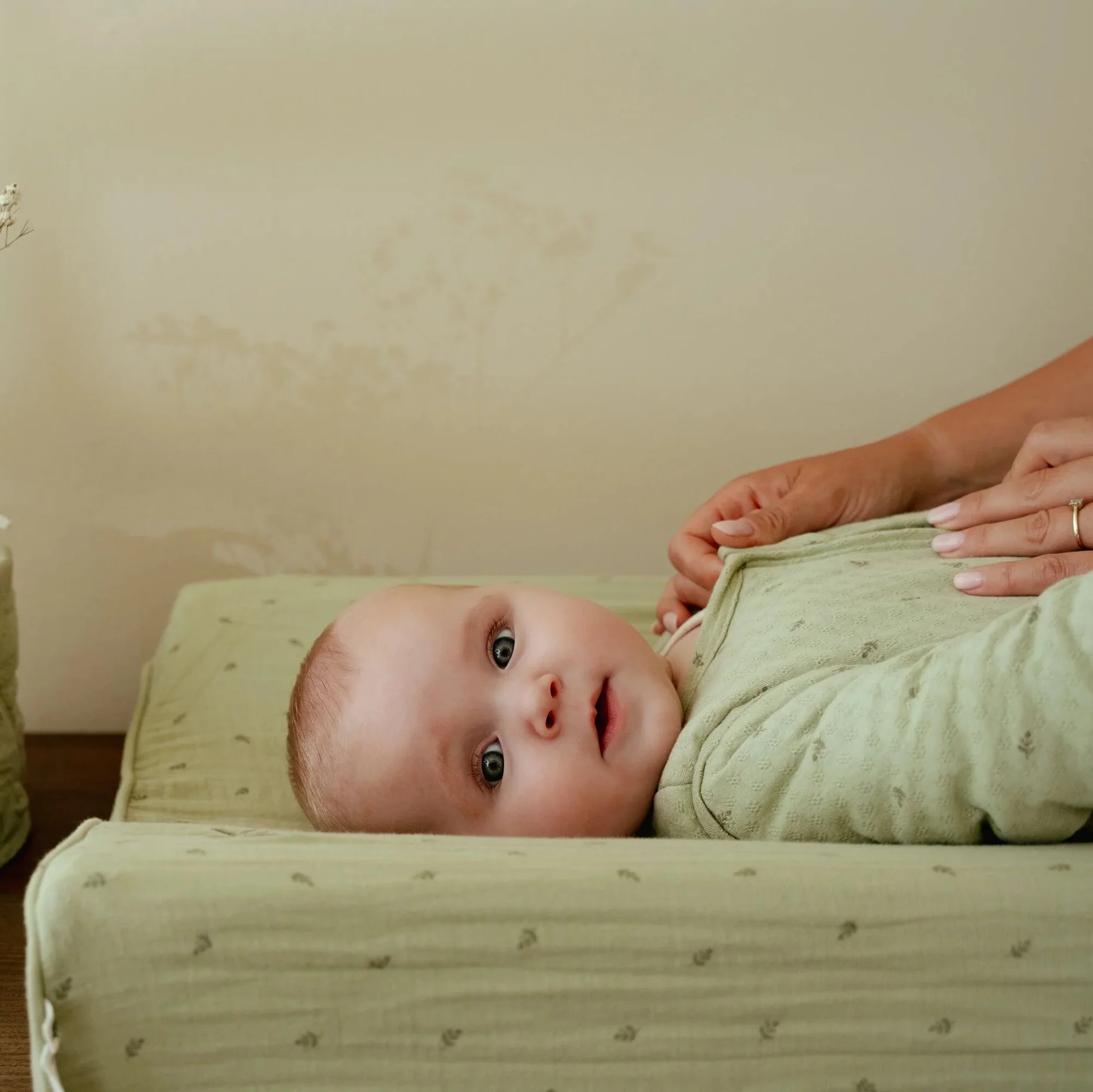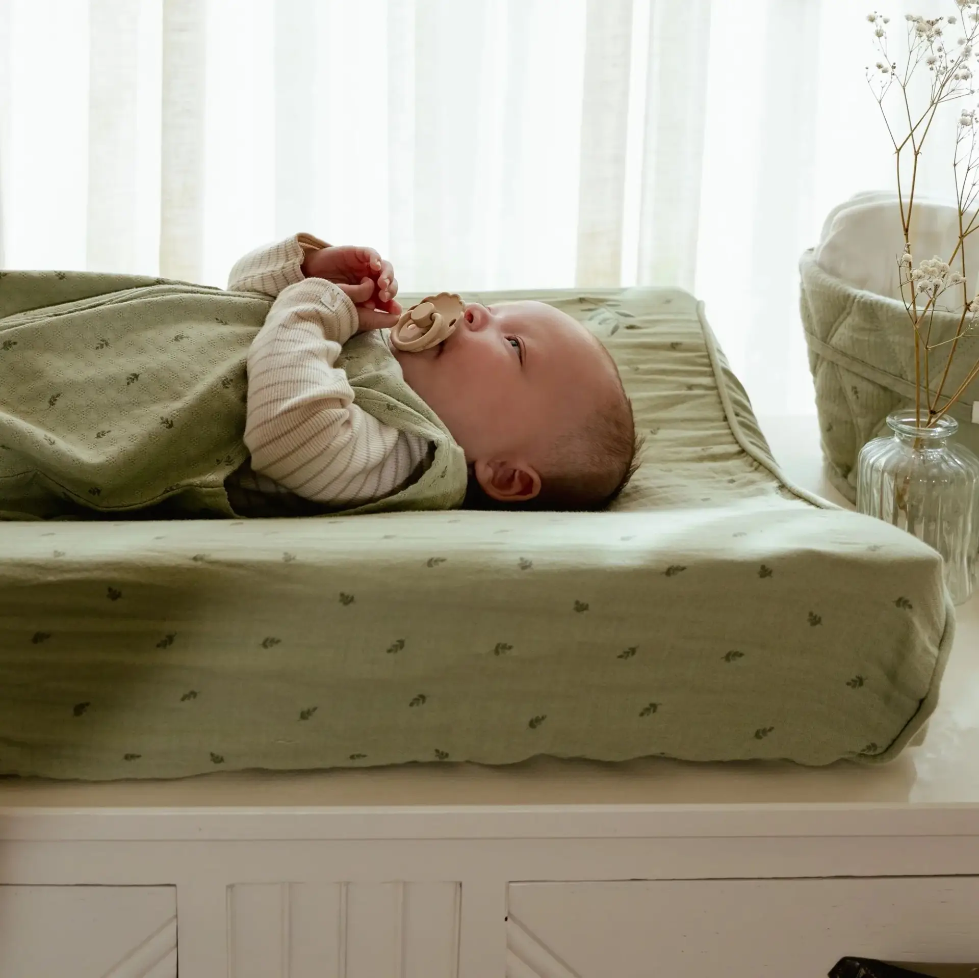 El cambiador de tu bebé no tiene por qué ser aburrido, vístelo con esta bonita funda en color verde con un sutil y elegante estampado de hojas y un pequeño bordado en una esquina. Además, la tela 100% algodón orgánico es muy suave y agradable.
