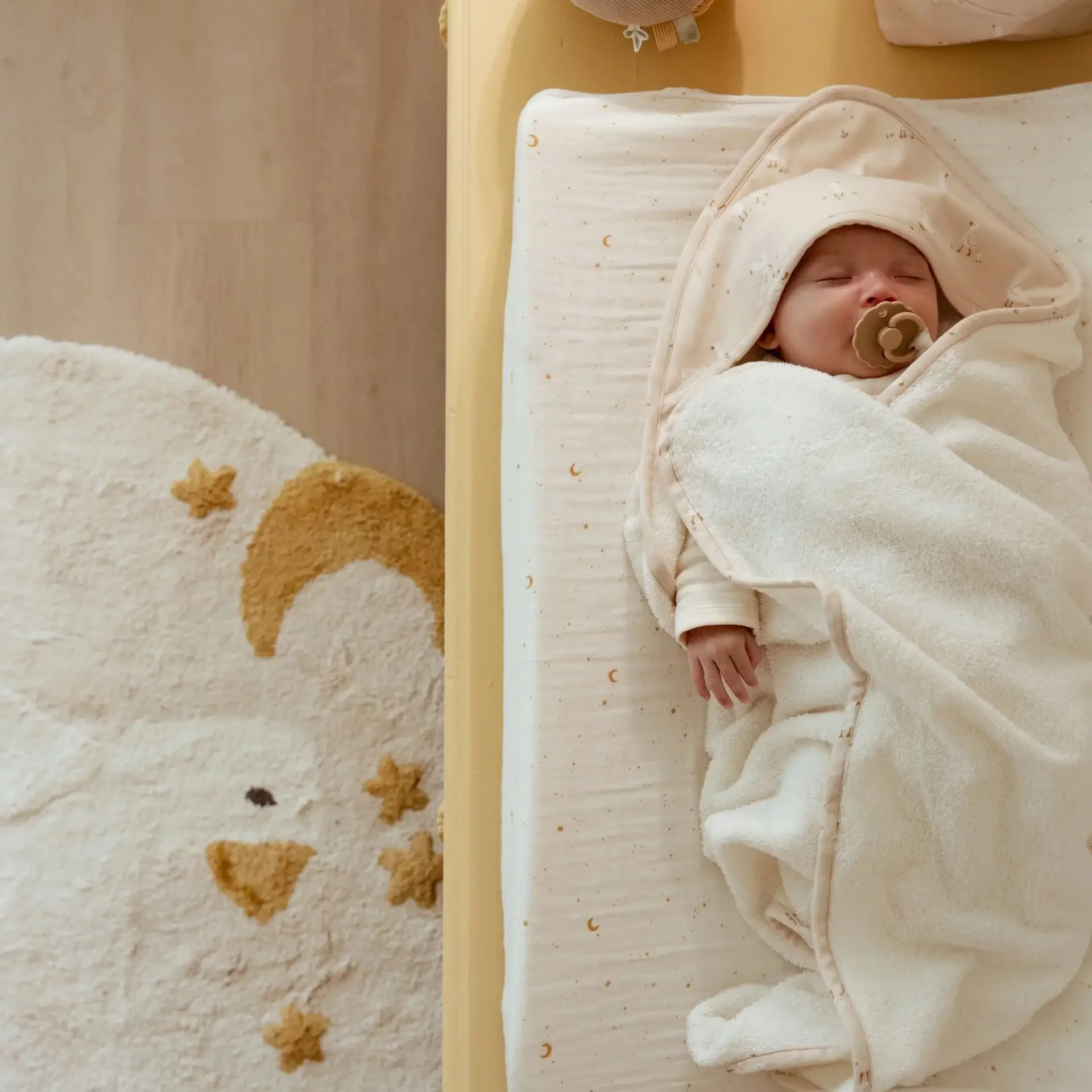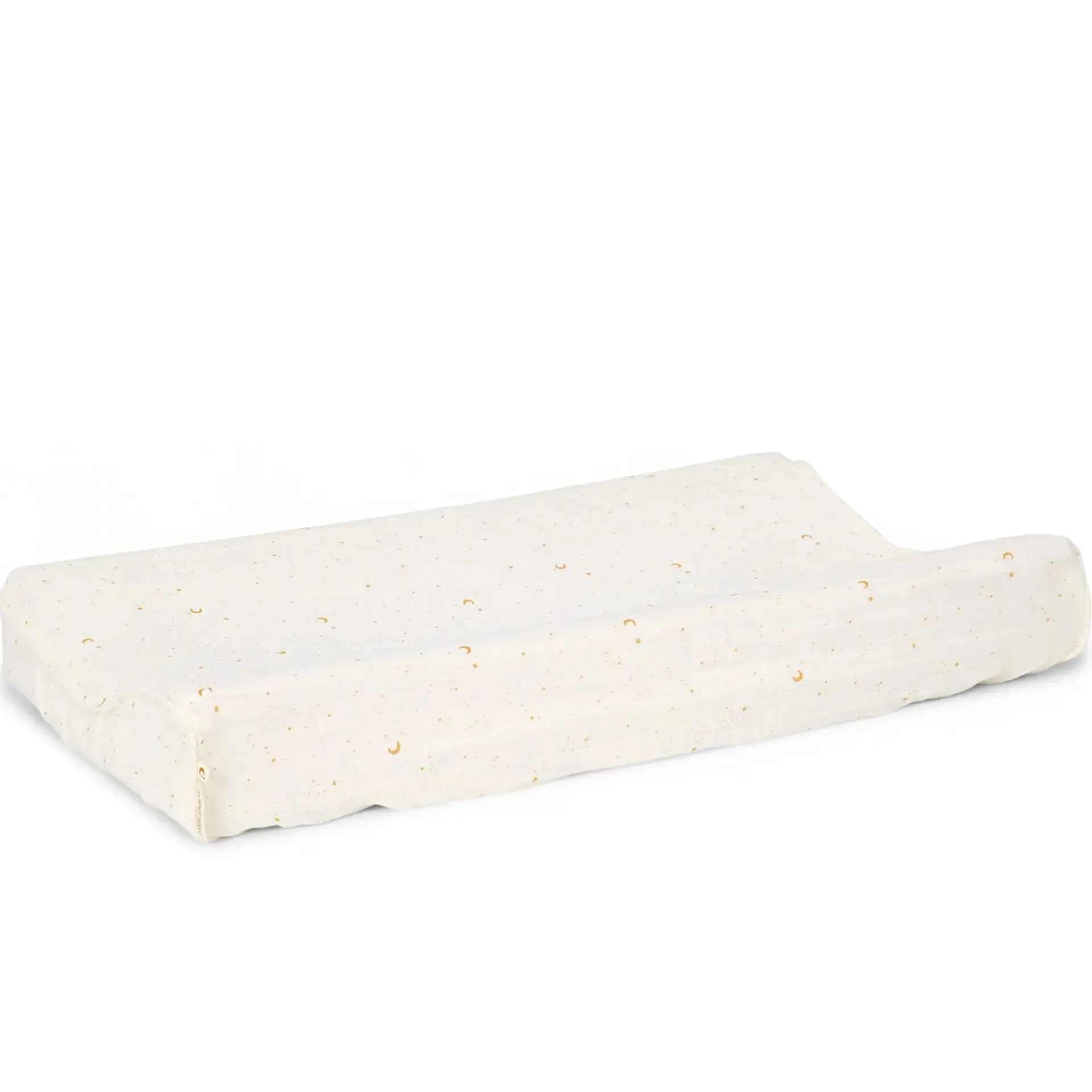 El cambiador de tu bebé no tiene por qué ser aburrido, vístelo con esta bonita funda con un estampado de lunas y estrellas en dorado. Además, la tela en tejido muselina es muy suave y transpirable.