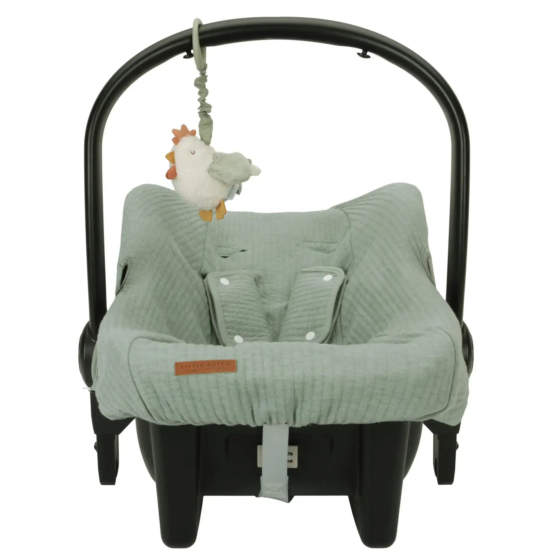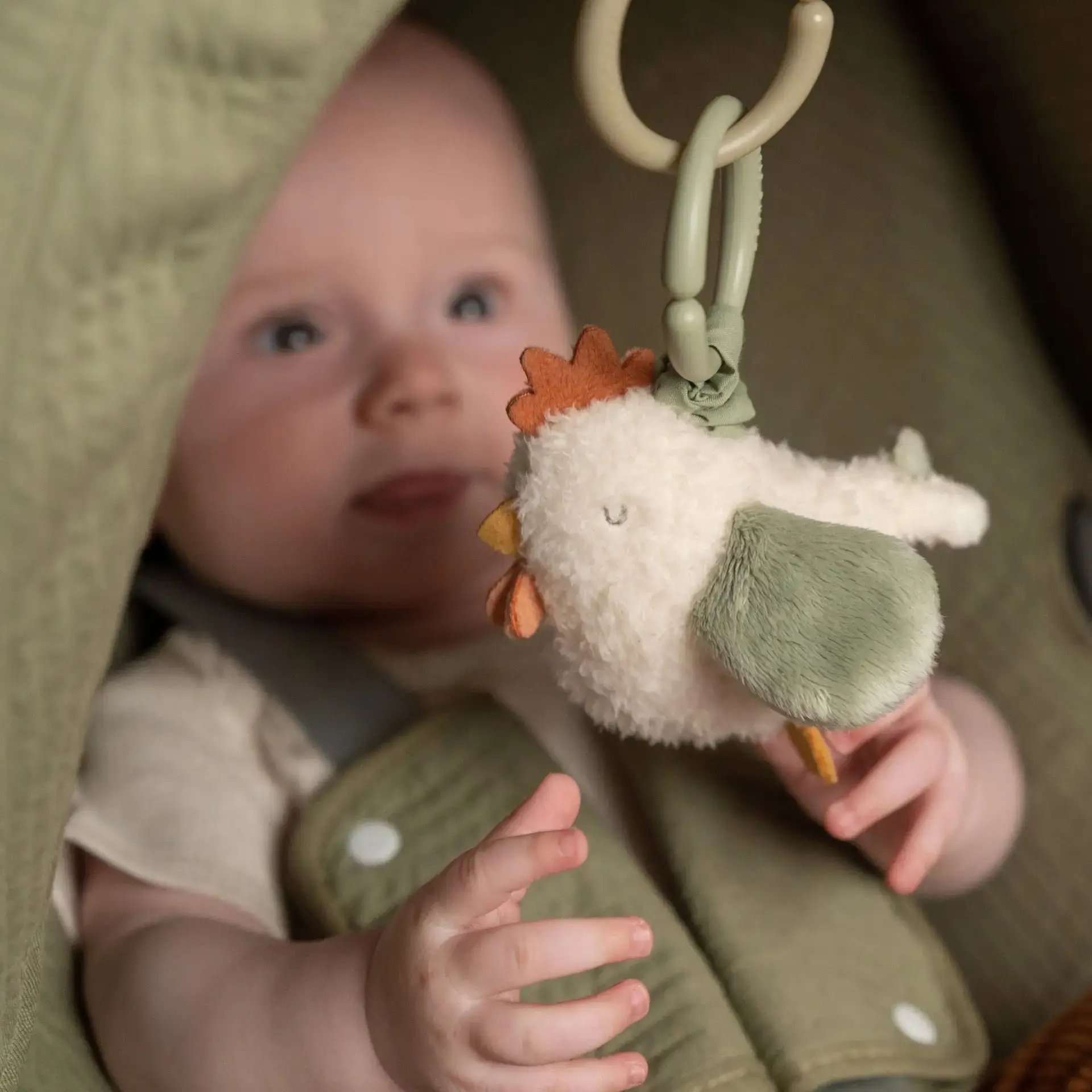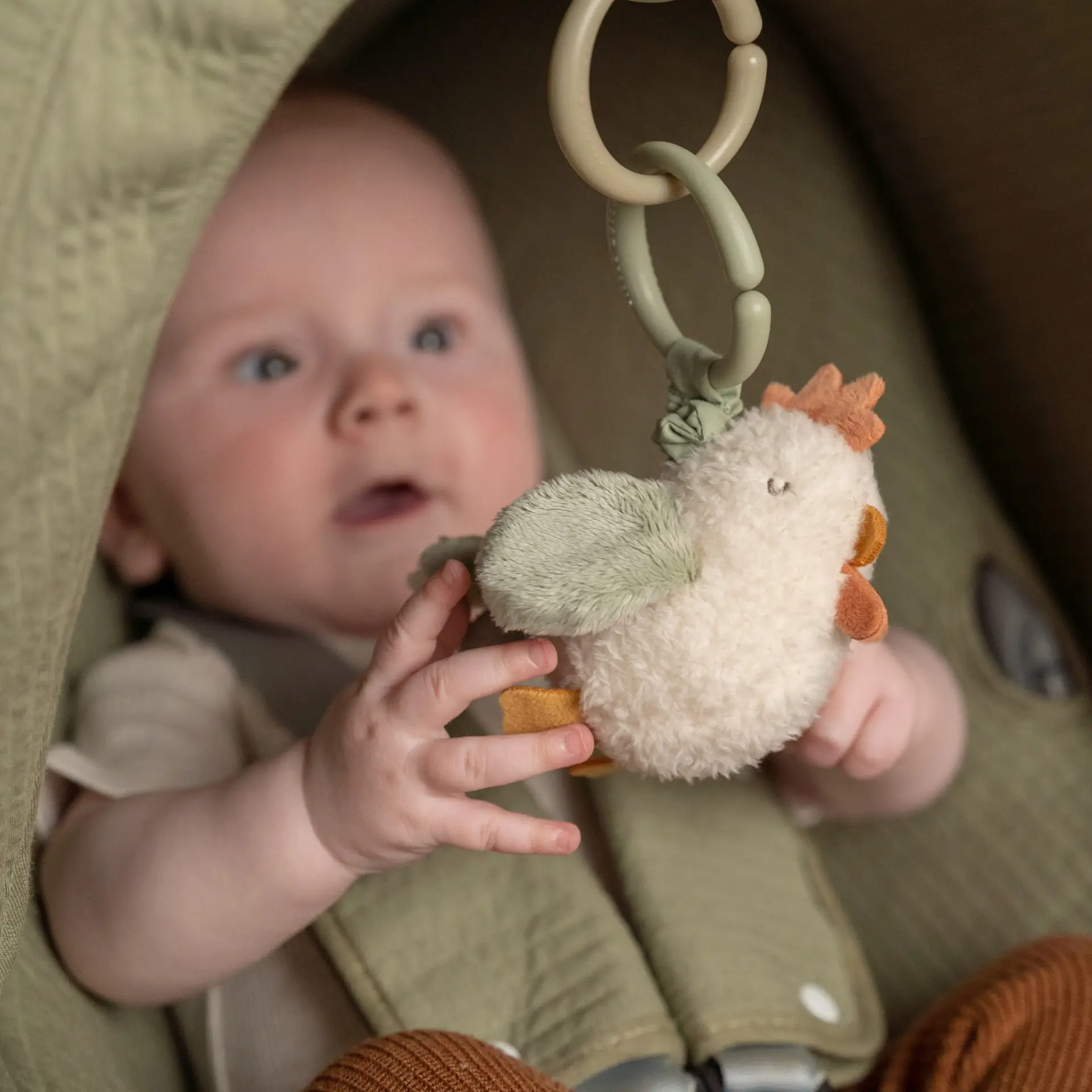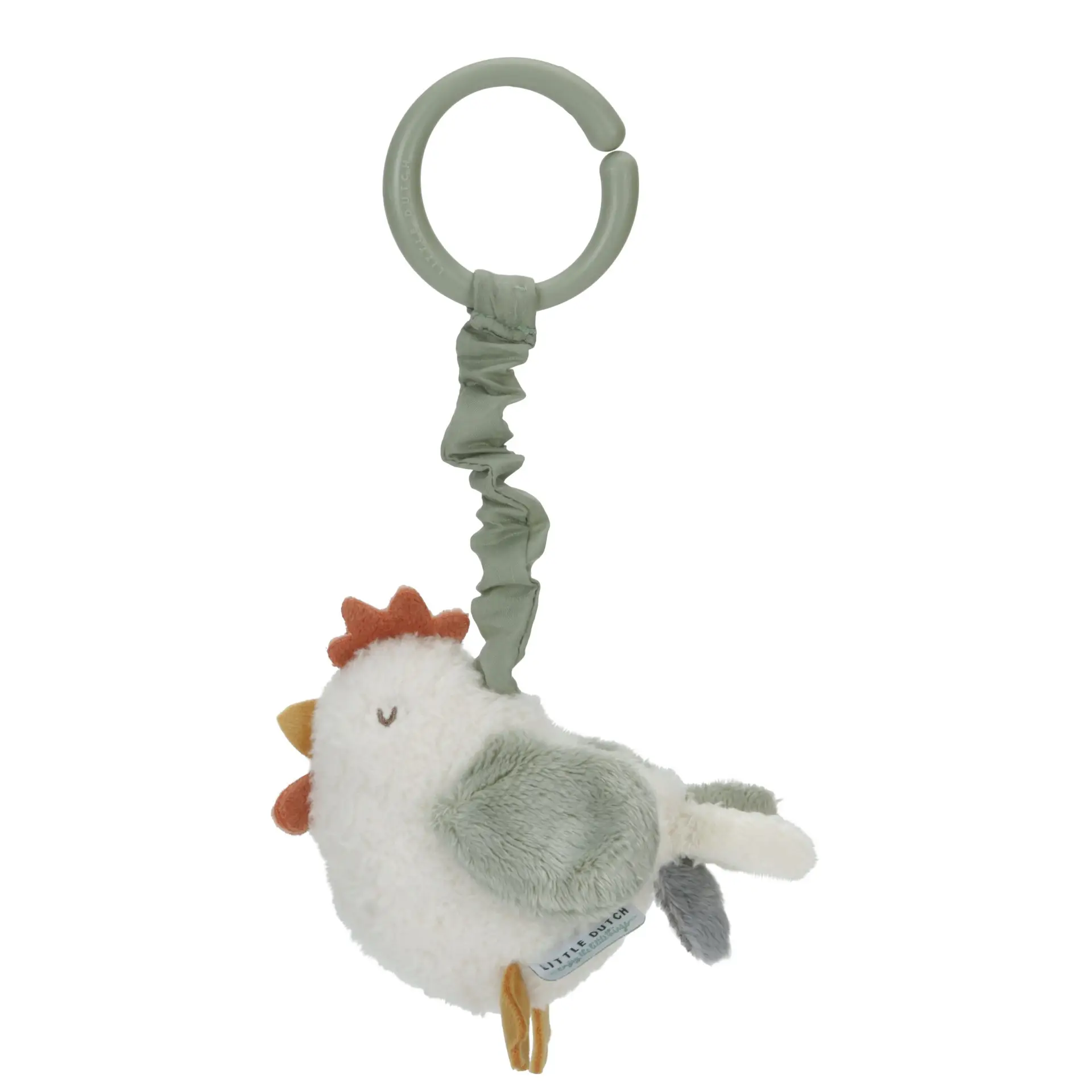 Súper divertida esta gallinita que se sacude cuando tiras de la cuerda. Puedes conectarla fácilmente al cochecito con el anillo conector.