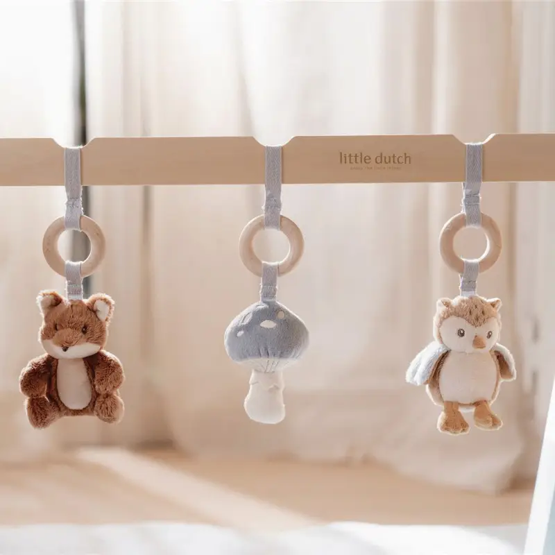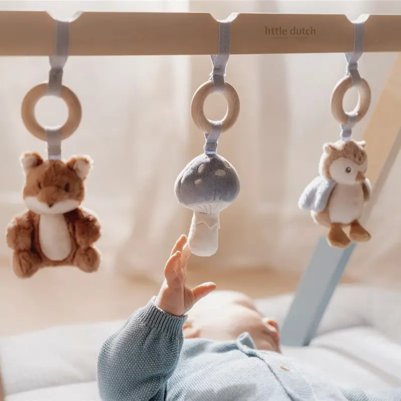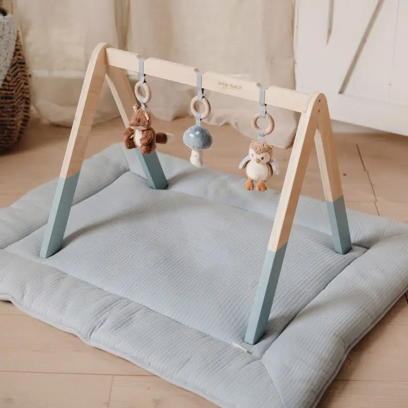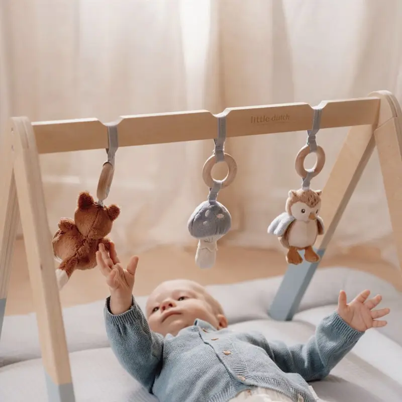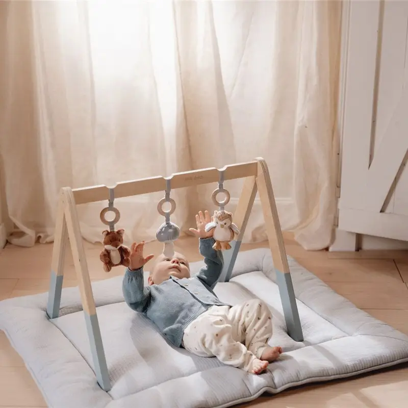 Este gimnasio tiene tres bonitos juguetes, con diferentes texturas y actividades, que animan a los bebés a tocarlos y explorarlos.
